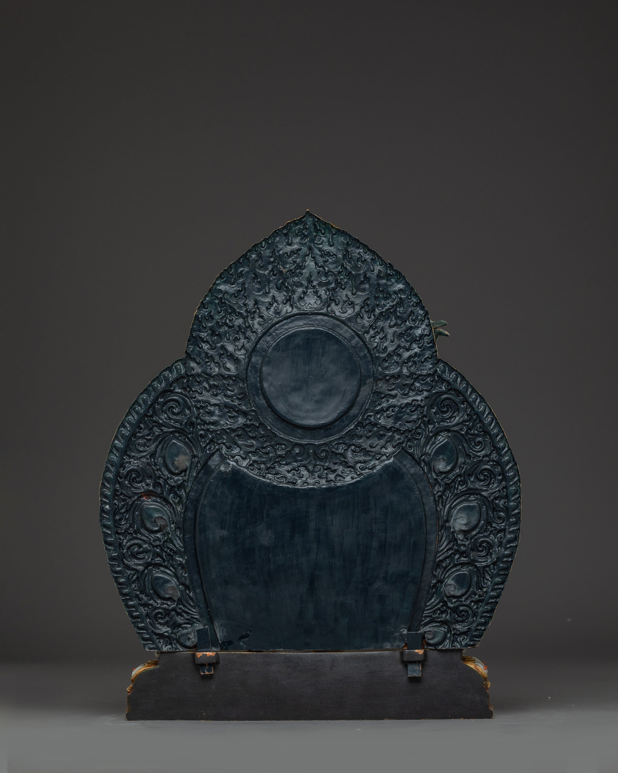 Sacred Tibetan Art of Namtoshe stands at 16.9 inches (43cm) in height, with a base width of 14 inches (35.5cm), and weighs 8.17 kg. Crafted with copper, covered with a triple layer of 24K gold gilding, and carved with deeply engraved carvings that produce a magnificent 3D-like effect.