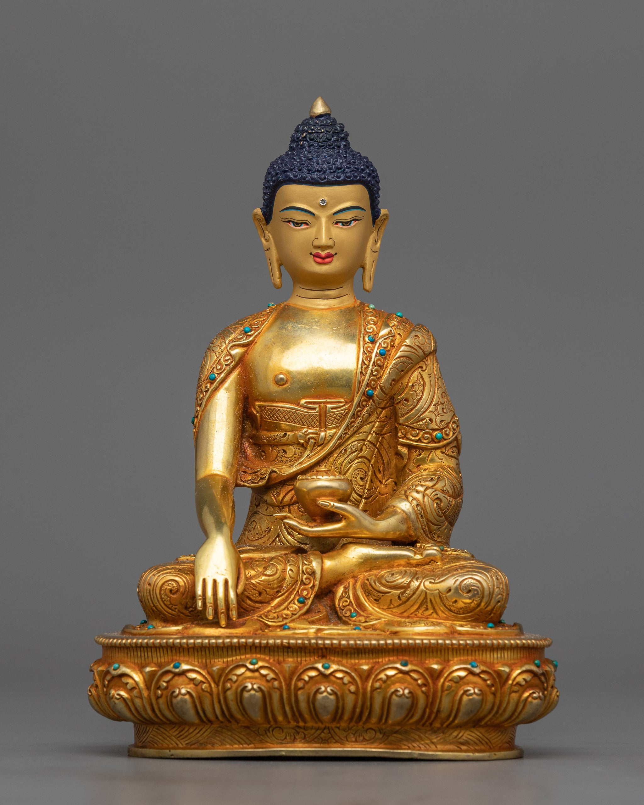 The copper body of the statue is finely plated in 24K gold and further embellished with hand-applied gold and acrylic paintings. This artwork not only highlights Shakyamuni's tranquil and compassionate features, but also lends a sense of elegance and reverence to the image. Shakyamuni Buddha, known as the historical Buddha, is depicted here in his Bodhisattva form, symbolizing his path to enlightenment and the profound teachings he shared with the world.