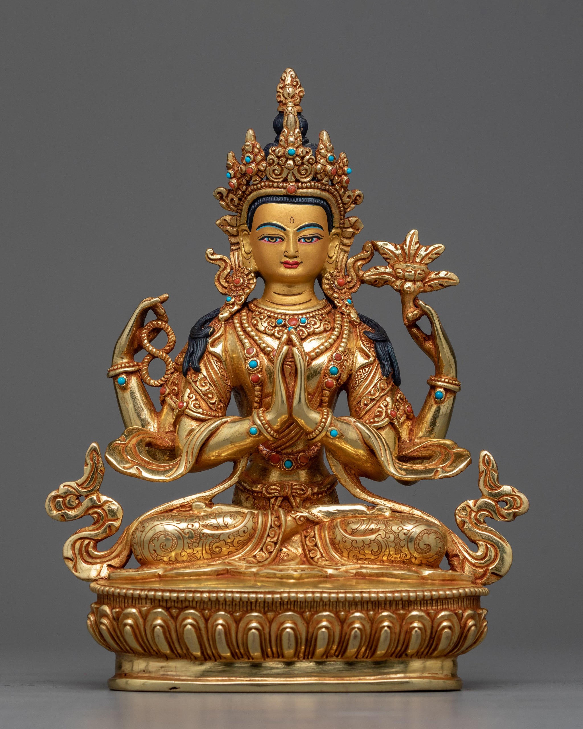 With our Chenrezig Buddha Sculpture, you may welcome the embodiment of unlimited compassion into your area. This exquisite handcrafted sculpture, constructed by talented Nepalese artisans, captures the essence of Chenrezig, the Buddhist tradition's Bodhisattva of Compassion. The finely detailed solid copper body attests to this artwork's craftsmanship and spiritual significance.