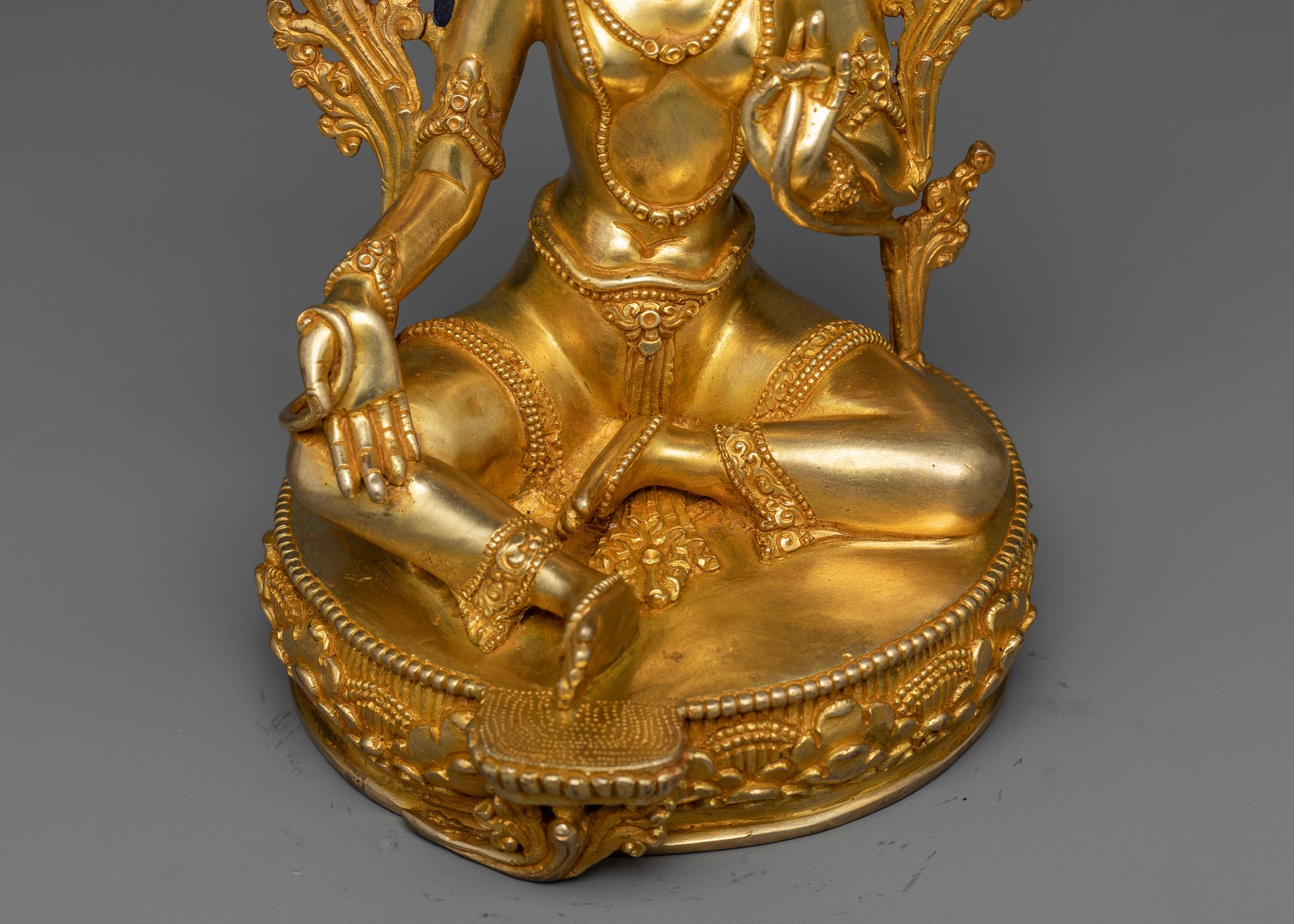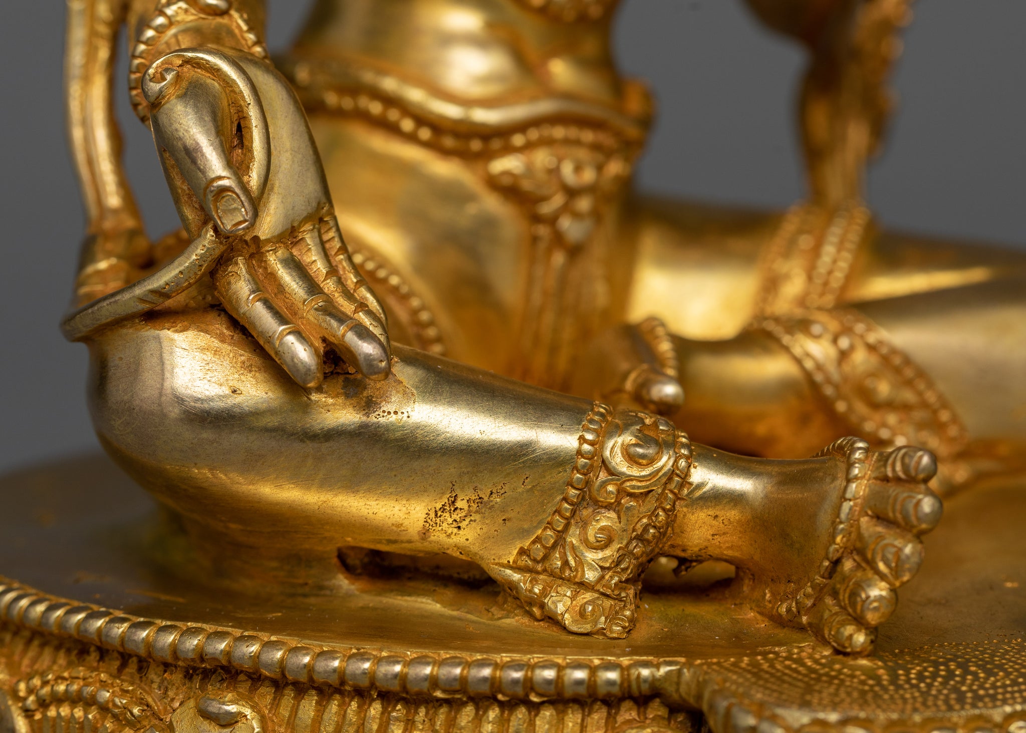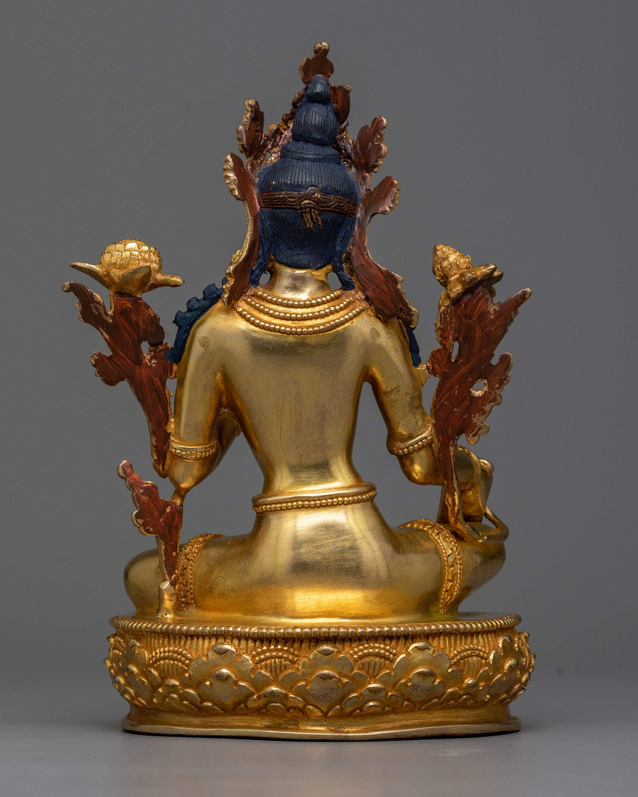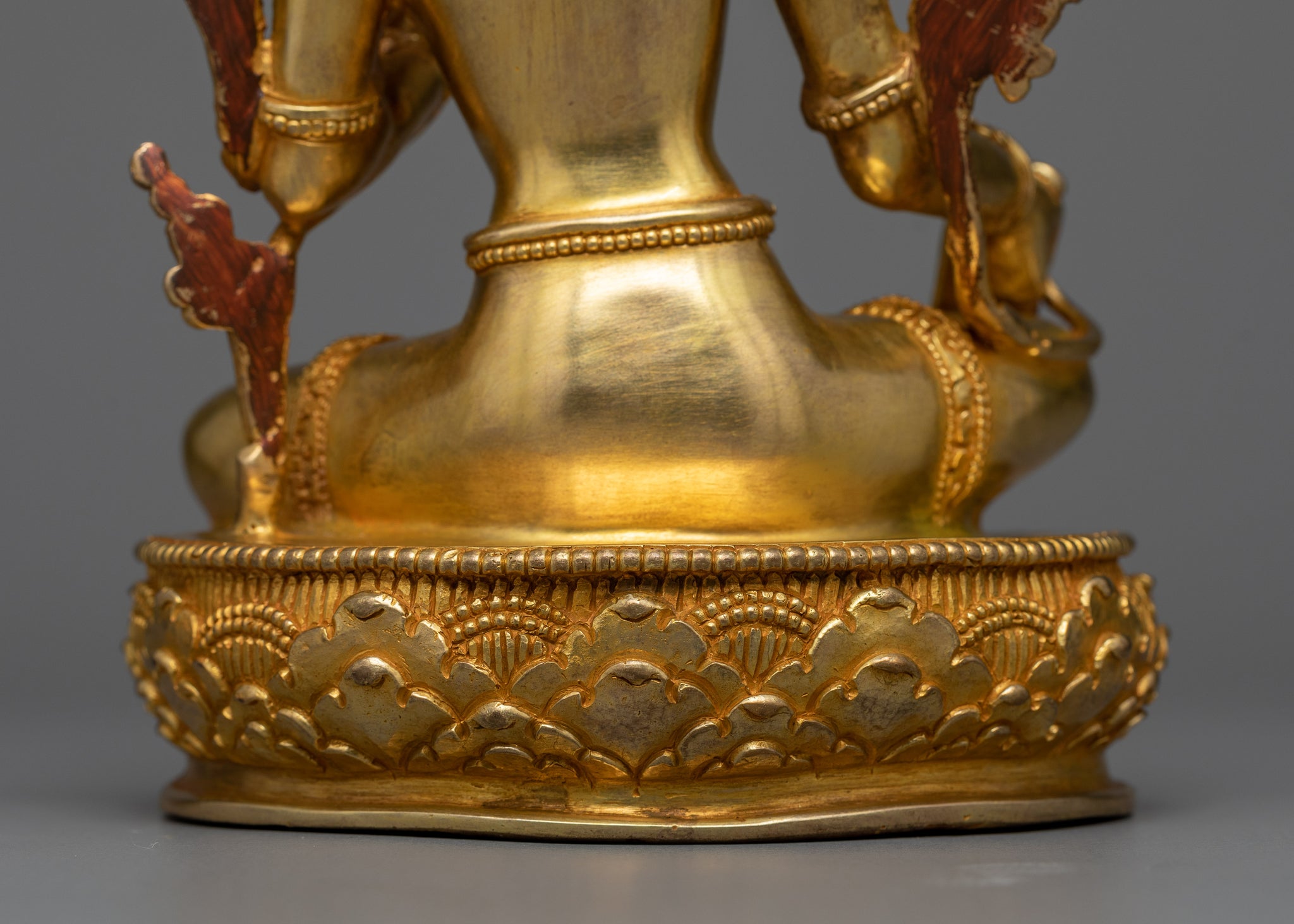 With our Green Tara Buddha Statuette, you can find inner calm and spiritual inspiration. This masterfully made sculpture depicts the serene beauty of Green Tara, the famous female Bodhisattva in Buddhism. The statuette's robust copper body is covered with 24K gold gilding, providing a dazzling, reflective surface that catches both the eye and the heart.