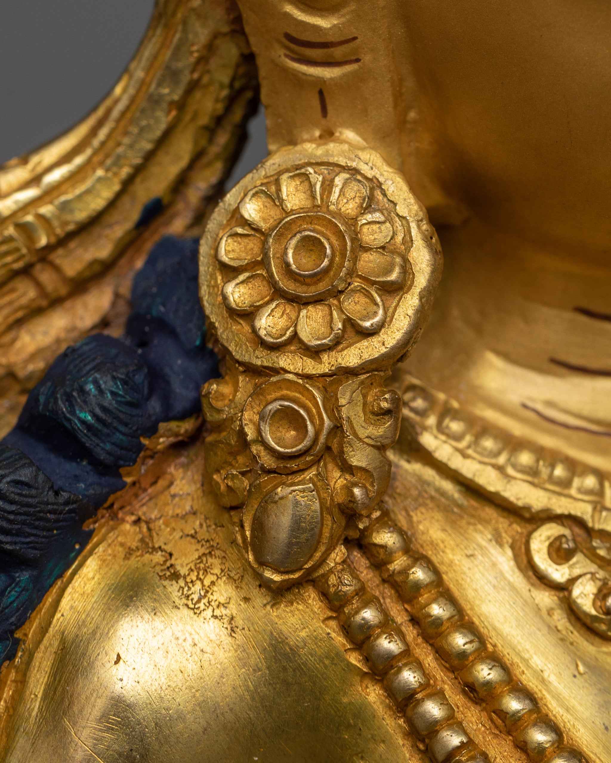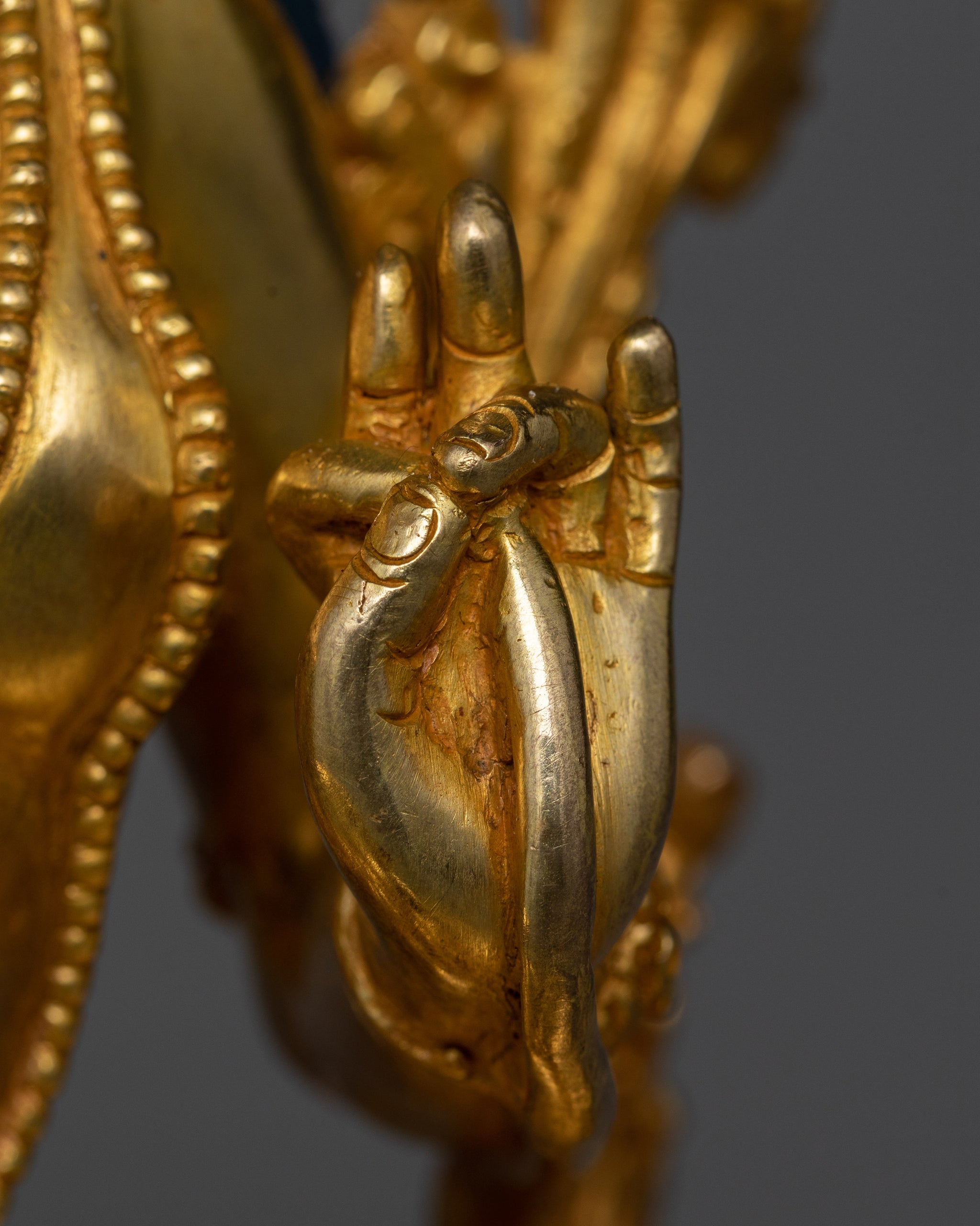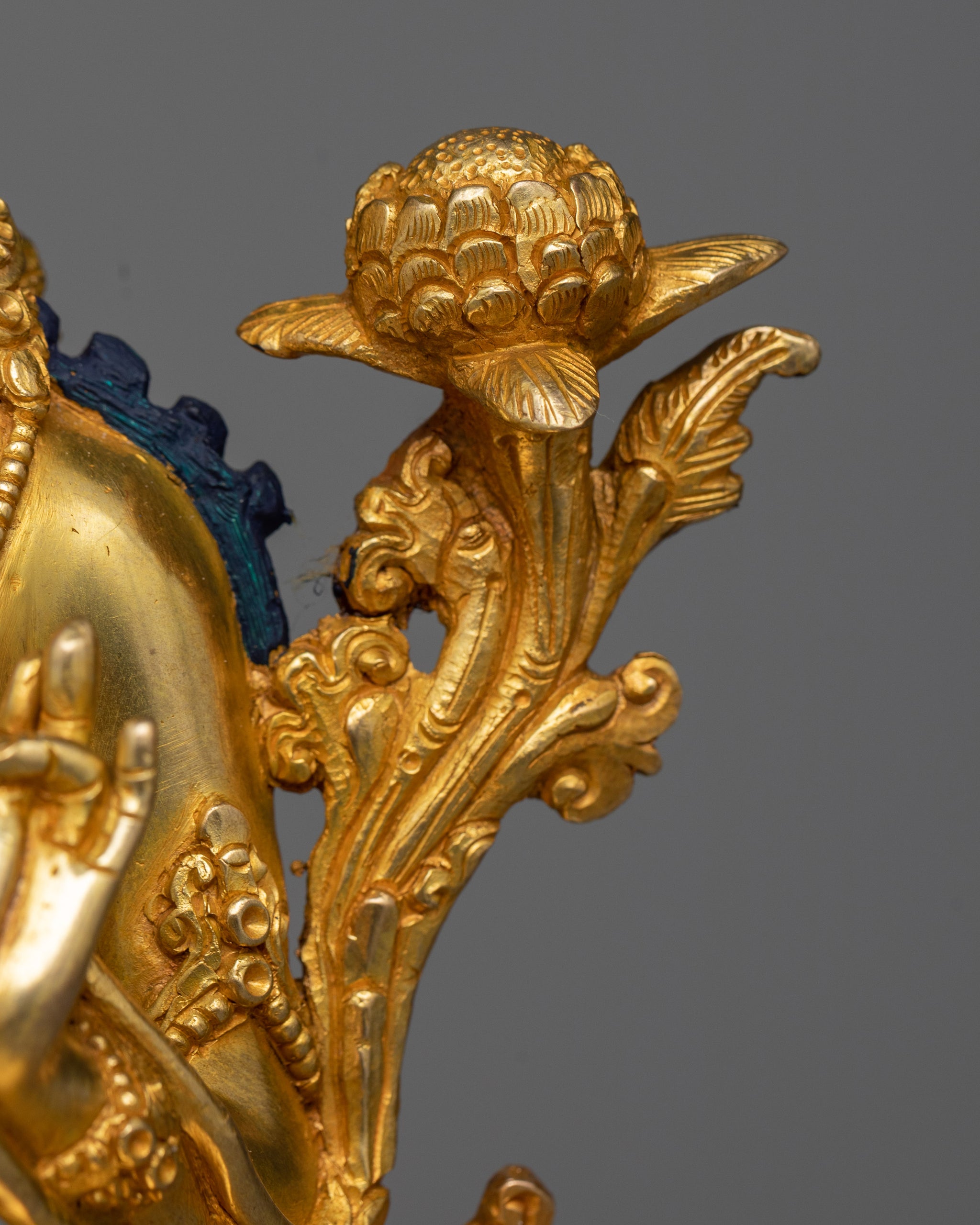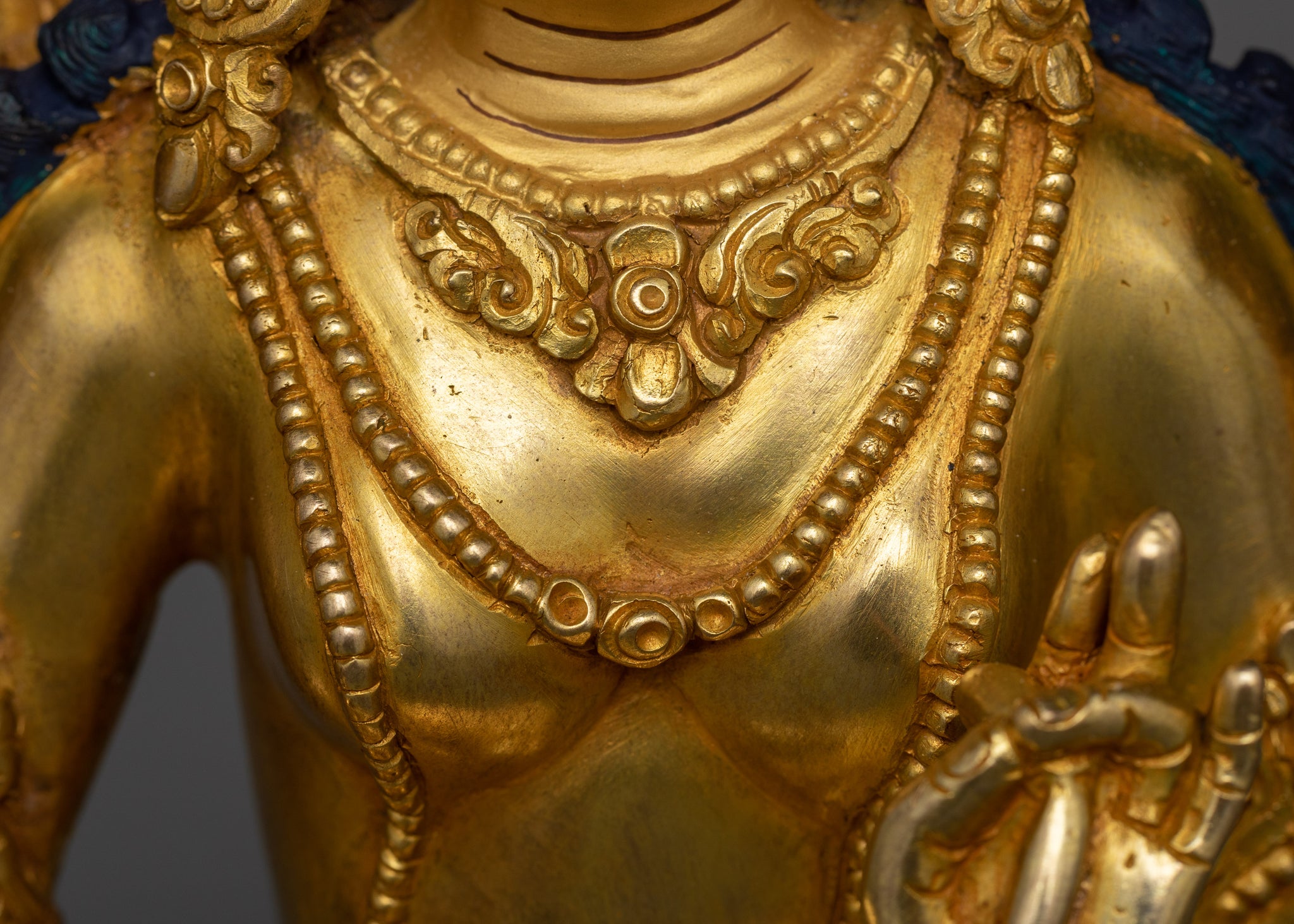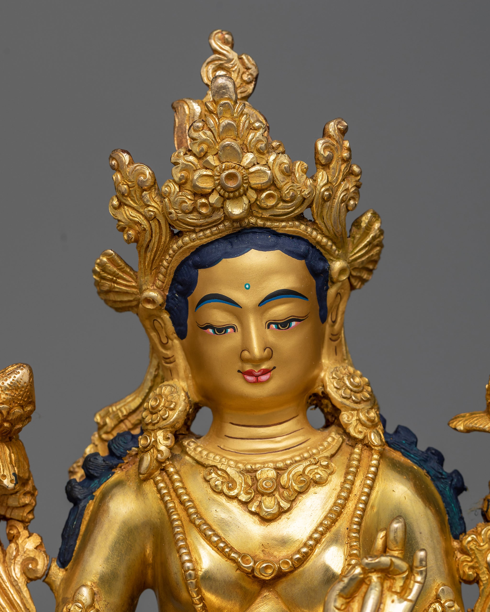 With our Green Tara Buddha Statuette, you can find inner calm and spiritual inspiration. This masterfully made sculpture depicts the serene beauty of Green Tara, the famous female Bodhisattva in Buddhism. The statuette's robust copper body is covered with 24K gold gilding, providing a dazzling, reflective surface that catches both the eye and the heart.