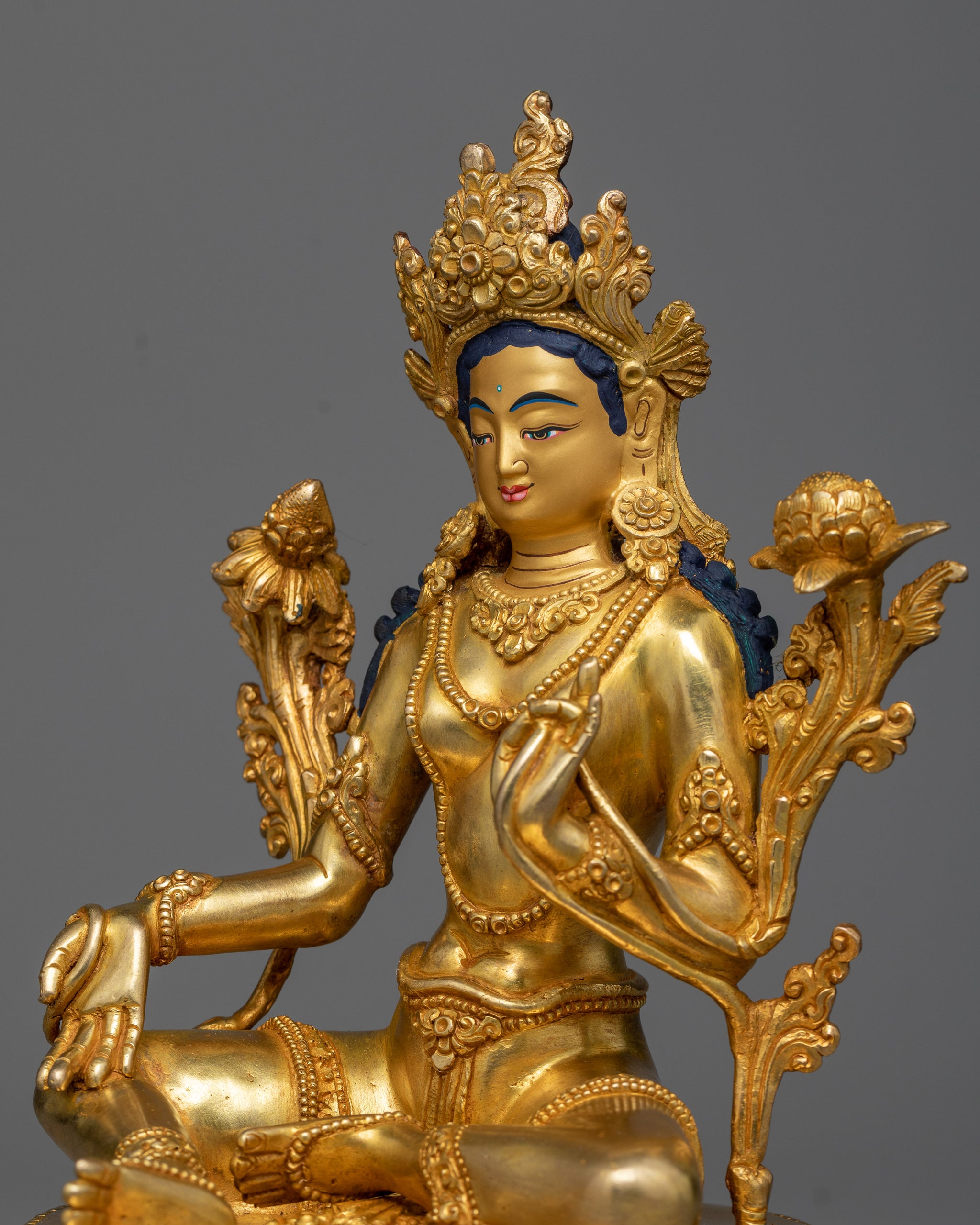 Elegant Green Tara Buddha Statuette in 24K Gold | Nepalese Traditional Artwork