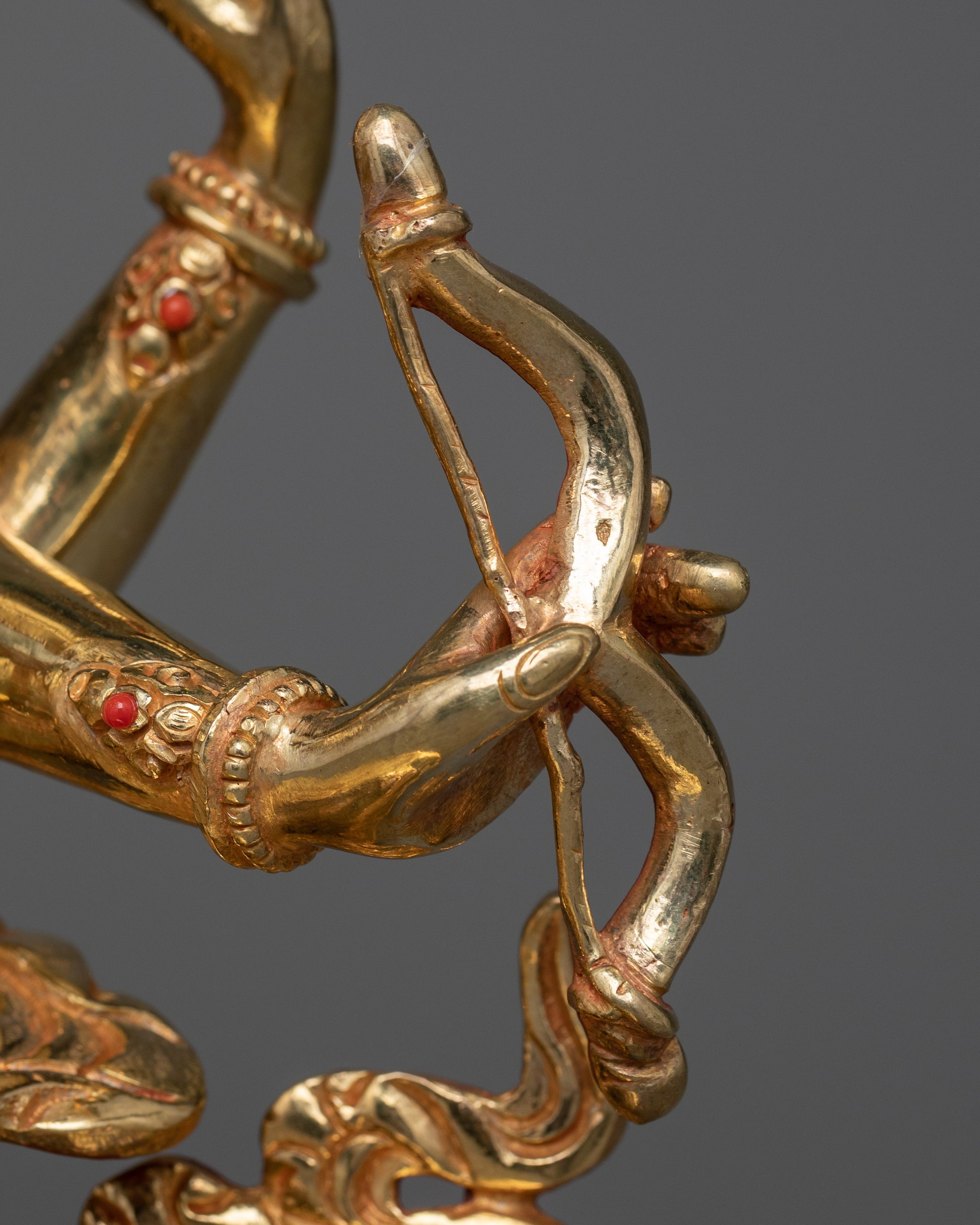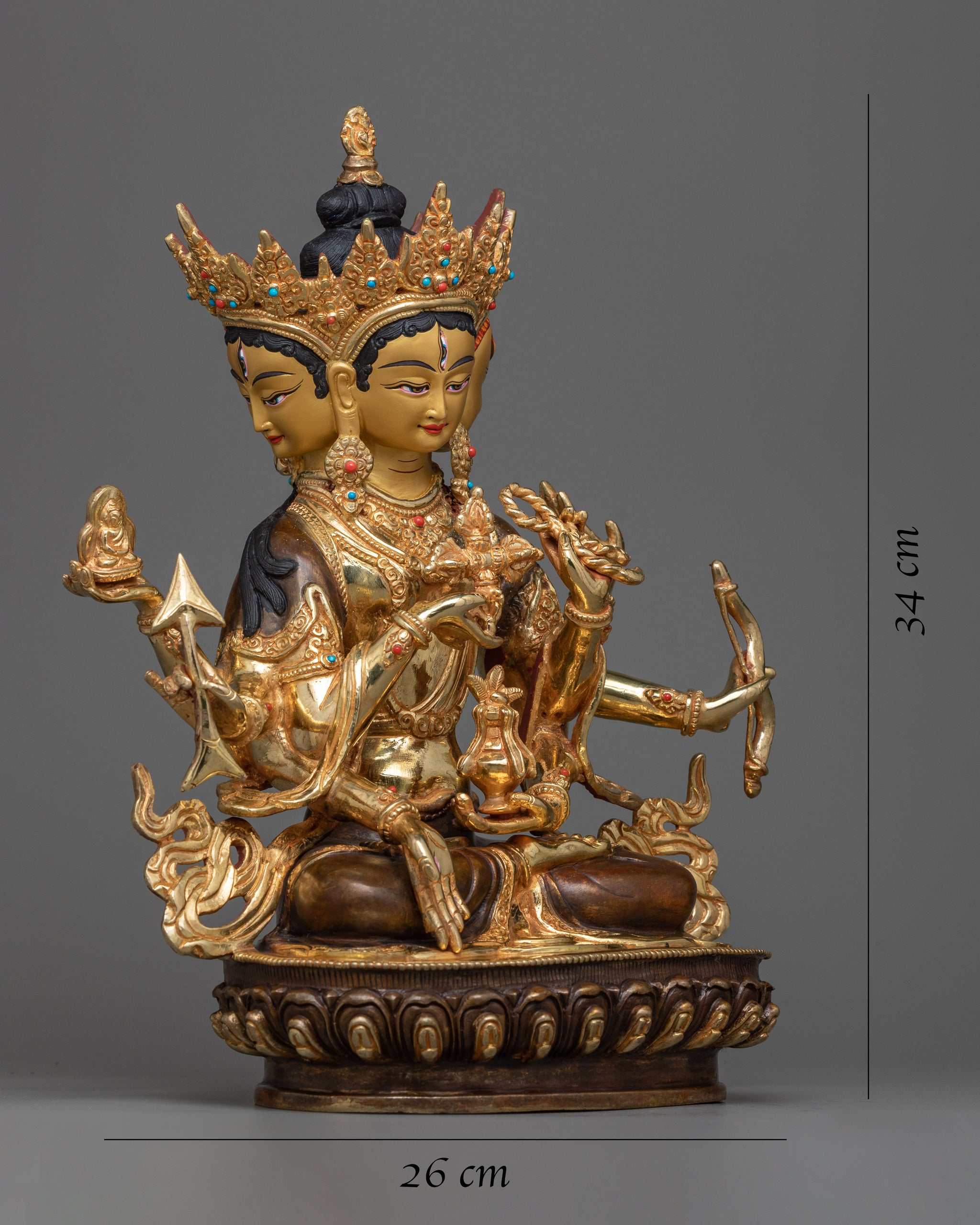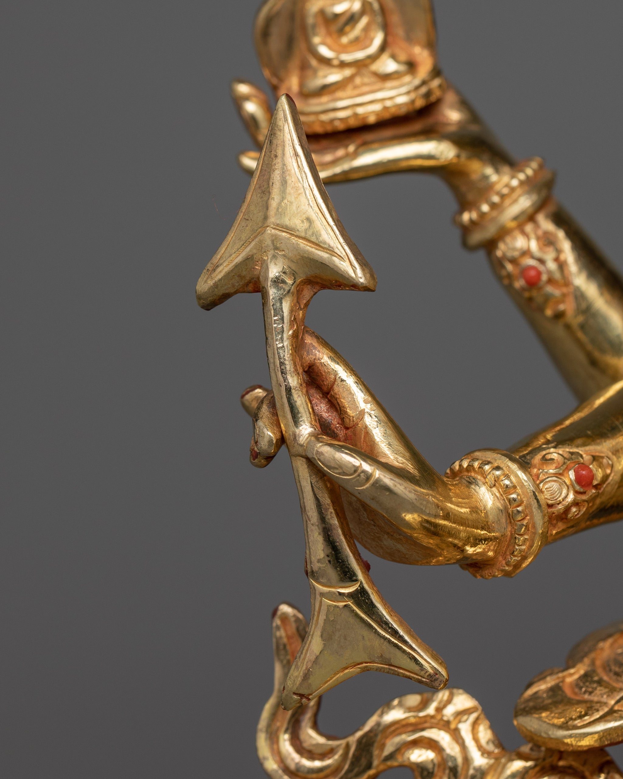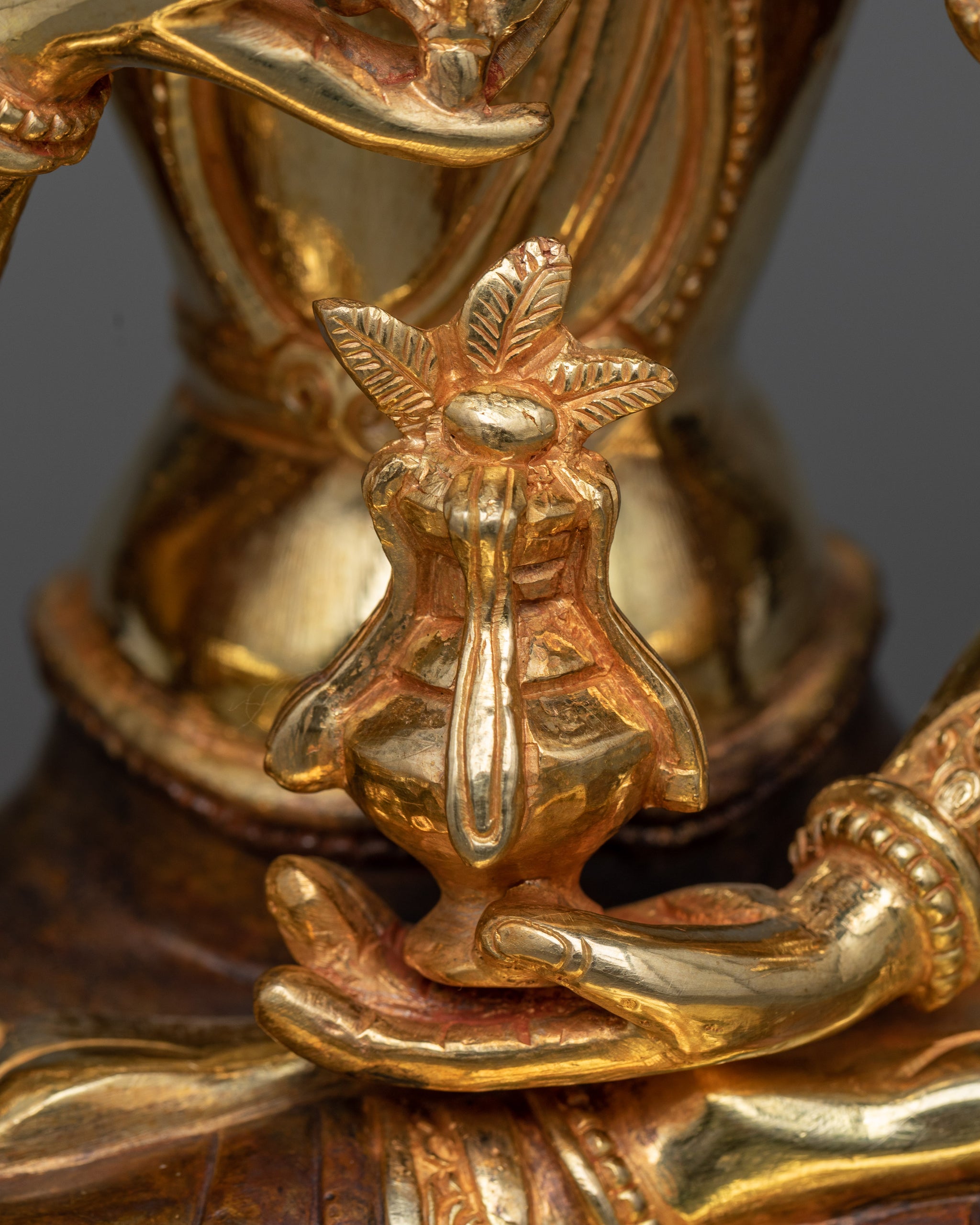 Our Namgyalma Deity Sculpture is a magnificent manifestation of spiritual protection and longevity. This statue stands 13.3 inches tall and is meticulously constructed with an oxidized copper body and 24K gold plating. The gold and acrylic paintings lend elaborate detailing and vitality to Namgyalma's celestial aura.
