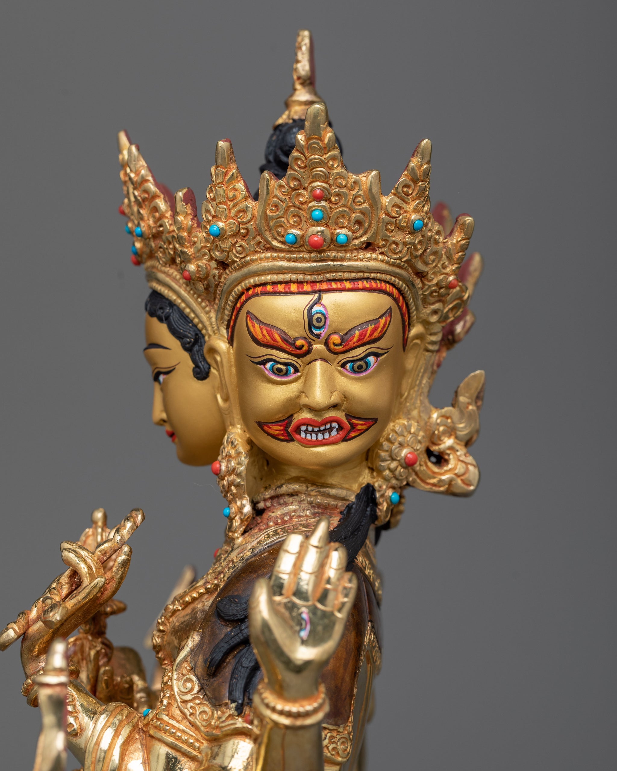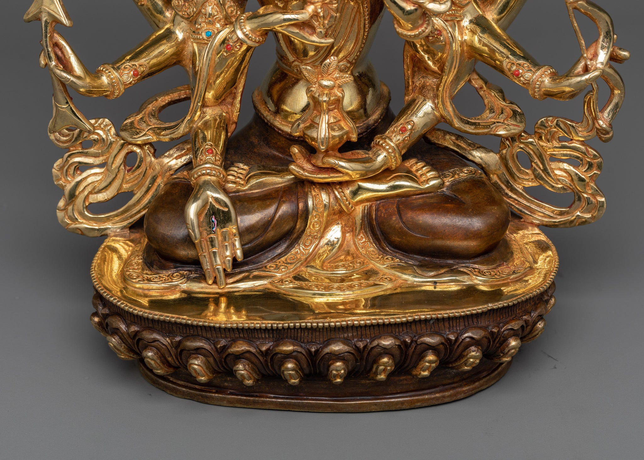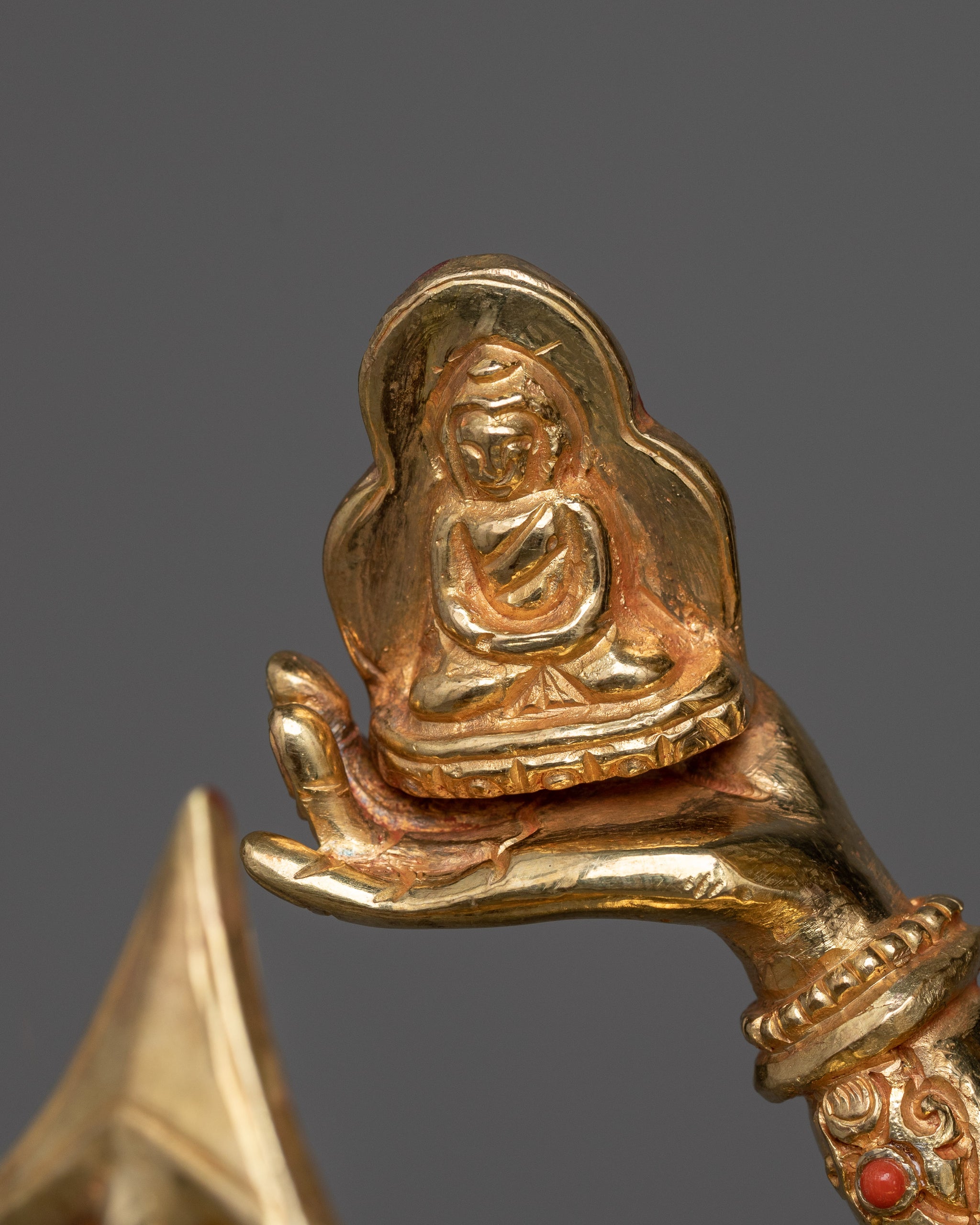 Our Namgyalma Deity Sculpture is a magnificent manifestation of spiritual protection and longevity. This statue stands 13.3 inches tall and is meticulously constructed with an oxidized copper body and 24K gold plating. The gold and acrylic paintings lend elaborate detailing and vitality to Namgyalma's celestial aura.