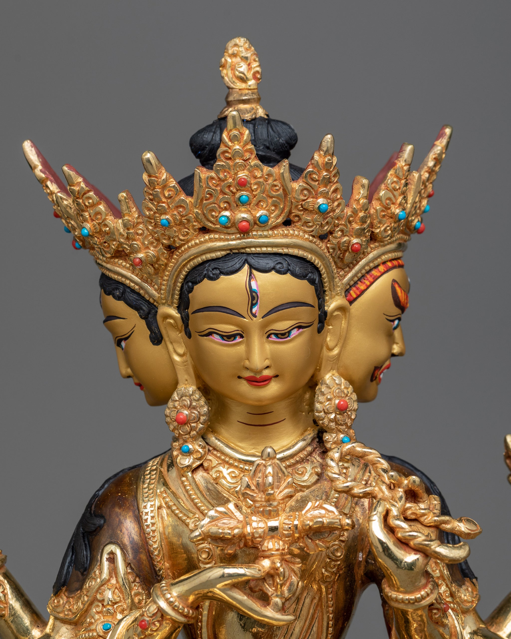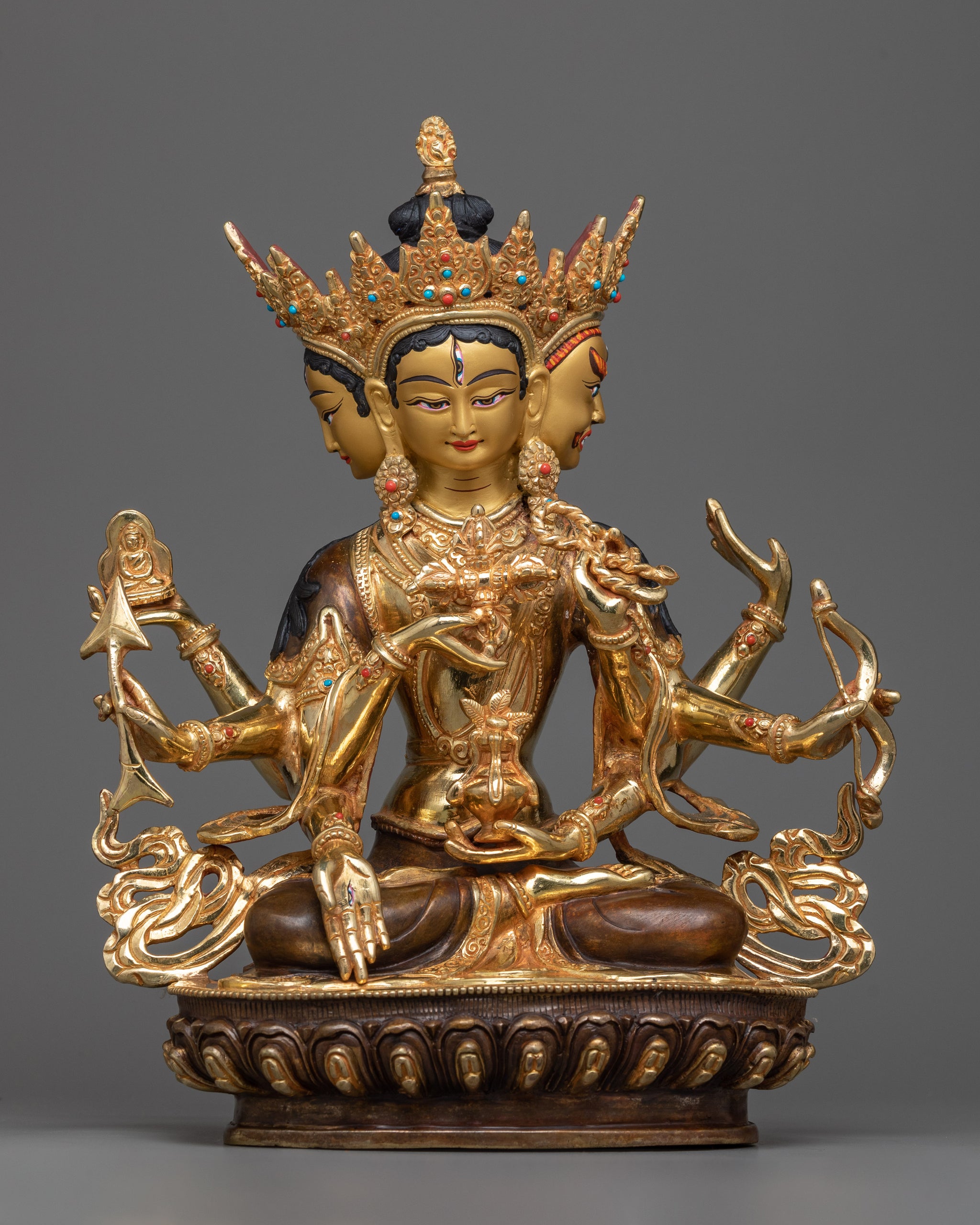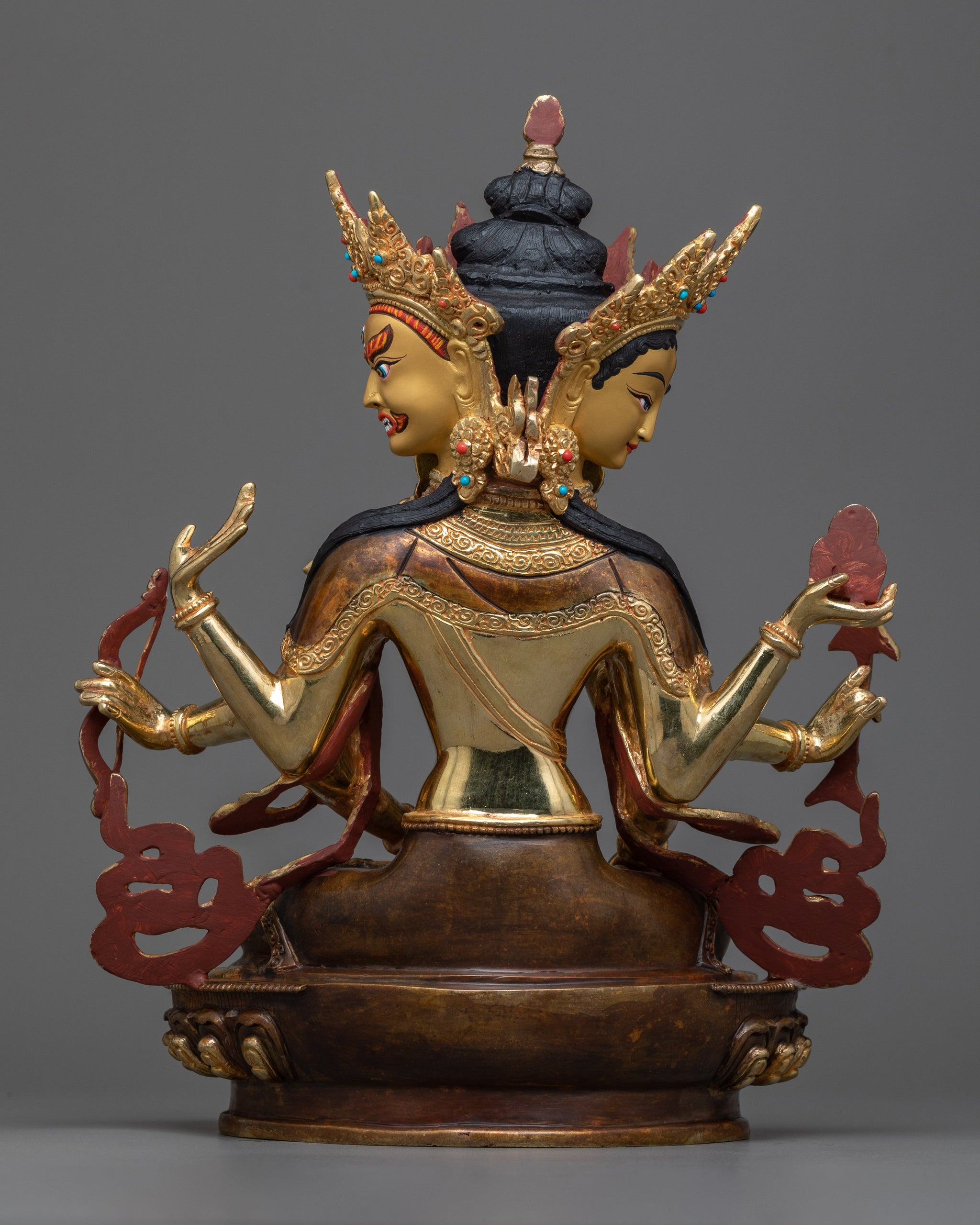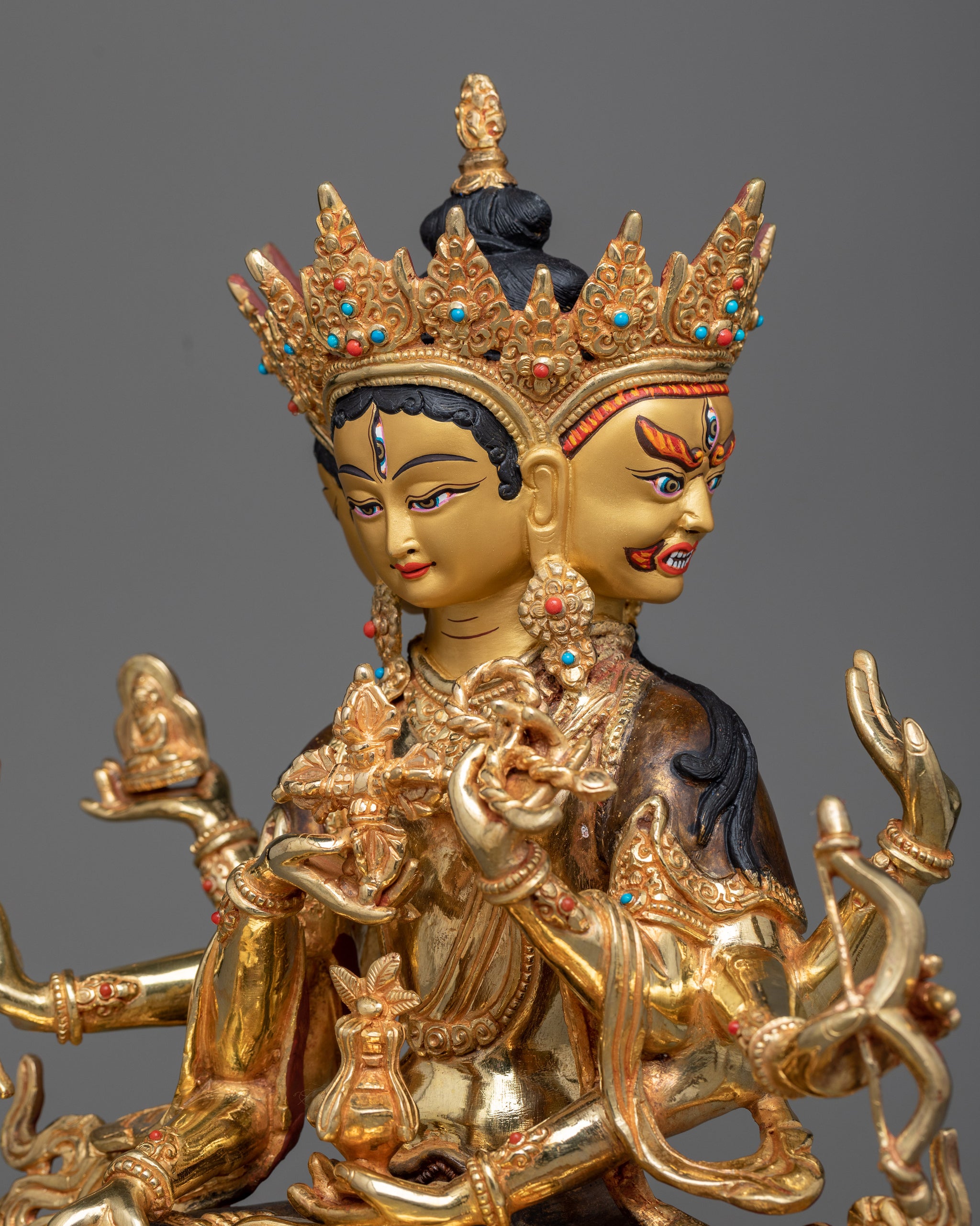 Our Namgyalma Deity Sculpture is a magnificent manifestation of spiritual protection and longevity. This statue stands 13.3 inches tall and is meticulously constructed with an oxidized copper body and 24K gold plating. The gold and acrylic paintings lend elaborate detailing and vitality to Namgyalma's celestial aura.