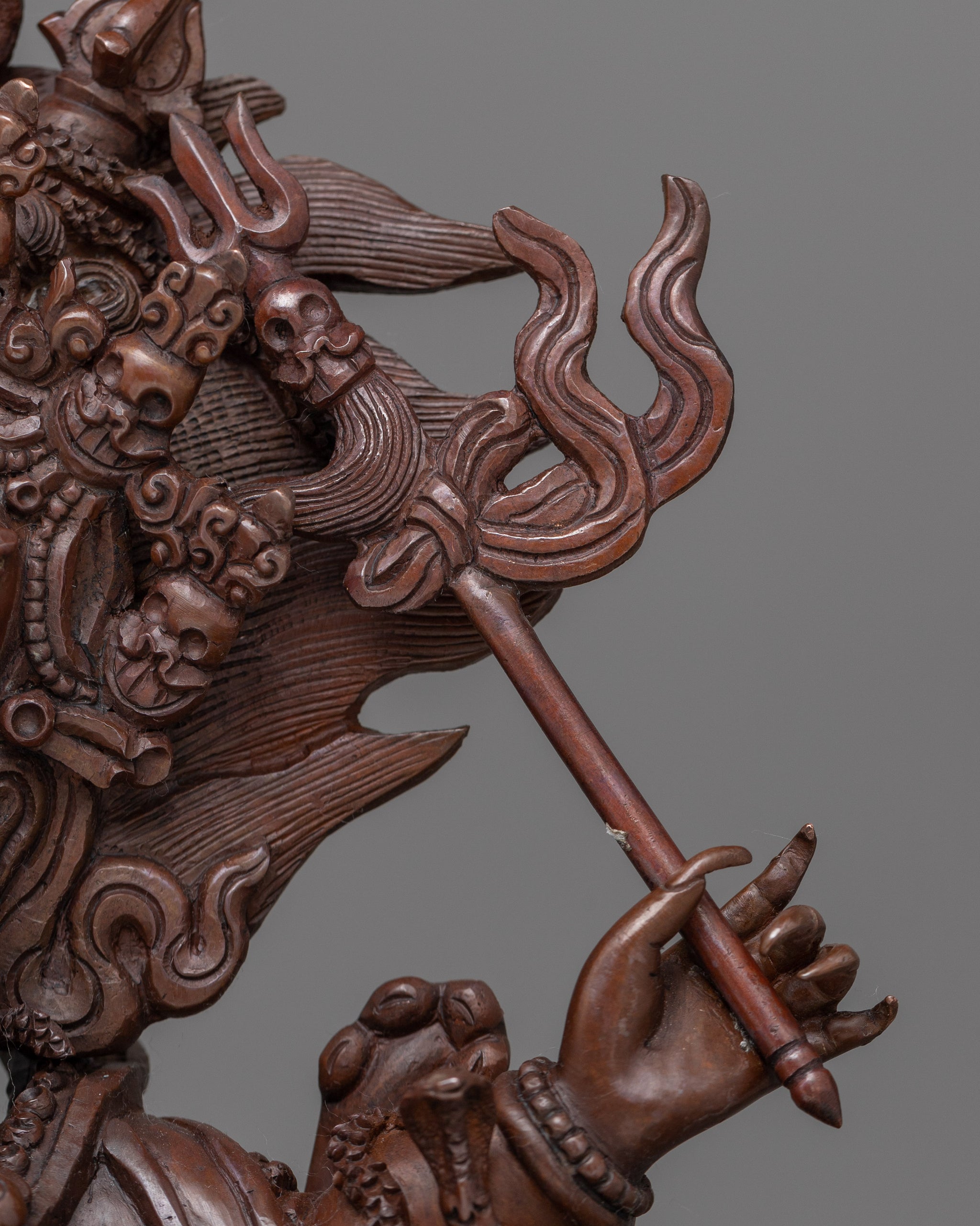 The six-armed Mahakala, a wrathful deity in Tibetan Buddhism, is represented here, indicating his position as a strong guardian against negative energies and spiritual barriers. This sculpture represents Mahakala's dynamic and forceful character, with meticulous details that bring his furious expression and symbolic traits to life. The oxidized finish adds depth and character to the statue, enhancing the sense of timelessness and spiritual power it embodies.