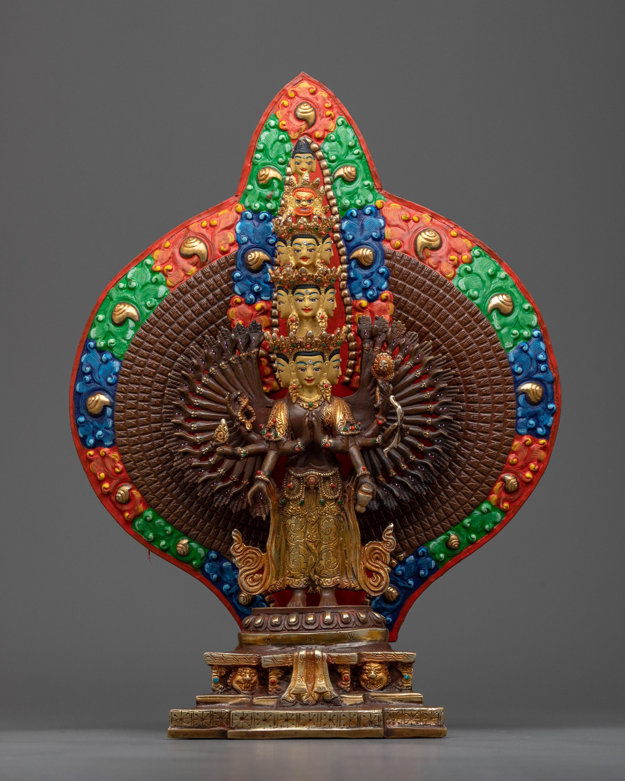 The 1000-Armed Avalokiteshvara Sculpture will transport you to the heart of compassion and mercy. This magnificent work, skillfully produced on oxidized copper, features a sublime interplay of shadows and light, accentuated by bright 24K gold plating. The gold and acrylic paintings bring out the details, encapsulating Avalokiteshvara's soul, making it a statement of artistry as well as spiritual reverence.