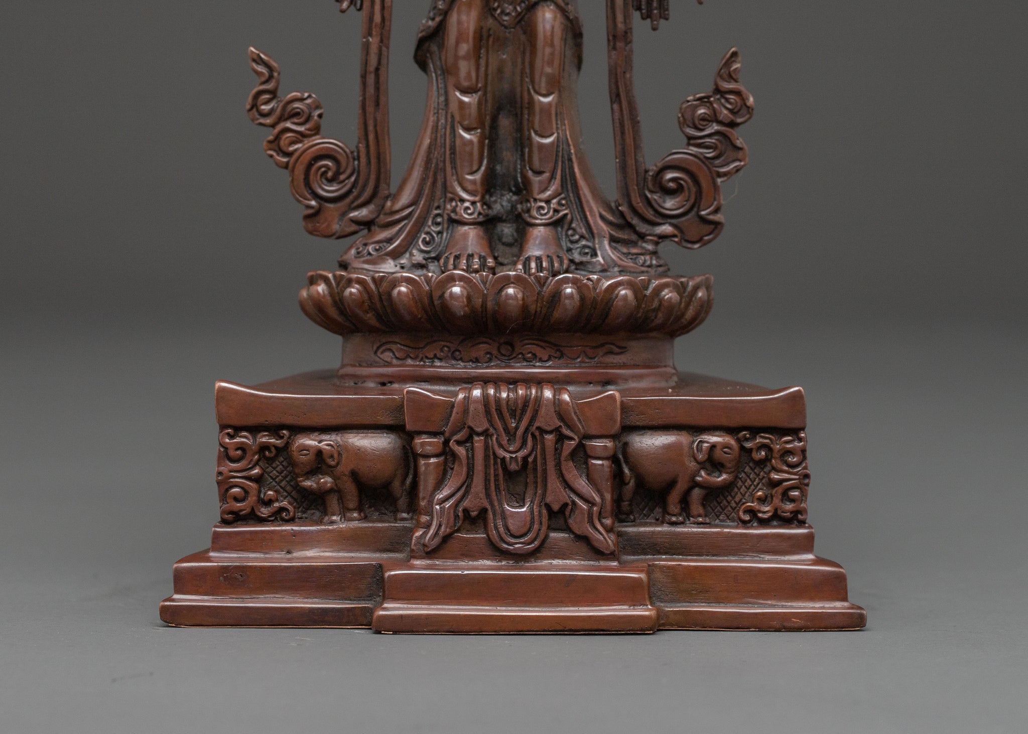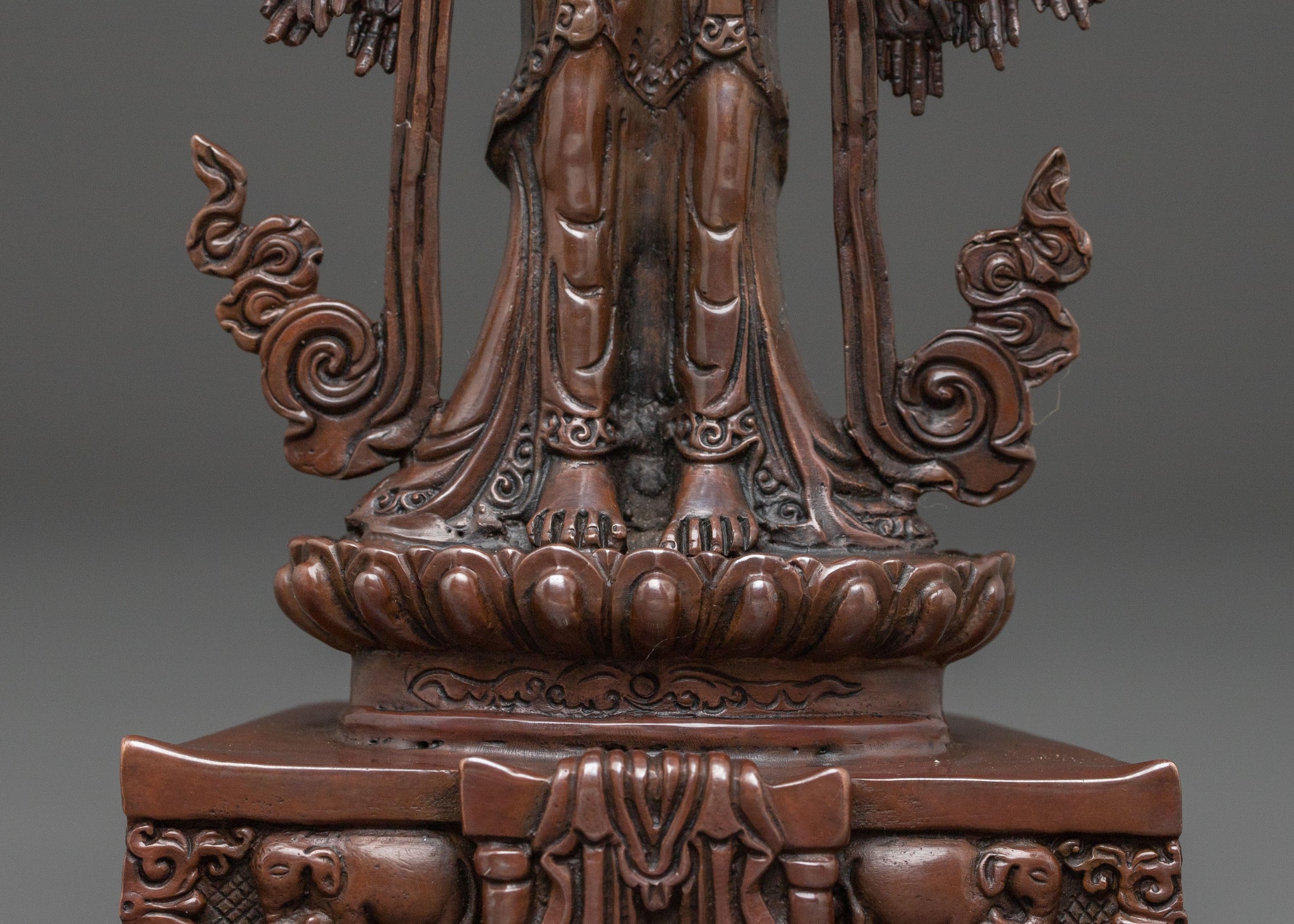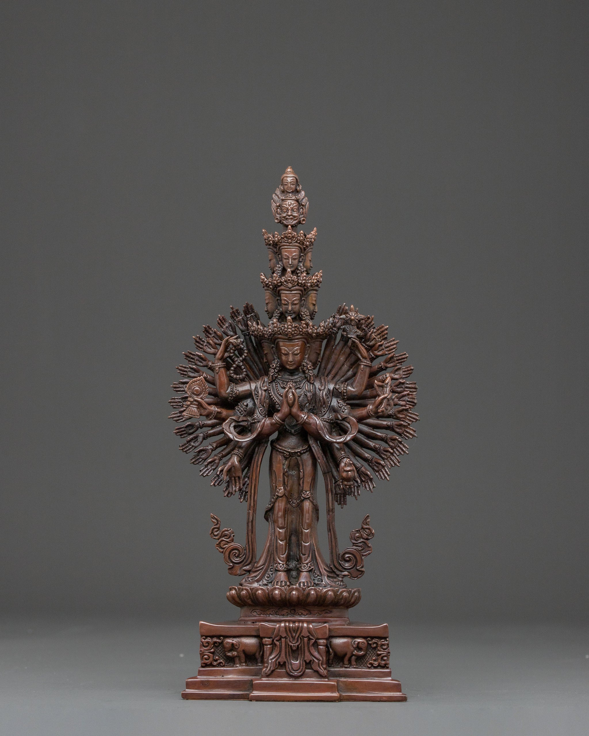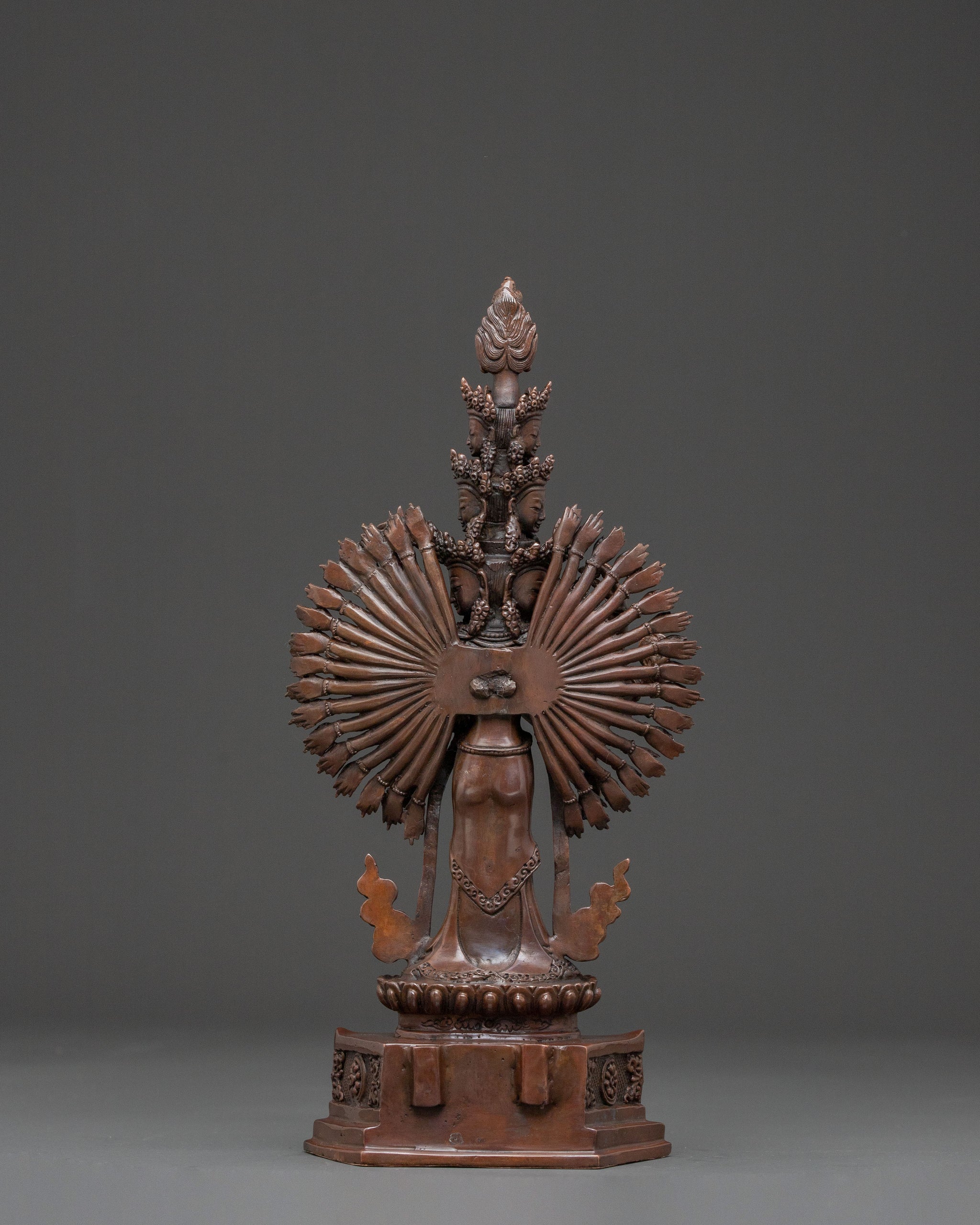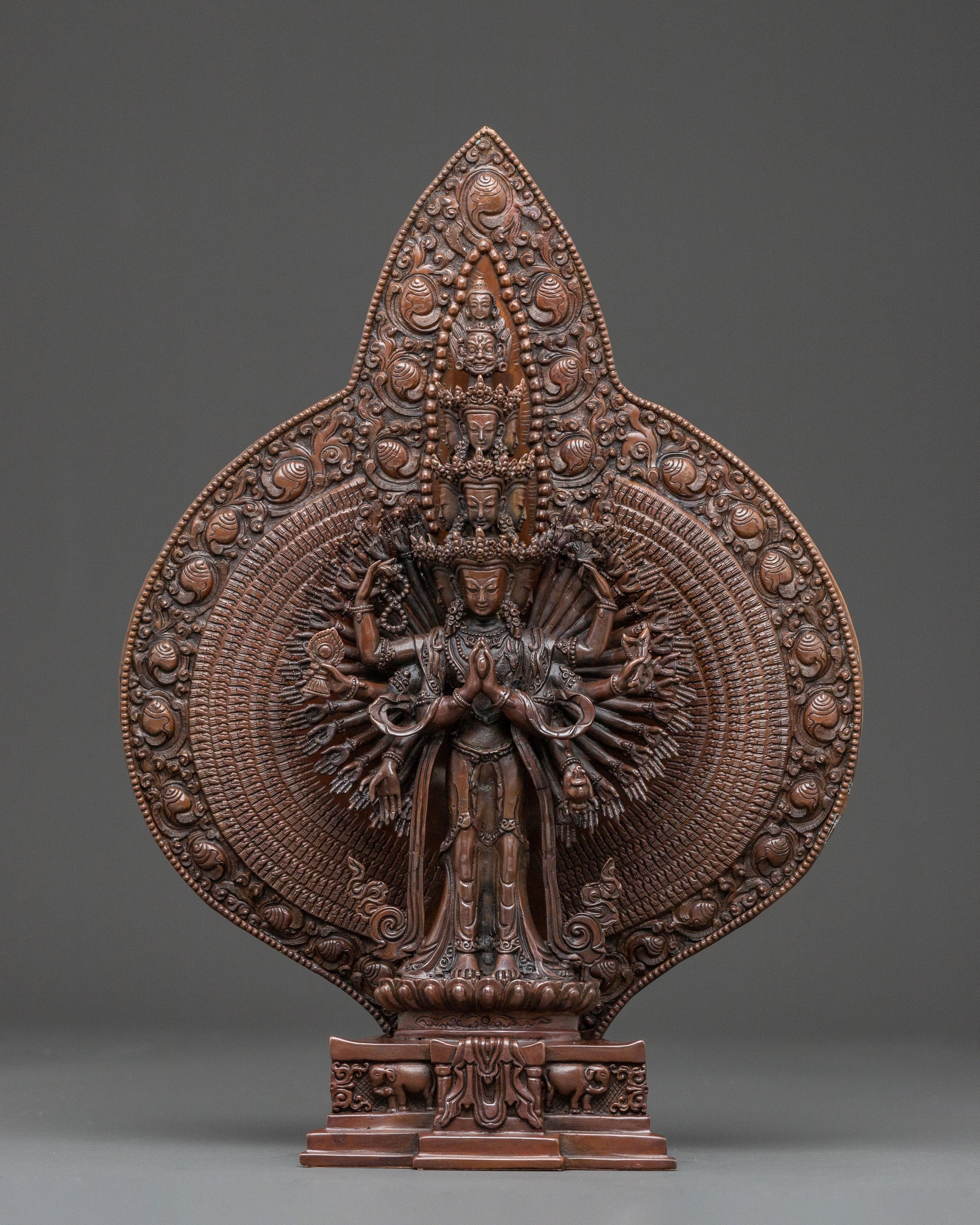 A majestic 1000-armed Chenrezig handcrafted statue stands as a profound symbol of universal compassion. Standing at 13.2 inches tall with a wide 9.6-inch base, this substantial figure is meticulously formed from oxidized copper. Its intricate form radiates a powerful yet gentle aura of enlightened benevolence, inviting deep spiritual reflection into any space. Each curve and detail of this copper Buddhist art piece reflects generations of expertise from skilled artisans in Nepal, with deeply engraved carvings that produce a magnificent 3D-like effect, enhancing its beauty and spiritual depth.