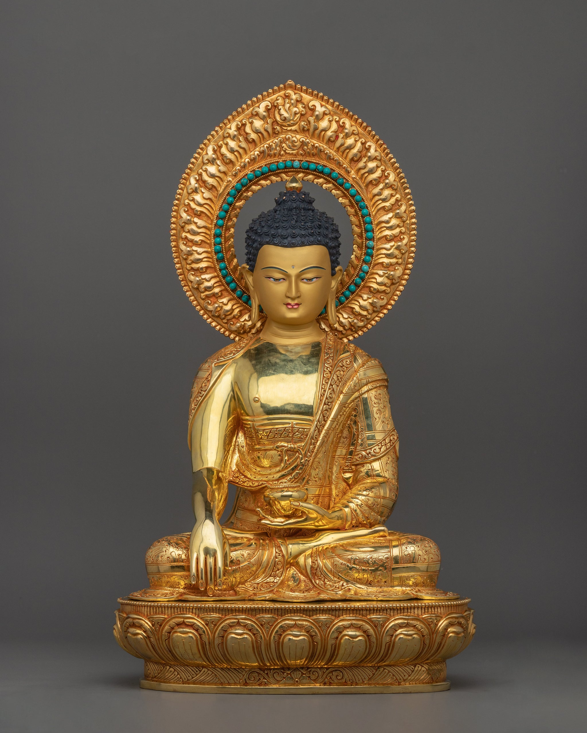 This 19.7-inch Shakyamuni Buddha statue is a masterful example of Himalayan craftsmanship, made of copper, covered with a triple layer of 24K gold gilding, and carved with deeply engraved carvings that produce a magnificent 3D-like effect. Seated in the earth-touching mudra. This statue measures 19.7”/50 cm (Height) x 11.8”/30 cm (Base), with a weight of 7.69 kg. This sculpture, adorned with hand-carved gemstones, handcrafted by expert Nepalese artisans, elegantly symbolizes Himalayan Buddhism's sacred traditions, making it an appropriate addition to altars, meditation places, or sacred collections.