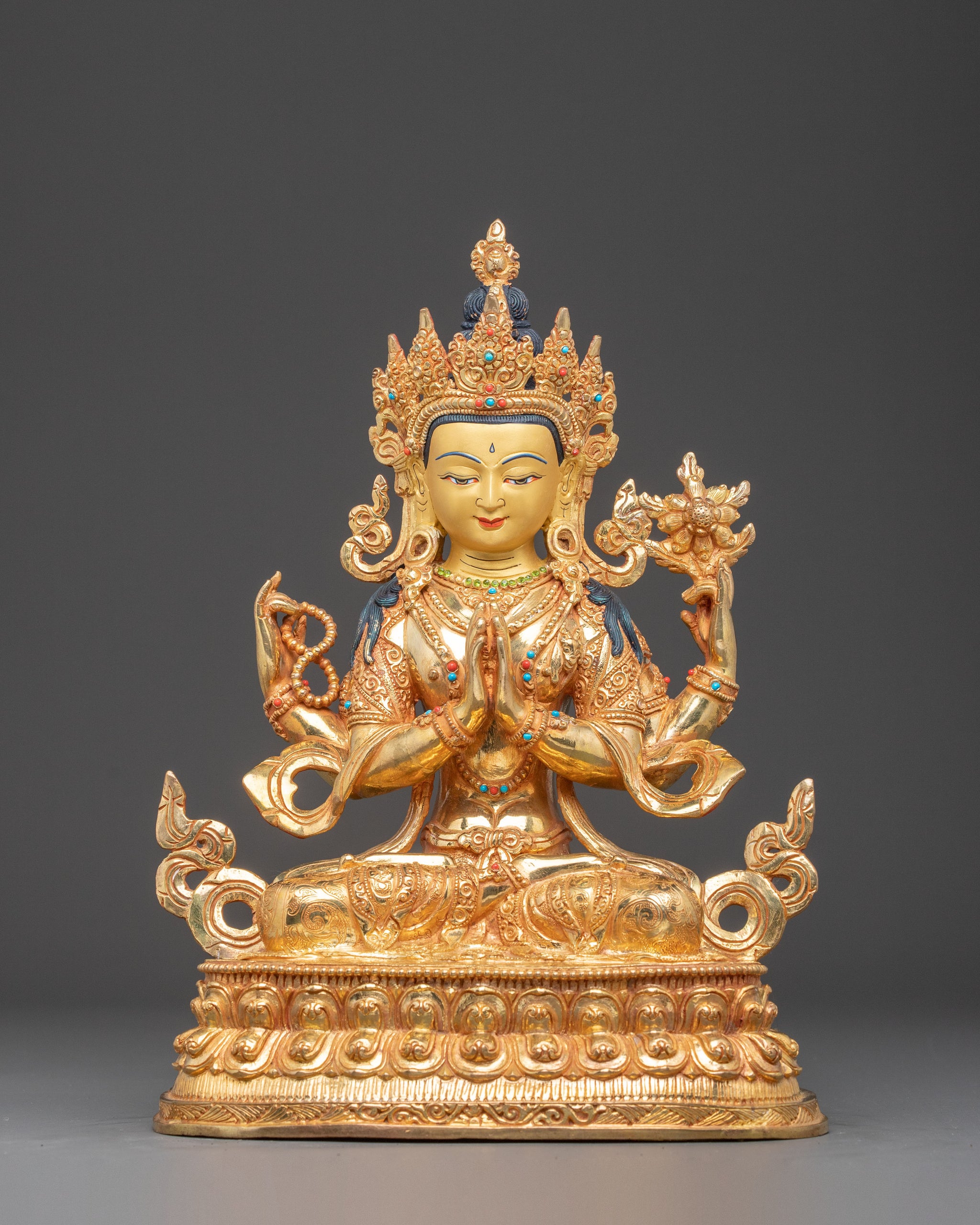 Golden 24K Gold Gilded Chenrezig, Handmade Statue | Buddhist Sculpture for Altar Decor