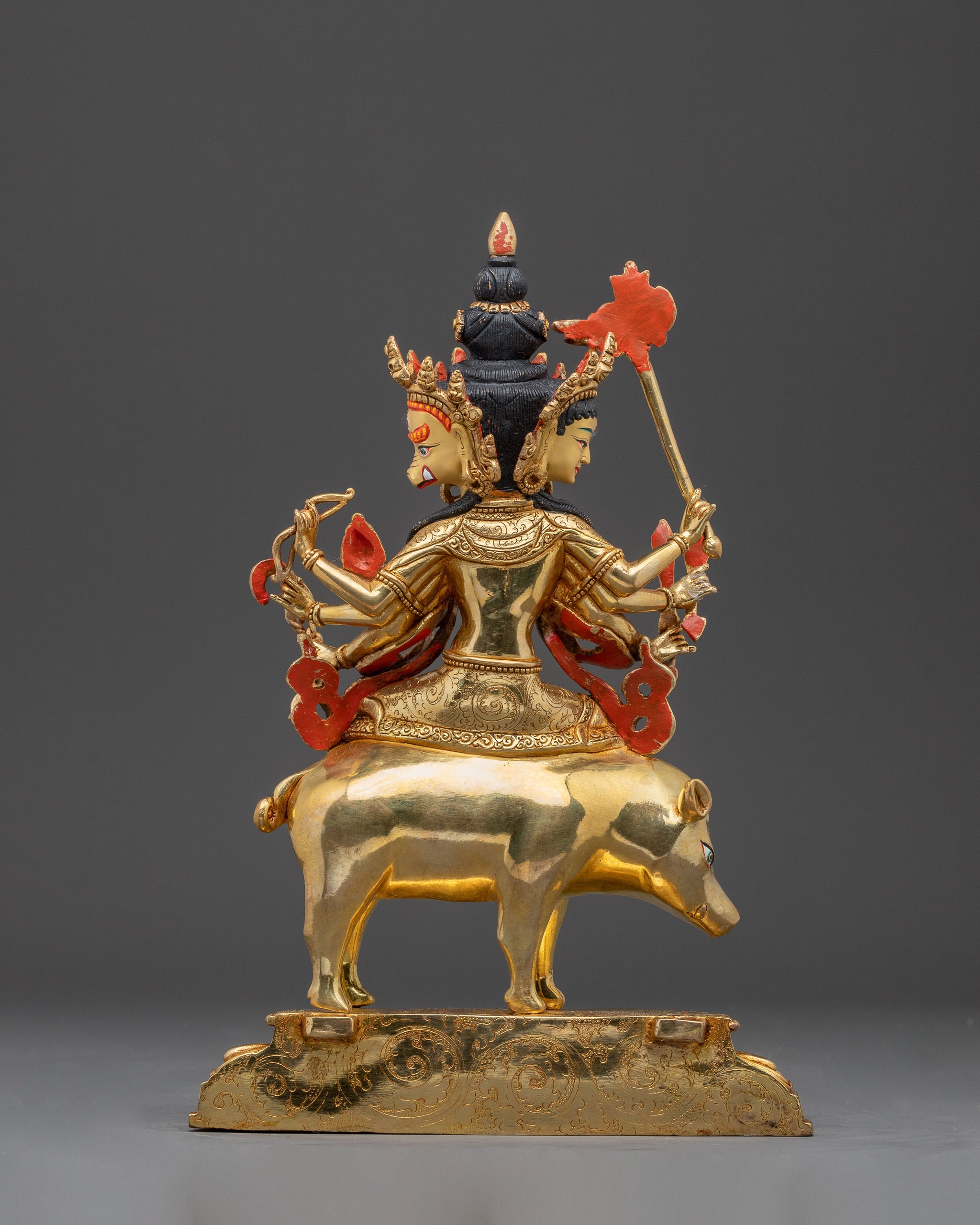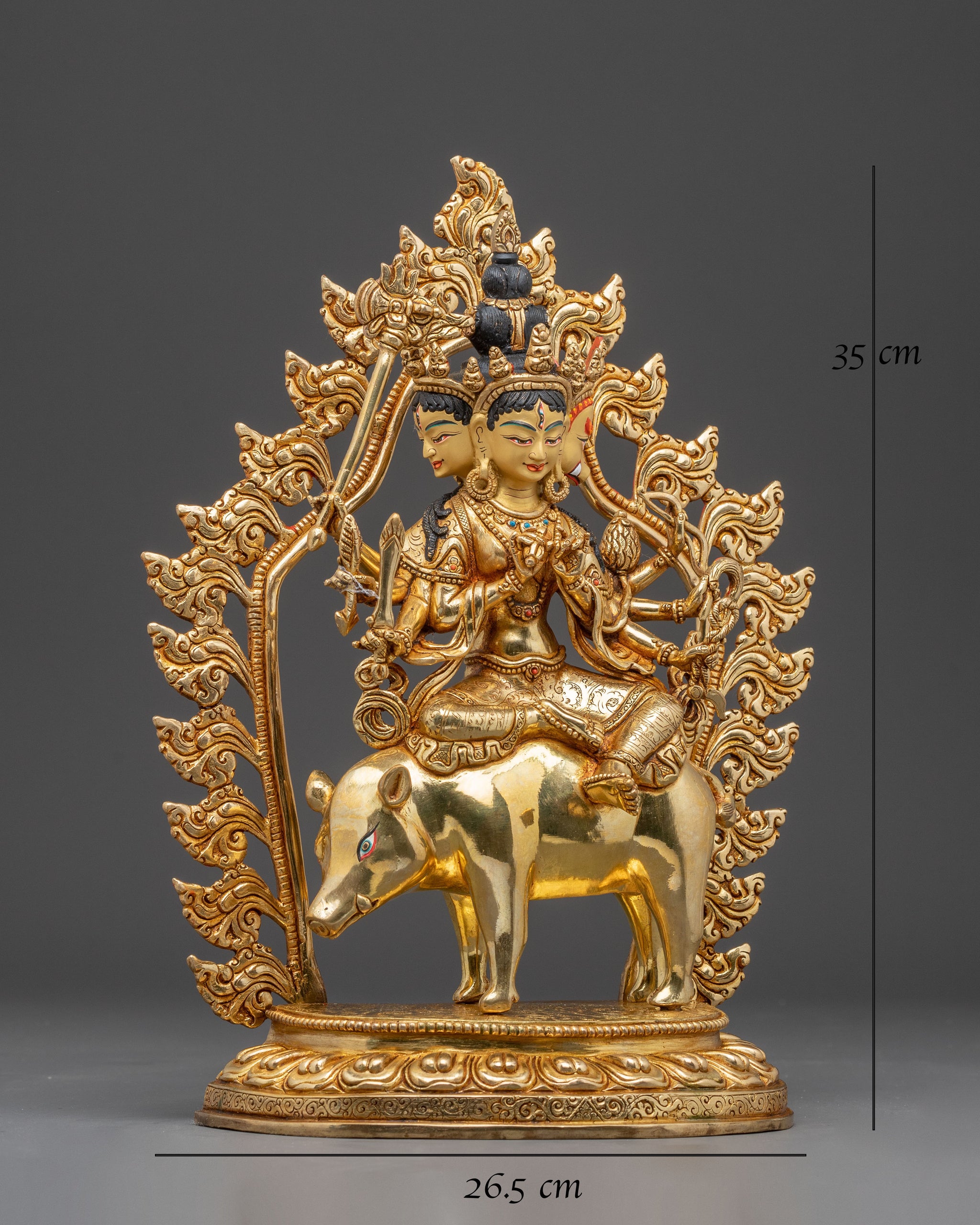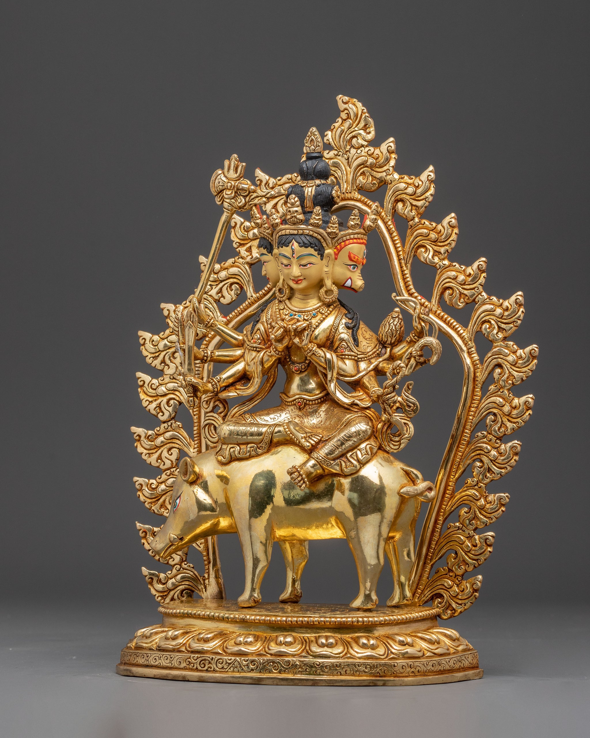 Famous in both Buddhist and Hindu traditions, Marichi is frequently seen riding a chariot drawn by seven boars, signifying the spread of ignorance and darkness. With a calm look, Marichi is seen in this statue sitting in a stately position that symbolizes her function as a remover of impediments and a bringer of light. Her many arms are adorned with a variety of symbolic objects, each of which stands for her ability to enlighten wisdom, allay fear, and offer direction.