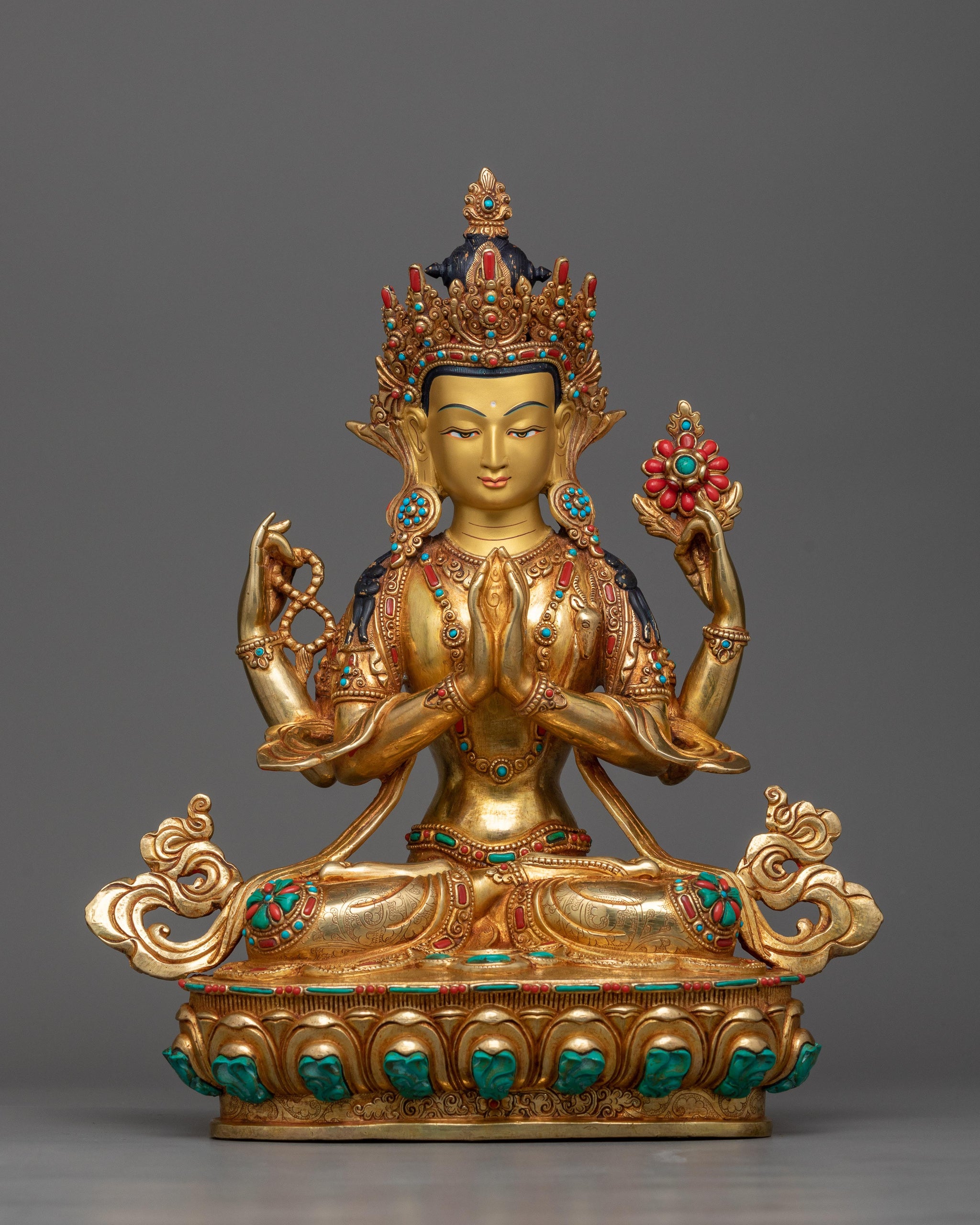 Presenting the 4-Armed Bodhisattva Chenrezig Idol, a manifestation of boundless mercy and compassion. This statue, which stands an astounding 12.9 inches tall, is a profound depiction of Chenrezig, also known as Avalokiteshvara, the Bodhisattva of Compassion, who is highly respected in Tibetan Buddhism for his everlasting dedication to releasing suffering from sentient beings. This idol serves as a daily reminder of the power of compassion and the capacity for kindness within each of us, for both spiritual enthusiasts and practitioners.