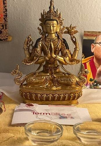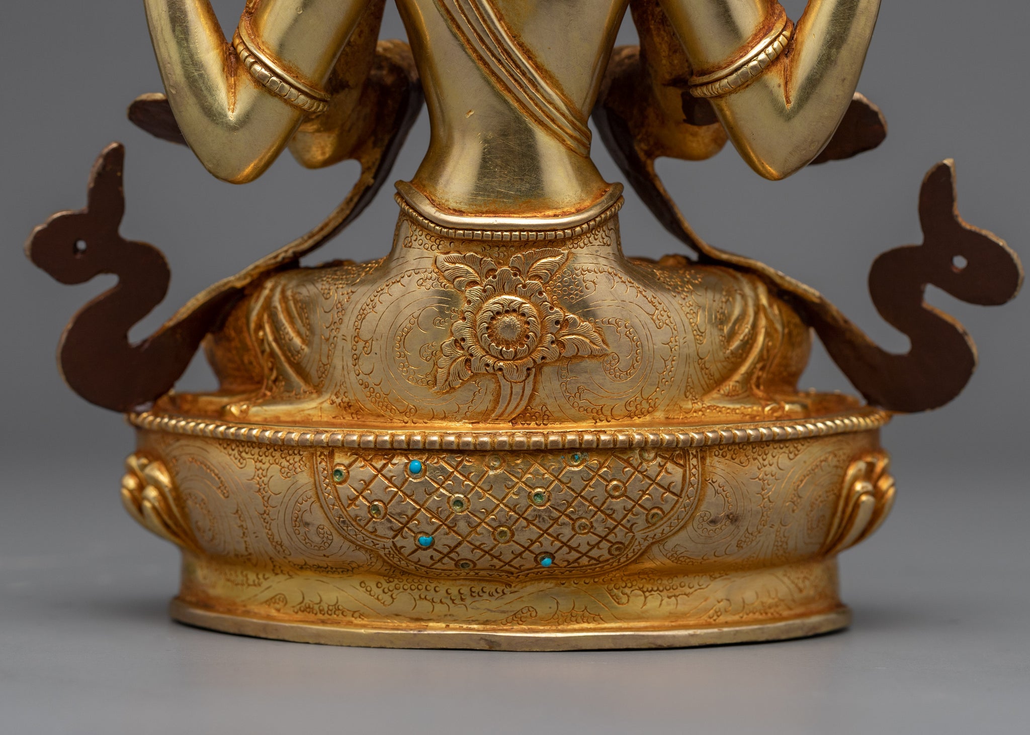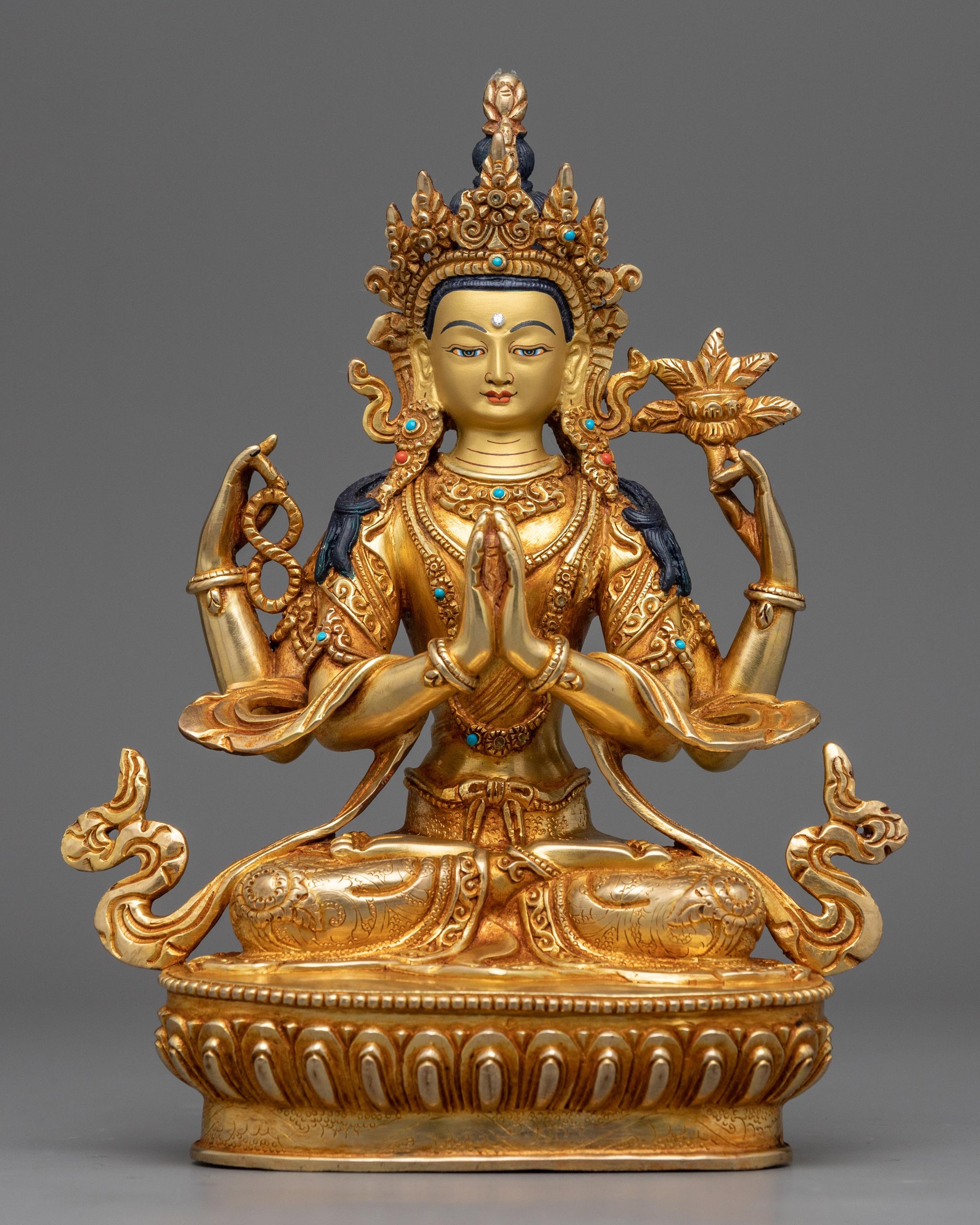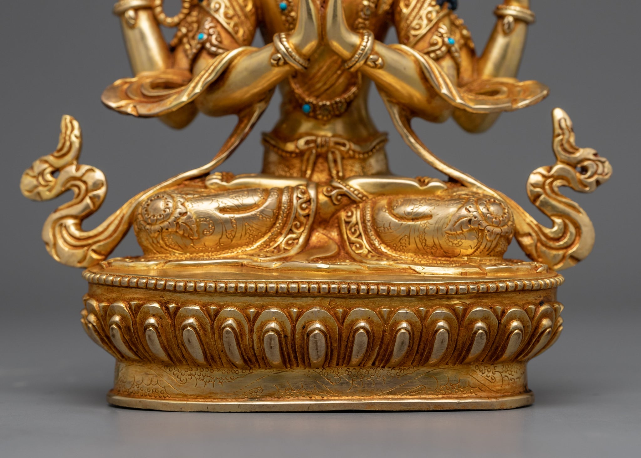 Gold Gilded Statue of 4 Armed Chenrezig for Meditation and Ritual