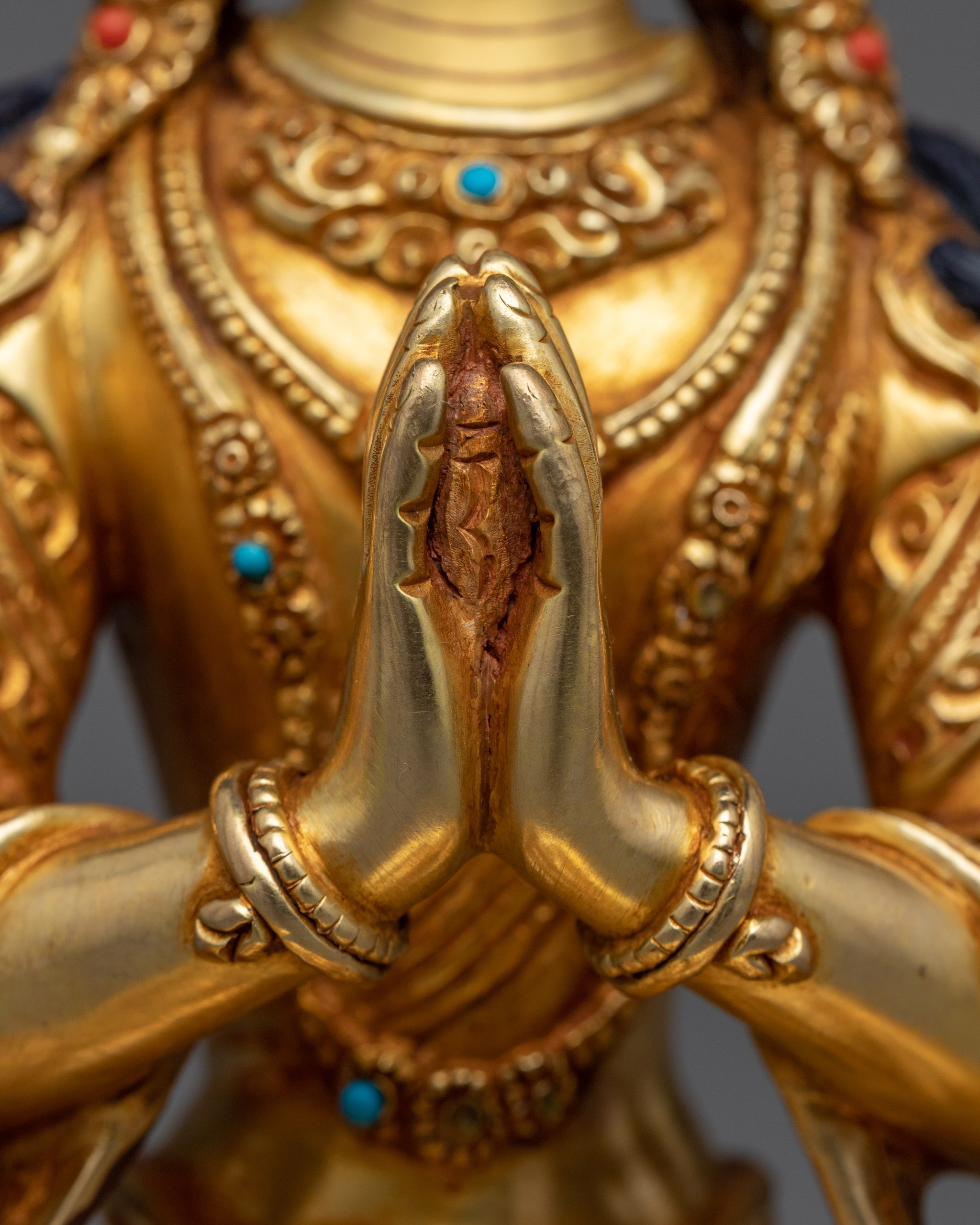 This exquisite piece of 4 armed Chenrezig statue employs traditional Himalayan motifs and designs delicately produced in our studio. The statue is hand-carved out of copper, gilded in gold, and beautifully painted with acrylic colors, enhancing its beauty. The Bodhisattva has four arms and is seated on a moon disc lotus seat. The second pair each holds an object like the crystal rosary on his left and an Utpala flower on his right, while the first pair form the "Namaskara Mudra" by bringing them together in front of the chest. Our artists carefully put precious jewels to enhance the statue's beauty.
