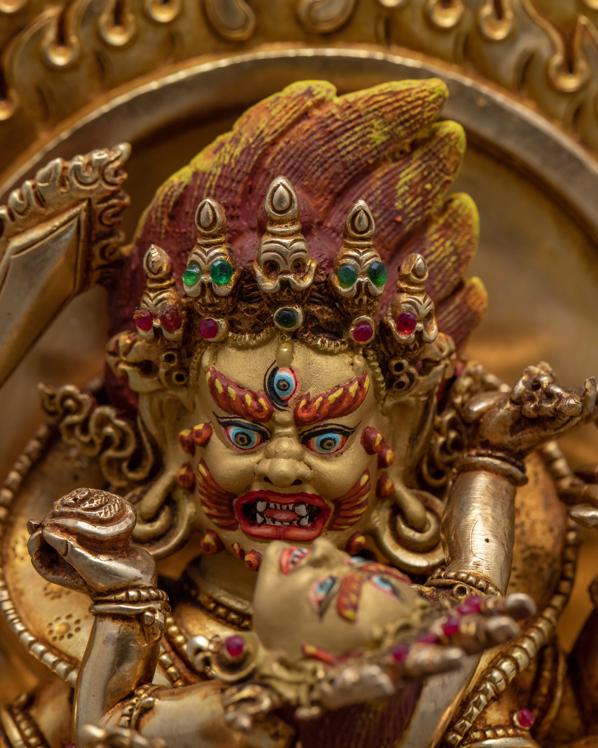 We have traditionally hand-carved the statue of 4 Armed Mahakala and his consort in a Himalayan Art of Nepal. We are the Kathmandu Valley artist whose artisan has passed from generation to generation. We have used genuine 24k gold and acrylic paints in this statue. Deity adorned with precious jewels and turquoise is exquisitely mesmerizing. You can use this sculpture in many aspects like meditation and yoga practices, home decoration, and on many Buddhist Ritual occasions. We have depicted a deity and his consort in an embracing gesture, sitting atop a sun disc lotus seat gilded with gold in a pure copper body. This art will be a tremendous gift from Nepal to a practitioner like you.