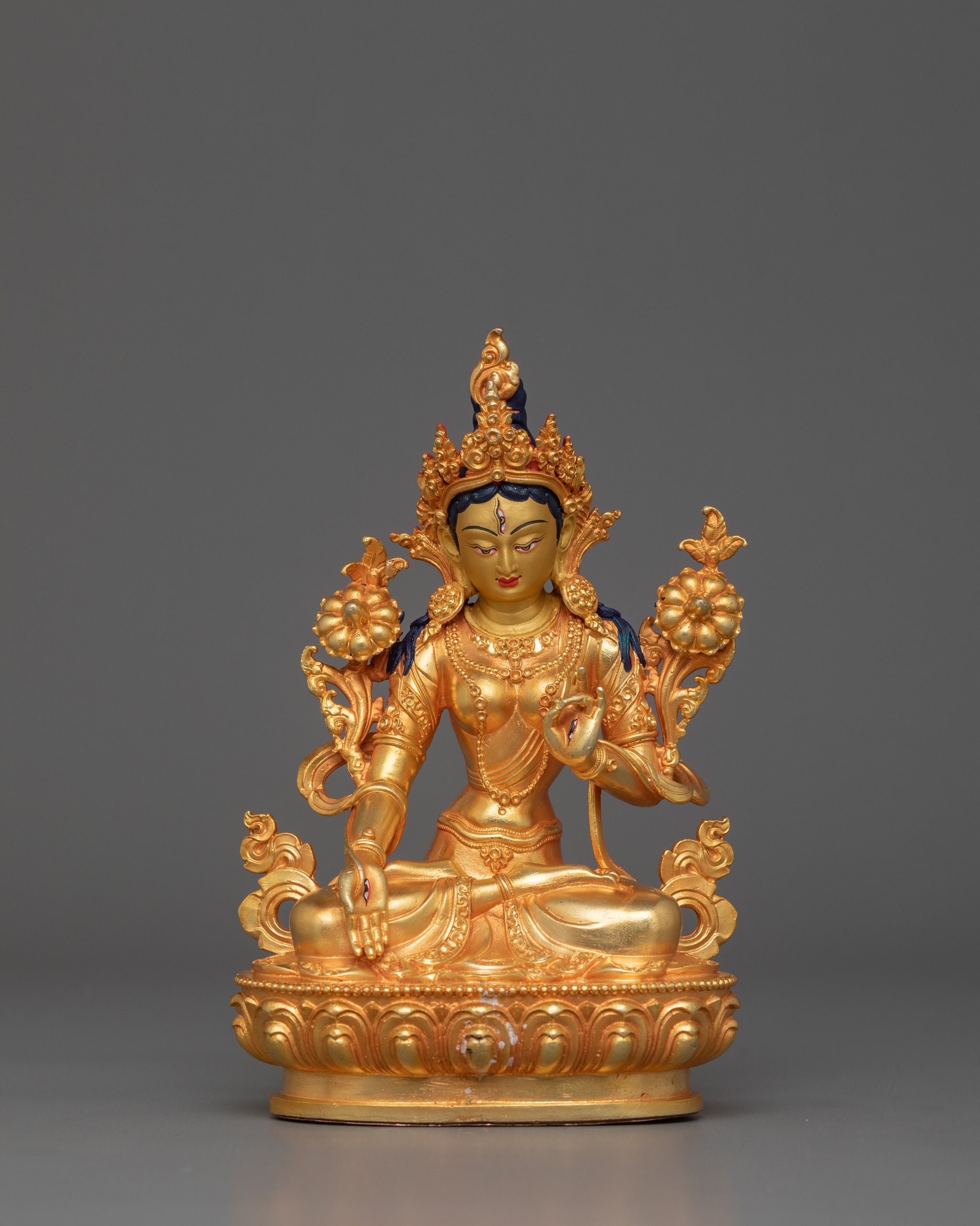 This 5.9-inch machine-made White Tara statue, crafted from a gold-electroplated copper body with fine gold and acrylic paintings, This statue embodies compassion, healing, and longevity. We can see this statue is sitting at size Size: 5.9”/15cm (Height) x 3.9”/10cm (Base) Weight: 0.514 kg.