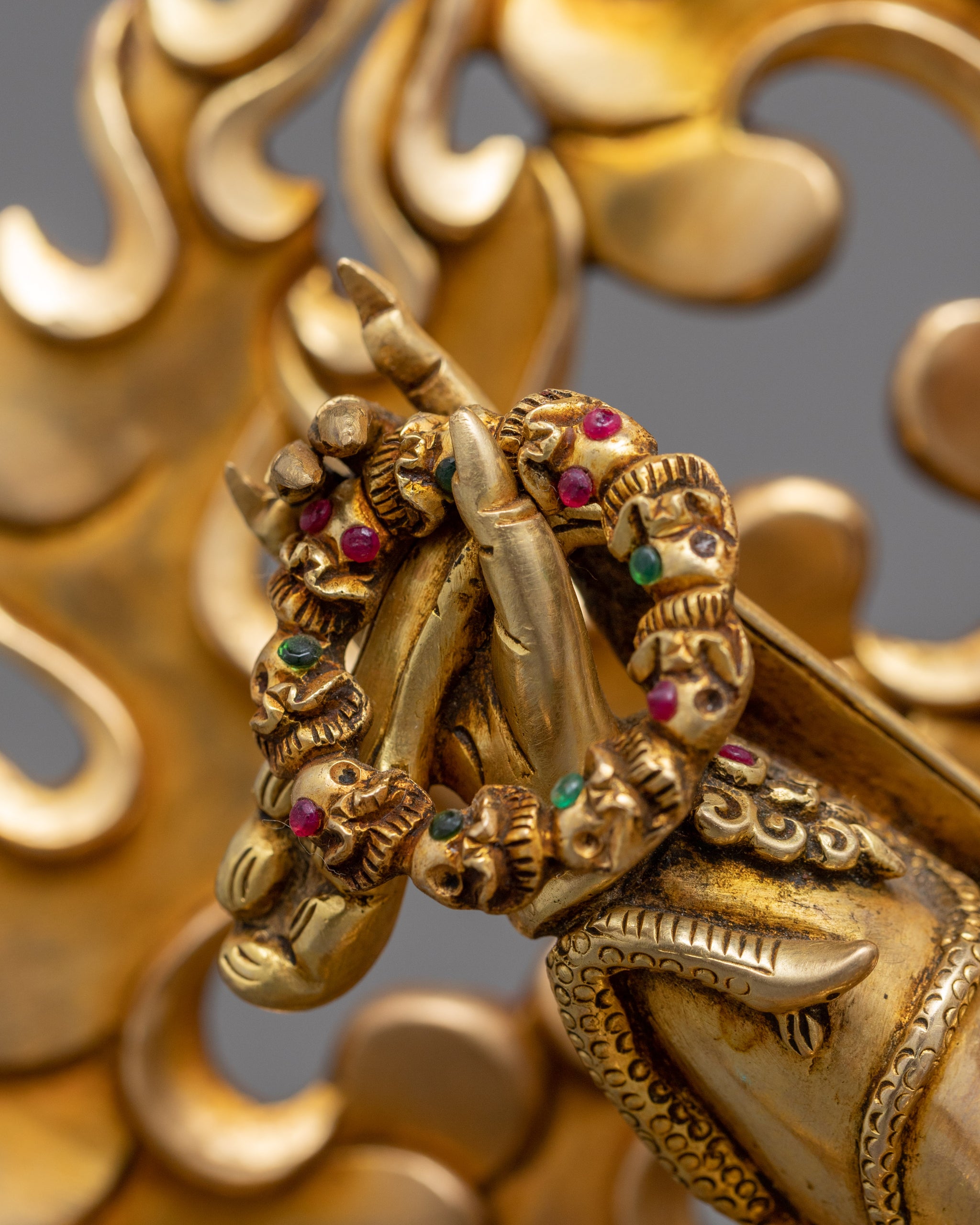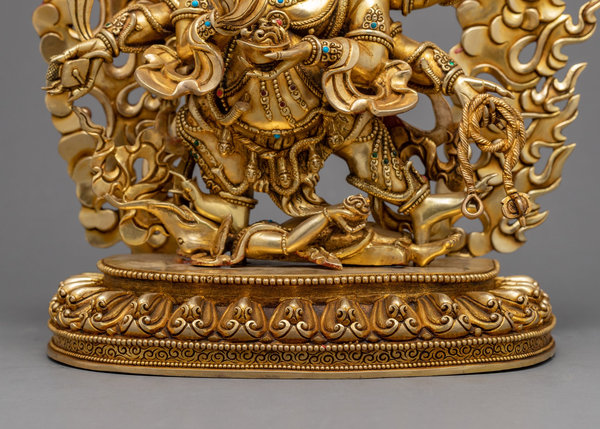 This exquisite six-armed Mahakala sculpture was diligently carved by hand and painted in genuine 24-karat gold. The artist created robes, faces, and a variety of other things meticulously that have been passed down down the generations. Using valuable jewels and stones, we have beautifully sculpted this statue in traditional Himalayan art. The artist had to be attentive when carving this work by hand, thus it took more than a month to complete which will be a great gift for a practitioner like you.
