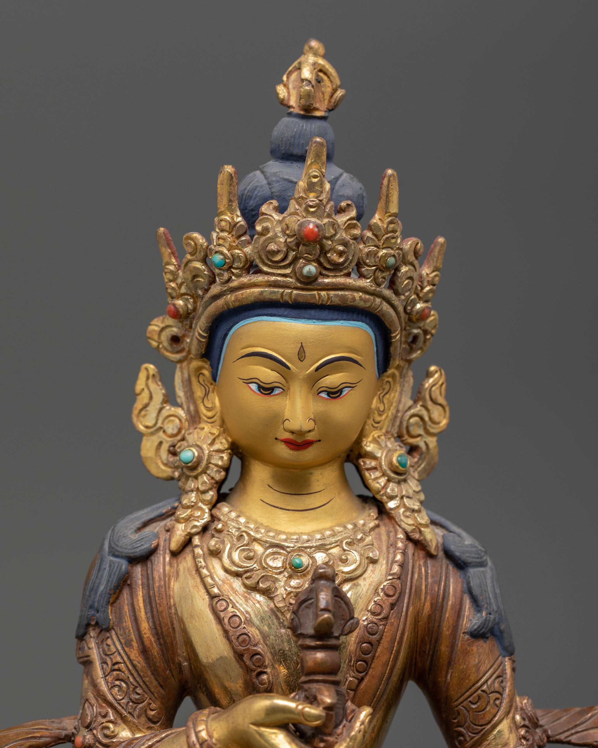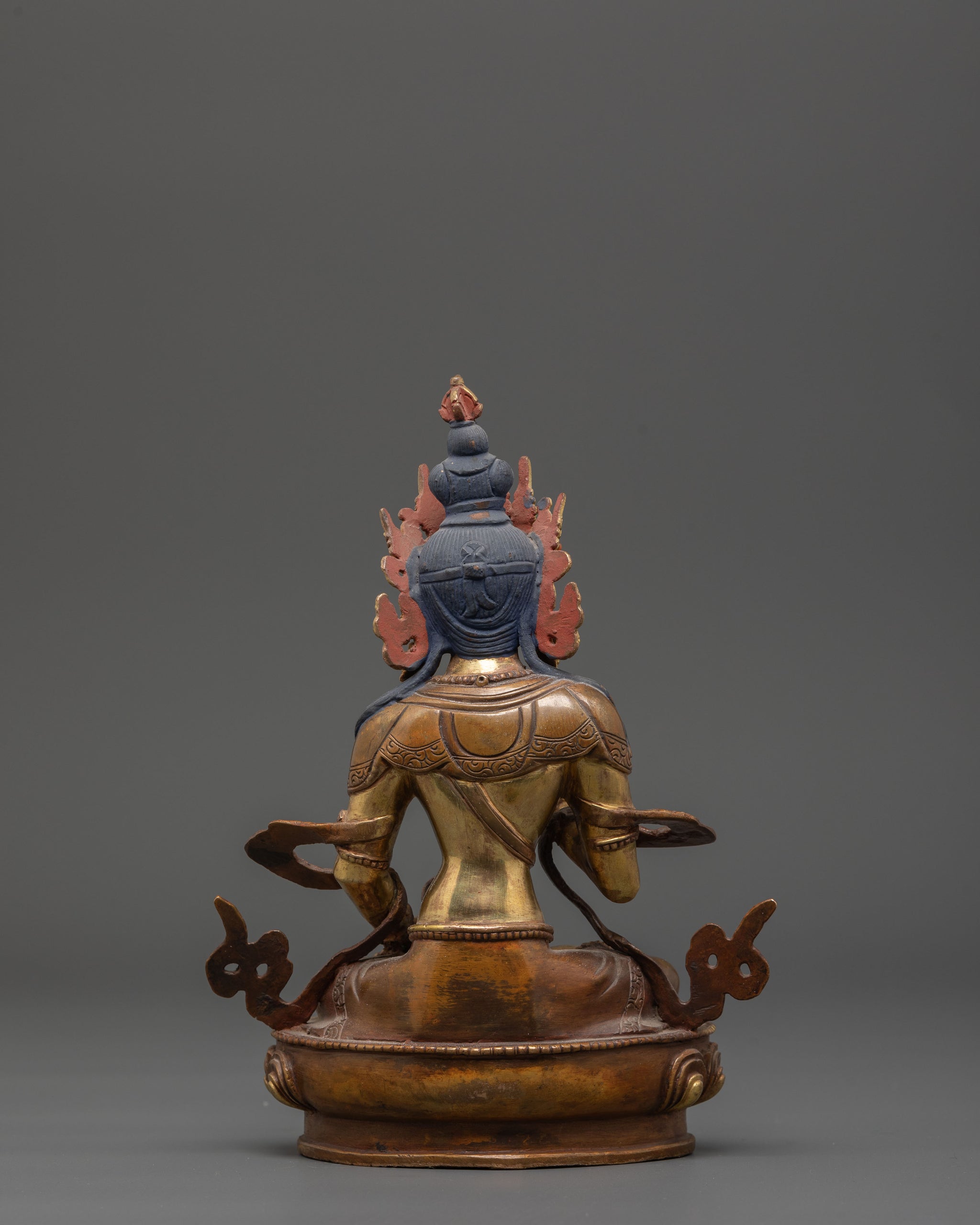 This Vajrasattva Statue measures 8.8”/22.5cm (Height) x 6.3”/16cm (Base) and weighs 1.46 kg. Crafted from a copper body with 24K gold gilding and detailed with gold and acrylic paintings, it reflects the skill and devotion of talented Nepali artisans. This piece is ideal for personal altars, meditation spaces, or as meaningful spiritual decor.
