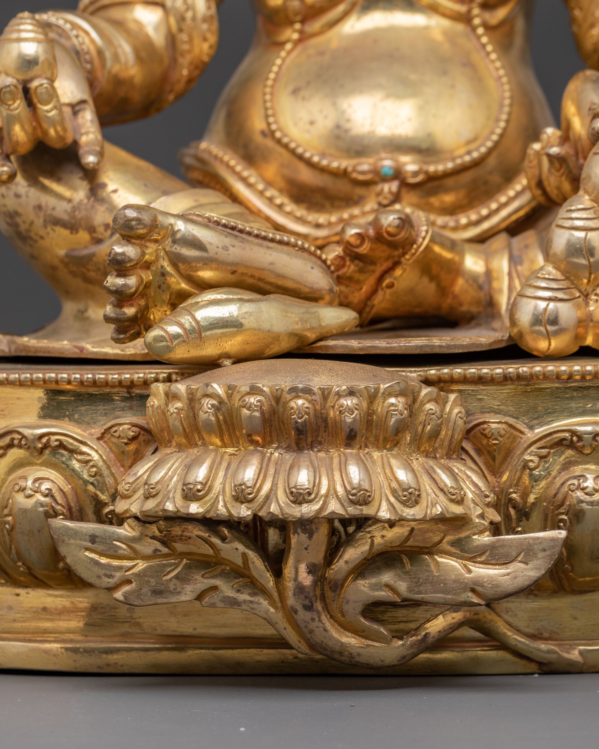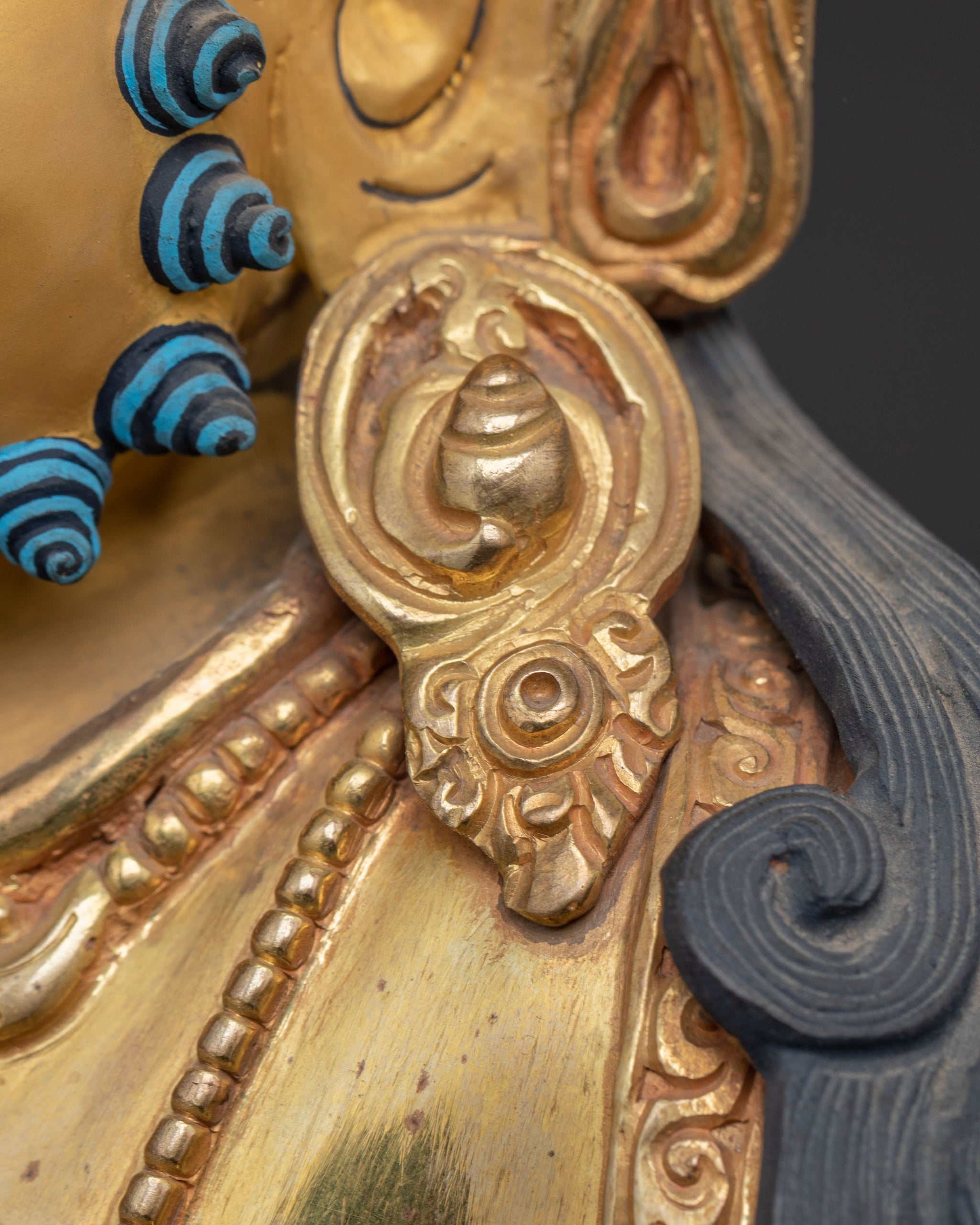 This magnificent Golden Abundance Icon Dzambhala Statue is a masterful representation of wealth, prosperity, and spiritual abundance in Tibetan Buddhism. Measuring 16.1” (41 cm) in height with a 17.3” (44 cm) base and weighing 10.70 kg, it is crafted from copper, adorned with 24K gold gilding, enhanced with gold and acrylic paintings, and embellished with gemstones. Expertly handcrafted by skilled Nepali artisans, this sacred piece brings a powerful and auspicious presence to altars, meditation spaces, or personal spiritual collections.