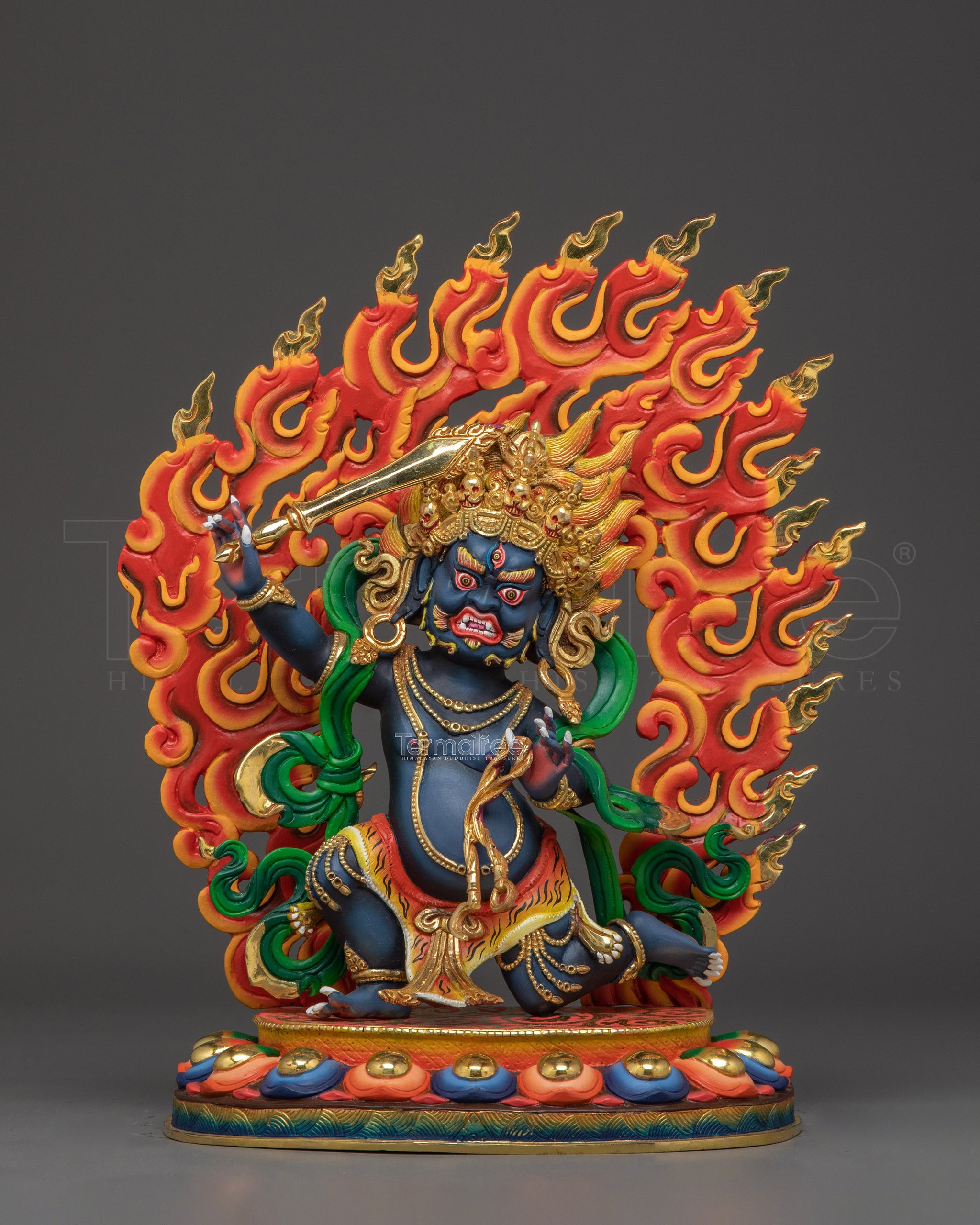 The Two-Armed Achala Statue depicts the wrathful deity with a dark blue body, surrounded by a flaming halo that symbolizes the burning away of delusions. He wears a five-skull crown, representing the transformation of the five poisons into wisdom. In his right hand, he holds a sword to cut through ignorance, while his left hand grasps a lasso used to bind hostile forces. Achala has three glaring eyes that see past, present, and future, and sharp fangs that emphasize his fierce, immovable nature. He is adorned in a tiger-skin cloth and stands atop a sun disc lotus base, signifying his enlightened foundation and dynamic energy.