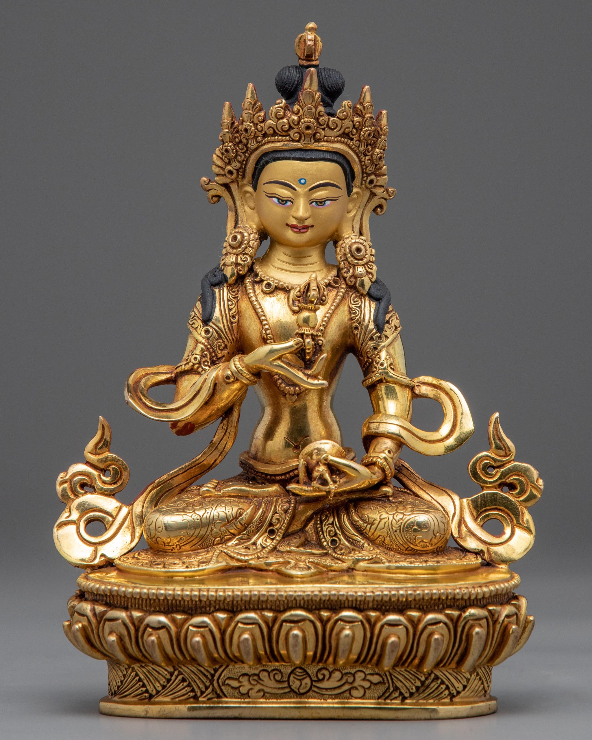 Our traditional statue depicts the Adi Buddha Vajrasattva in a meditative pose on top of a moon disc lotus. Expertly crafted, the statue is made of copper and coated with 24k genuine gold, with intricate acrylic painting. The statue shows the deity holding a vajra in his right hand and a bell in his other hand. The gold coating is applied precisely, accentuating the intricate design and giving the statue a radiant shine. The deity also wears a crown adorned with hand-carved, intricate, designed patterns. This stunning statue would make an excellent addition to any meditation practice.