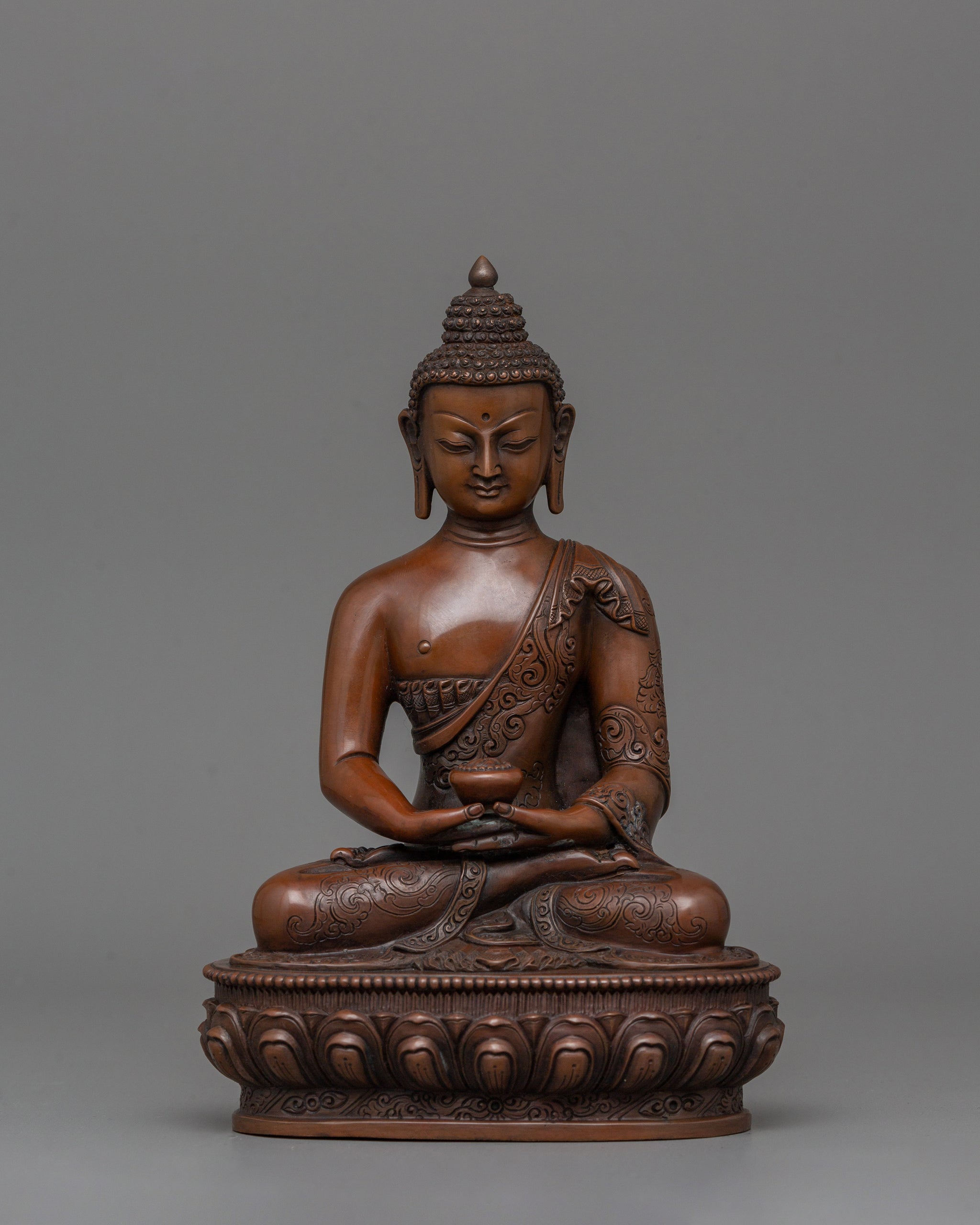 This brown body statue of Amitabha Buddha, the Buddha of Infinite Light, is a revered figure in Buddhist tradition, symbolizing boundless wisdom and compassion. This Oxidized Amitabha Buddha statue is a remarkable handmade piece crafted by skilled Nepali artisans in Patan, Nepal. The statue stands at 8.7 inches (22 cm) in height with a base measuring 5.7 inches (14.5 cm) and weighs 1.54 kg.