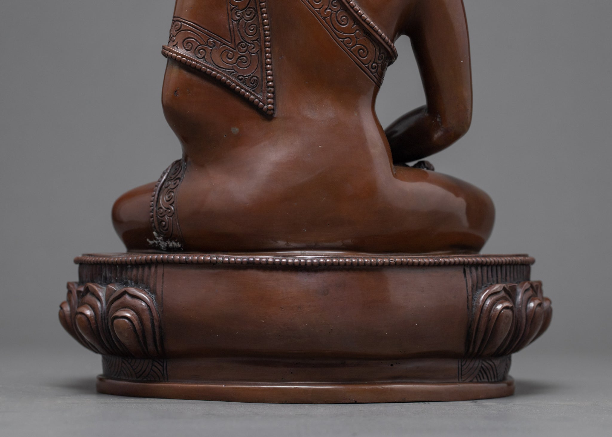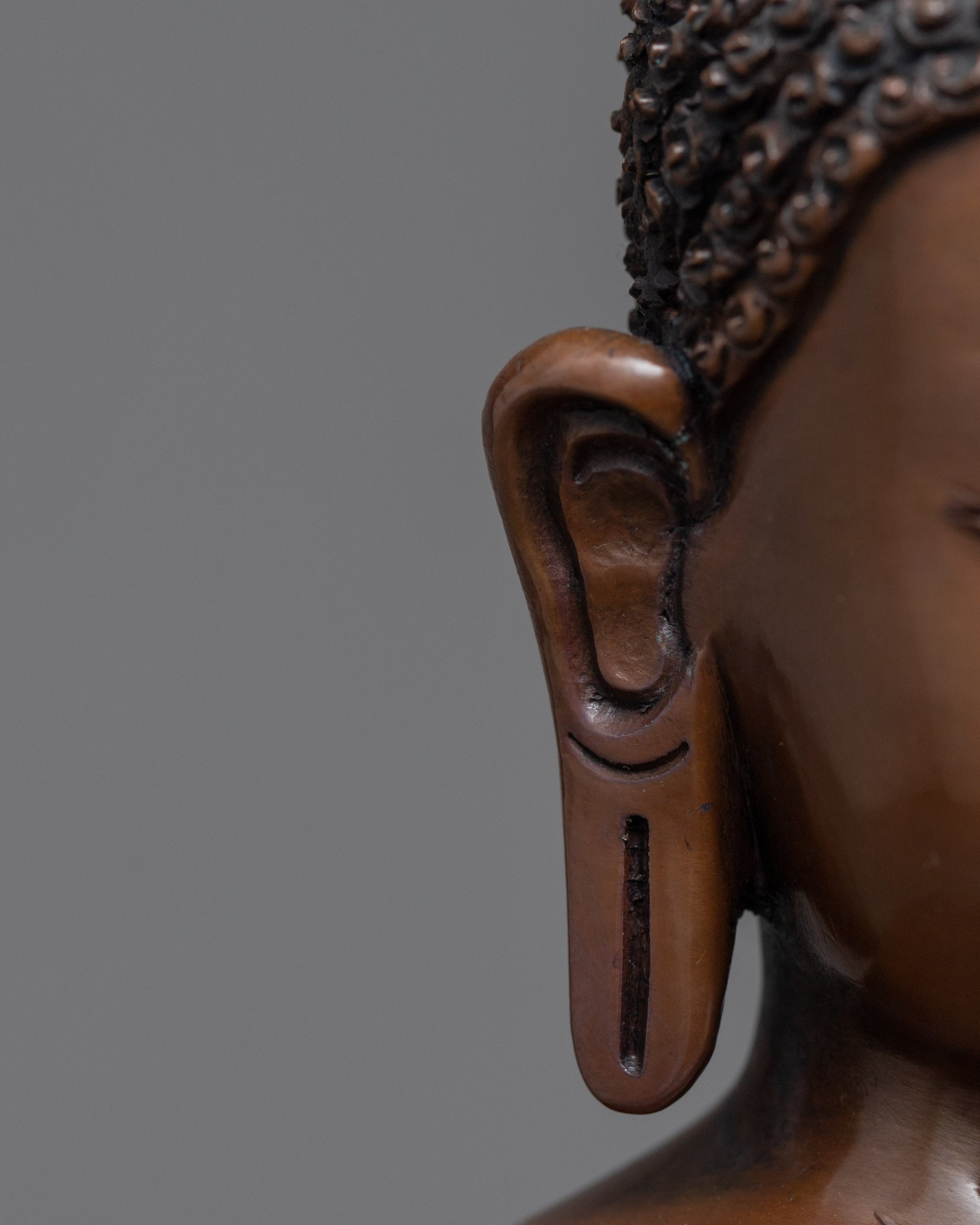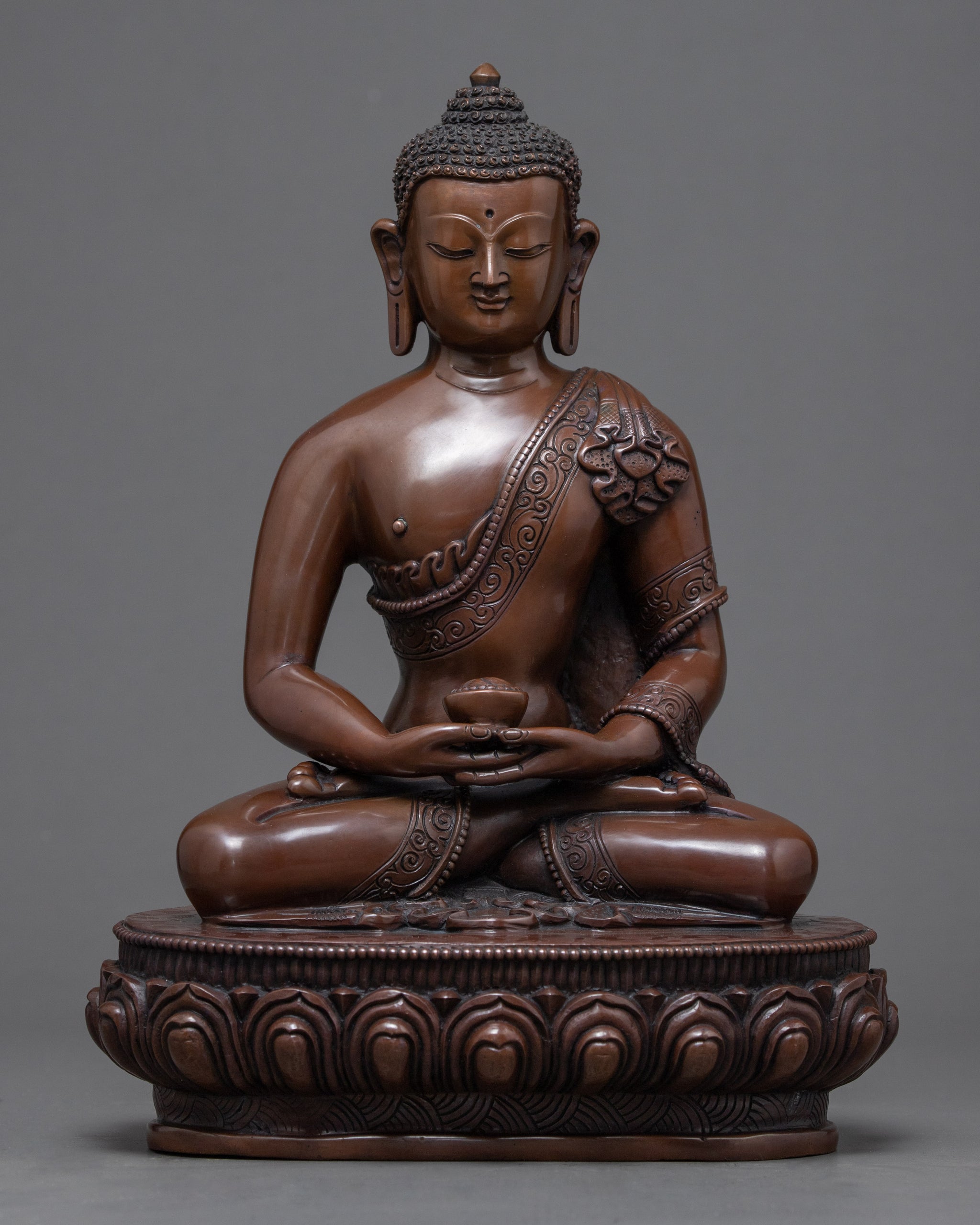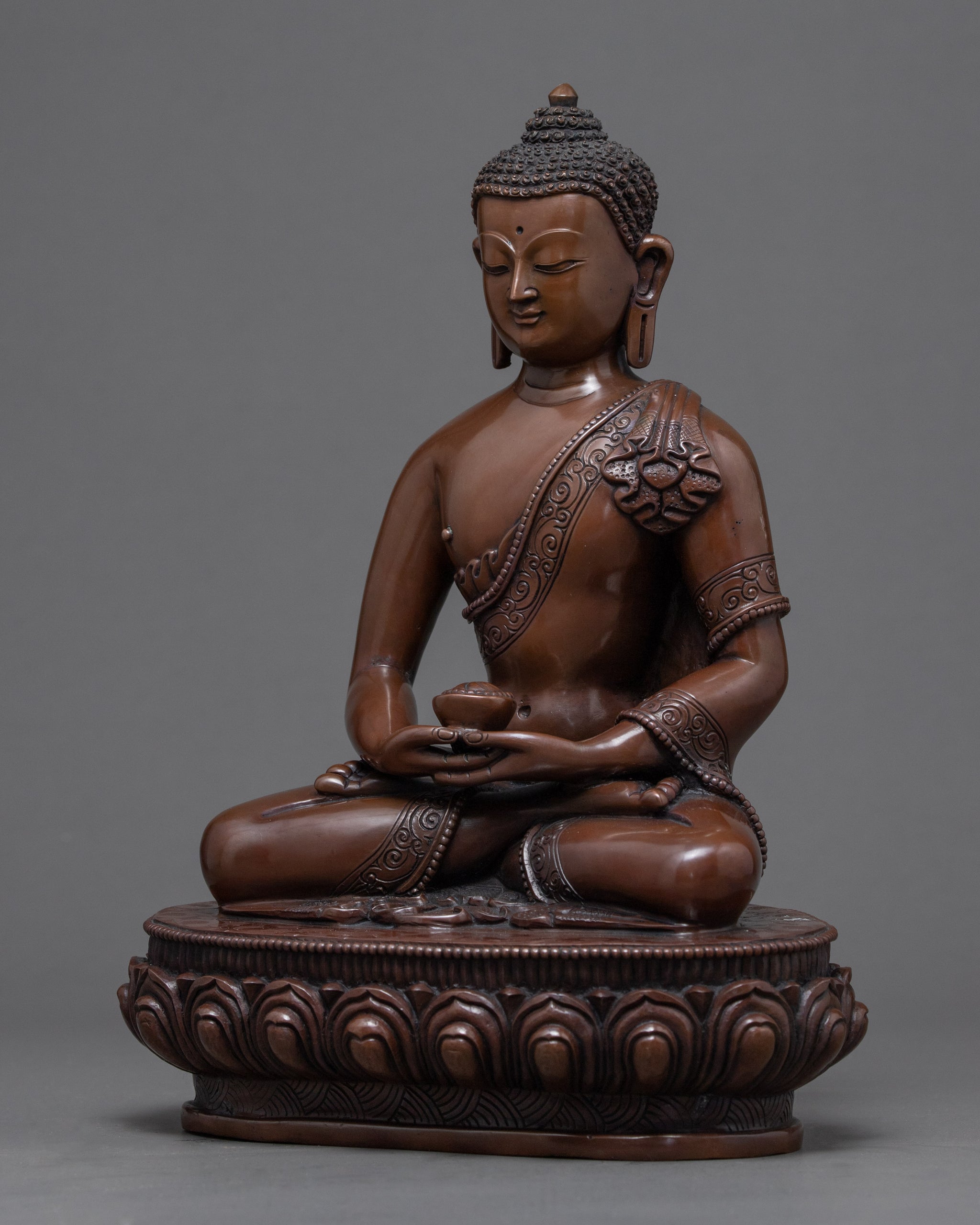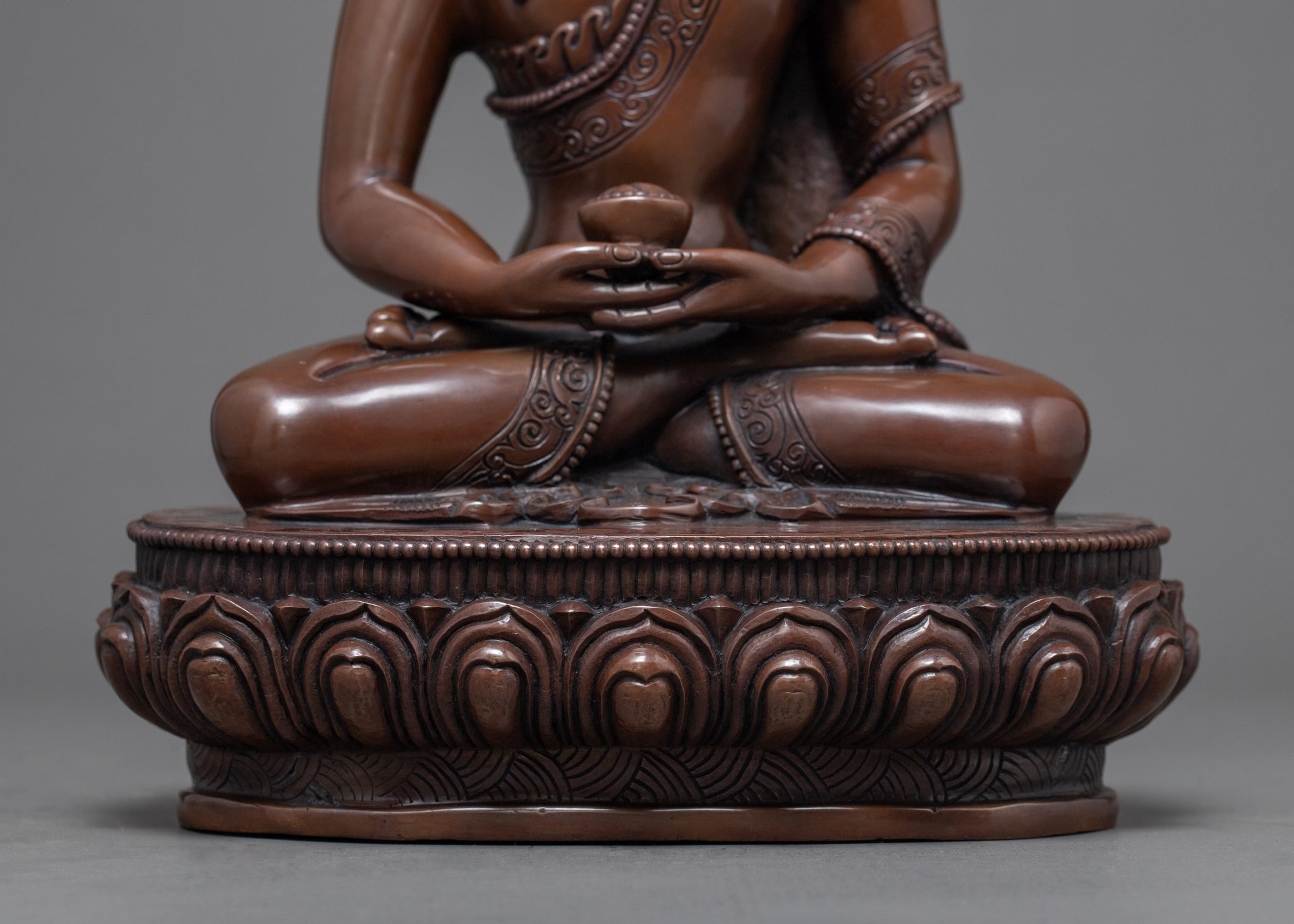 Amitabha is regarded as the principal Buddha of Pure Land Buddhism. We have hand-carved this simple yet beautiful Statue of Amitabha Buddha in the Copper body. We depicted Him sitting atop a lotus with a calm and peaceful expression, holding an eternal life nectar vase with both his hand on his lap. We carved the edges of the robe to give simple yet intricate details. We are a team of artists based in Kathmandu, Nepal, and we have been sculpting the sacred deities of Buddhism for generations.