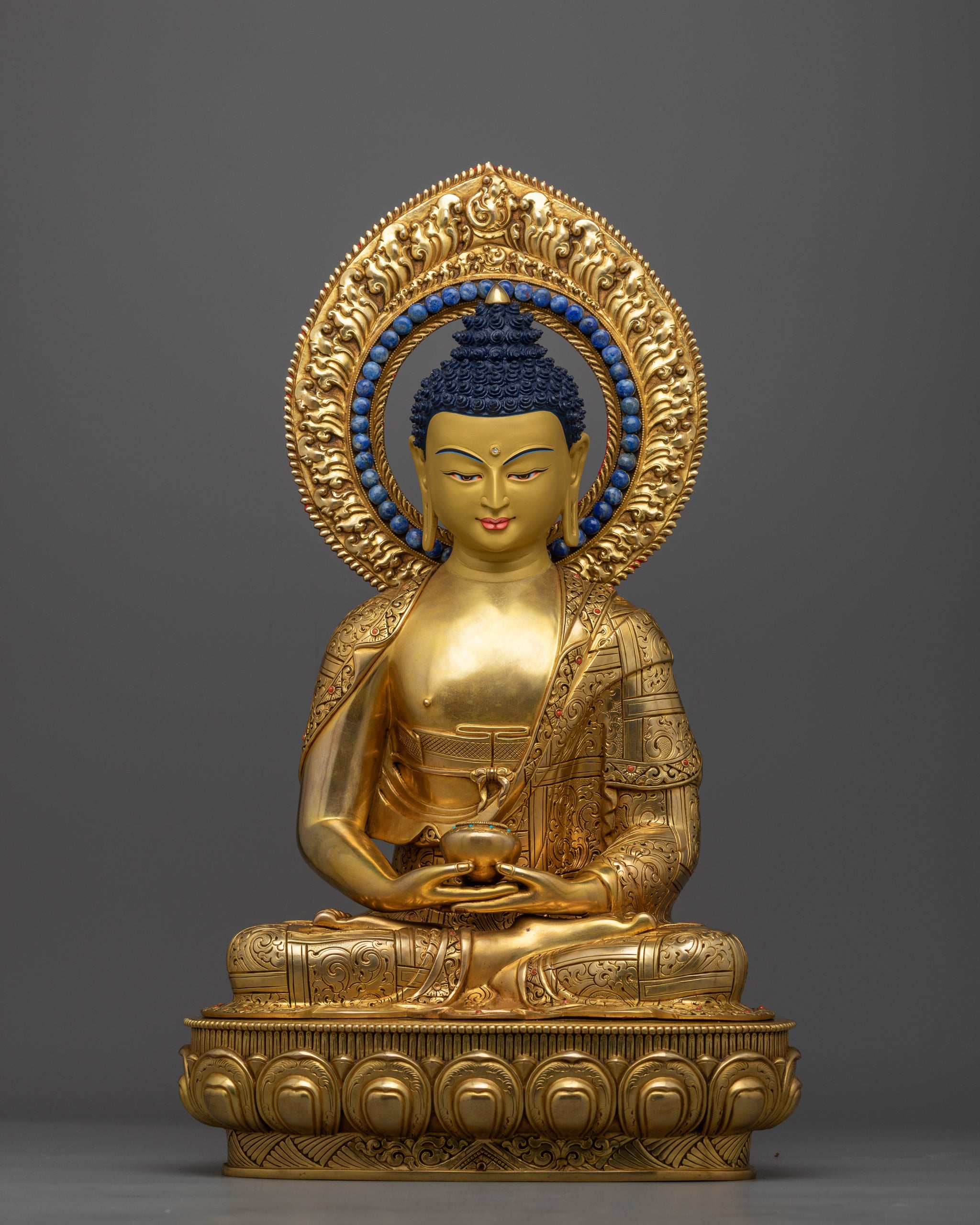 Experience the presence of Amitabha Buddha, the embodiment of boundless compassion and endless light, with this magnificent sculpture expertly carved by Patan, Nepal's experienced artisans. This exquisite artwork, which embodies a sense of divine brightness and awakened consciousness, is a true masterpiece of Nepalese metallurgy. It boasts an exquisitely carved copper body with sumptuous 24K gold gilding and delicate acrylic paints.
