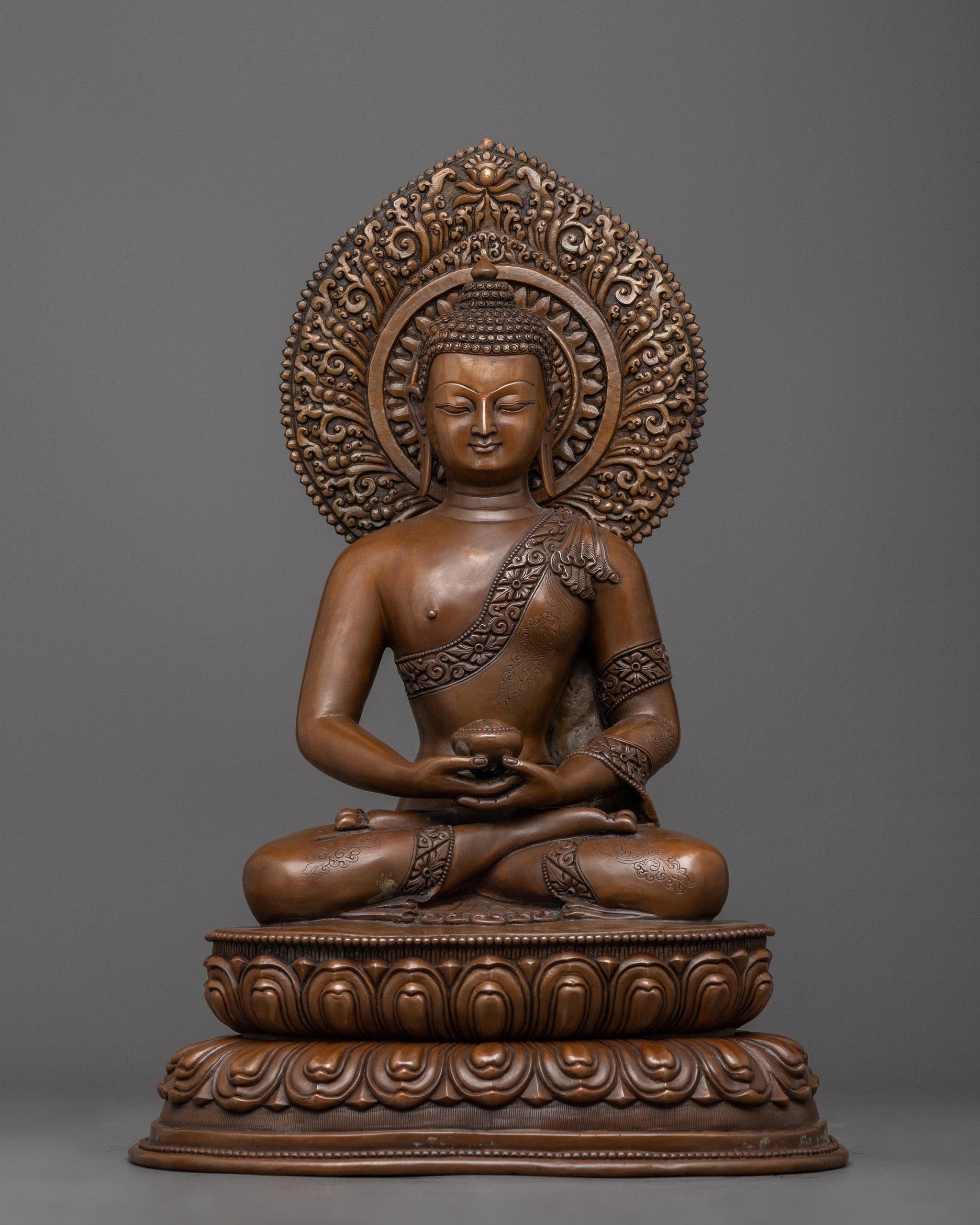 Amitabha Buddha, the Buddha of Infinite Light and Life, has a distinct place in the Buddhist pantheon. This Amitabha Buddha statue is handcrafted from oxidized copper and represents boundless compassion and pure perception.