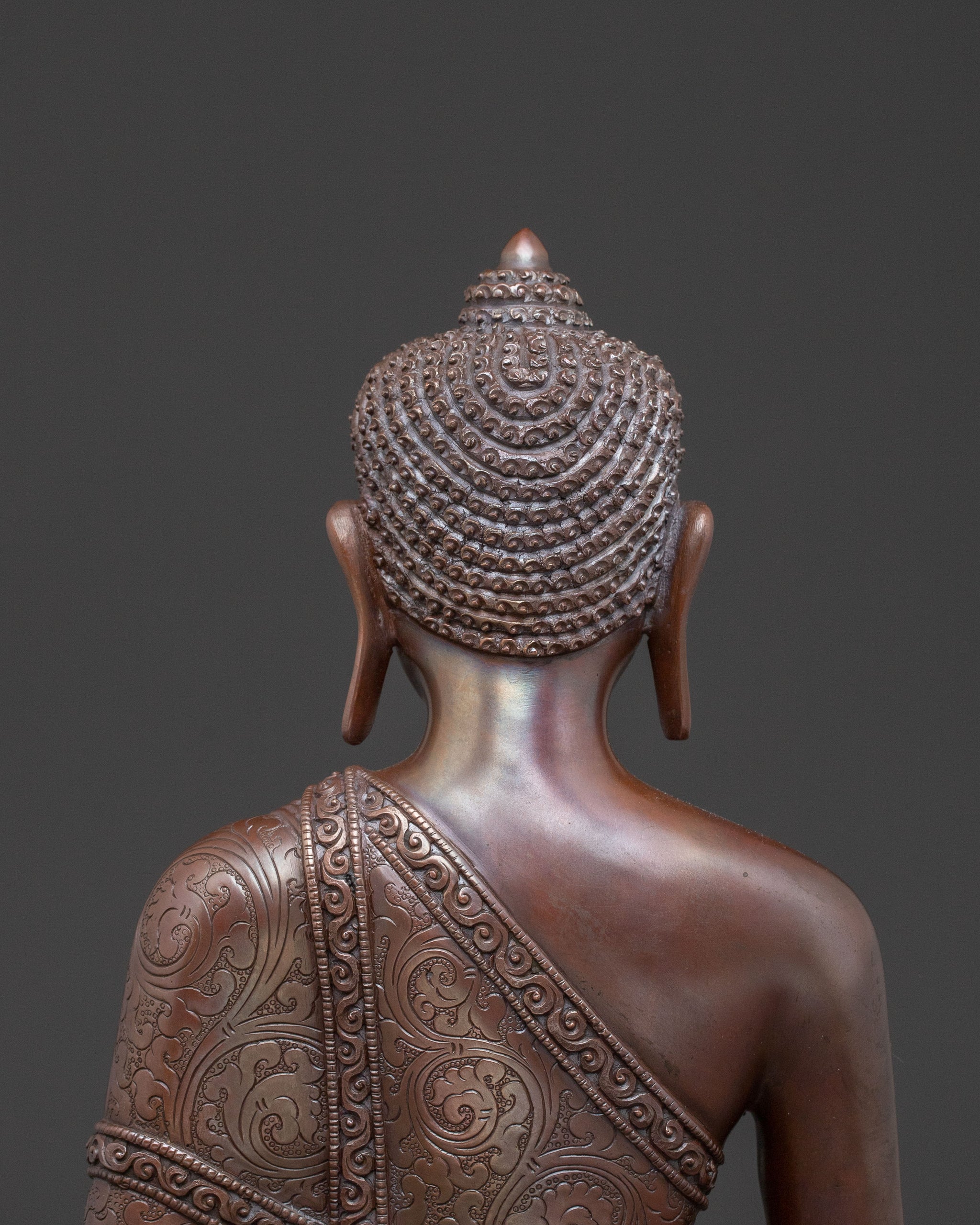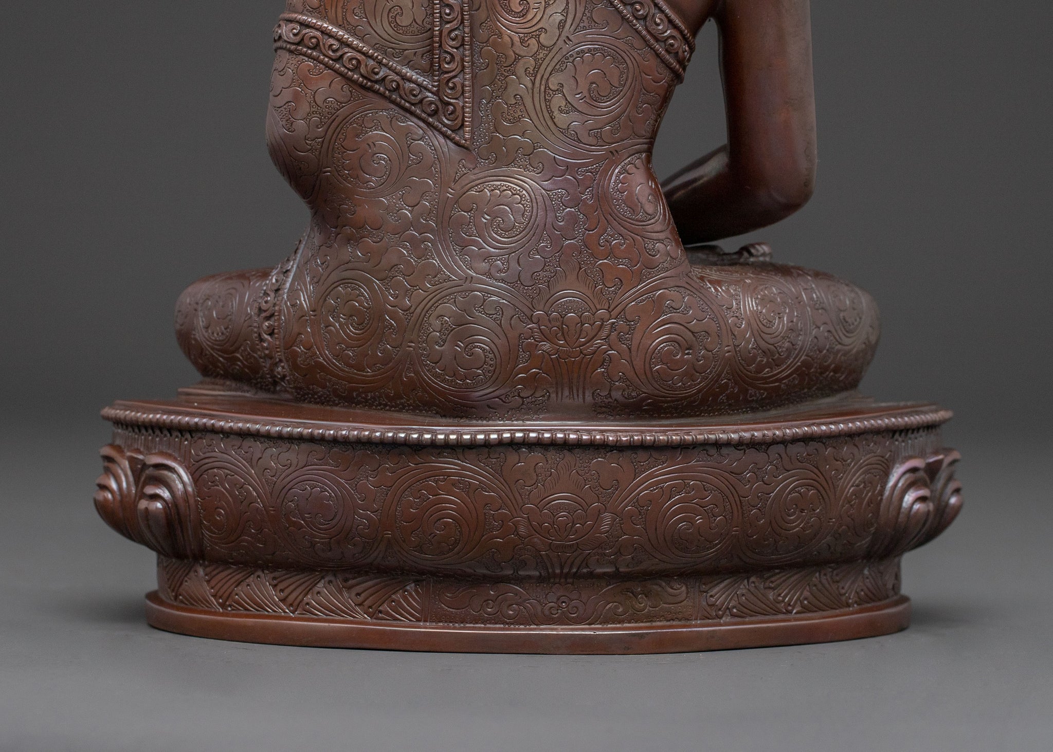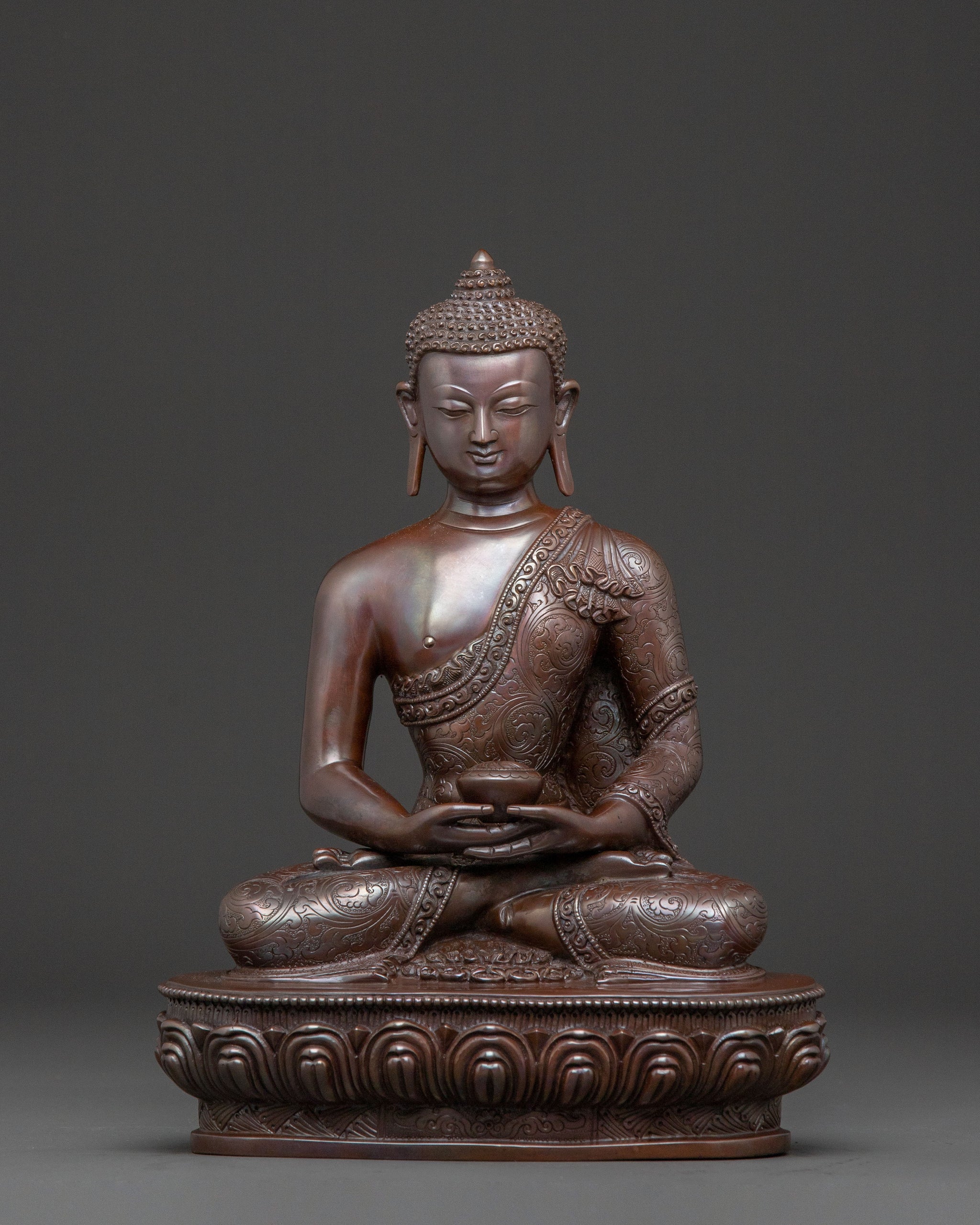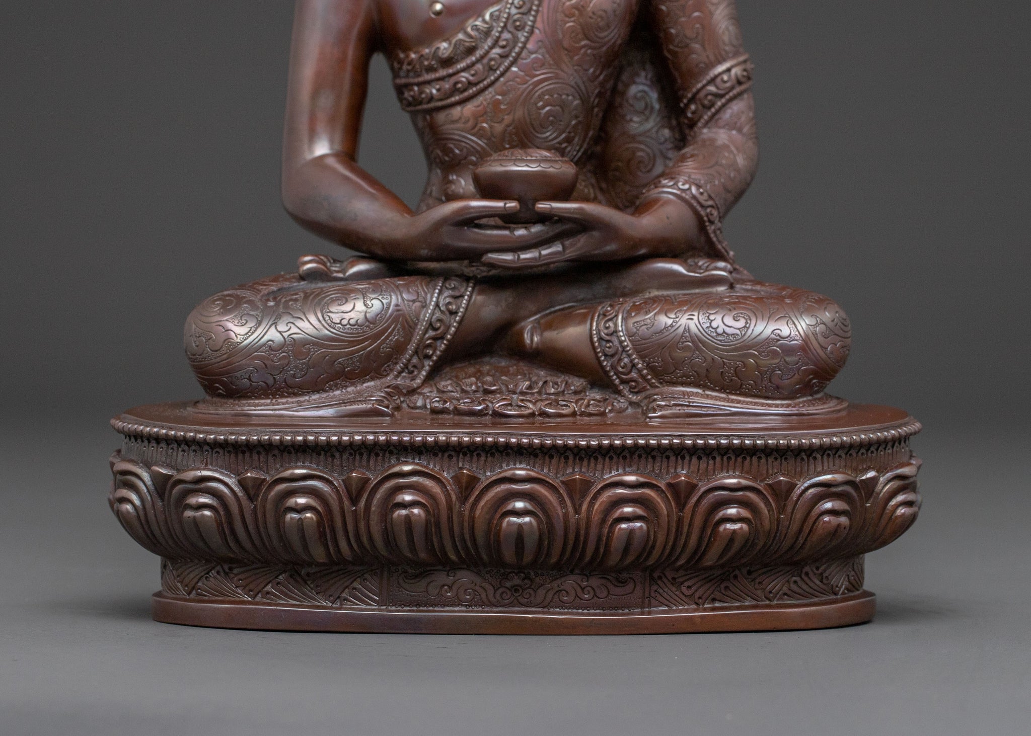 Handcrafted in Nepal, this stunning Amitabha Buddha statue exudes serenity and embodies the radiance of limitless light. Standing 26.5 cm tall and gracefully positioned on a traditional lotus base, it creates a peaceful aura in any sacred setting. Crafted from oxidized copper, the dark, textured patina accentuates detailed craftsmanship, offering a timeless look of reverence and calm. Measuring 10.43 inches in height and with a base of 8.66 inches, weighing 2.32 kg, this sculpture beautifully symbolizes peace and spiritual energy.