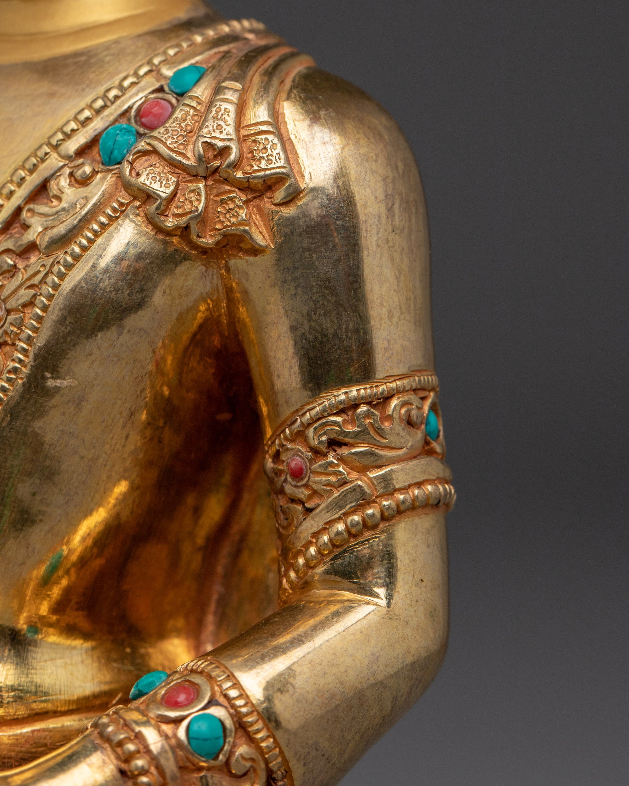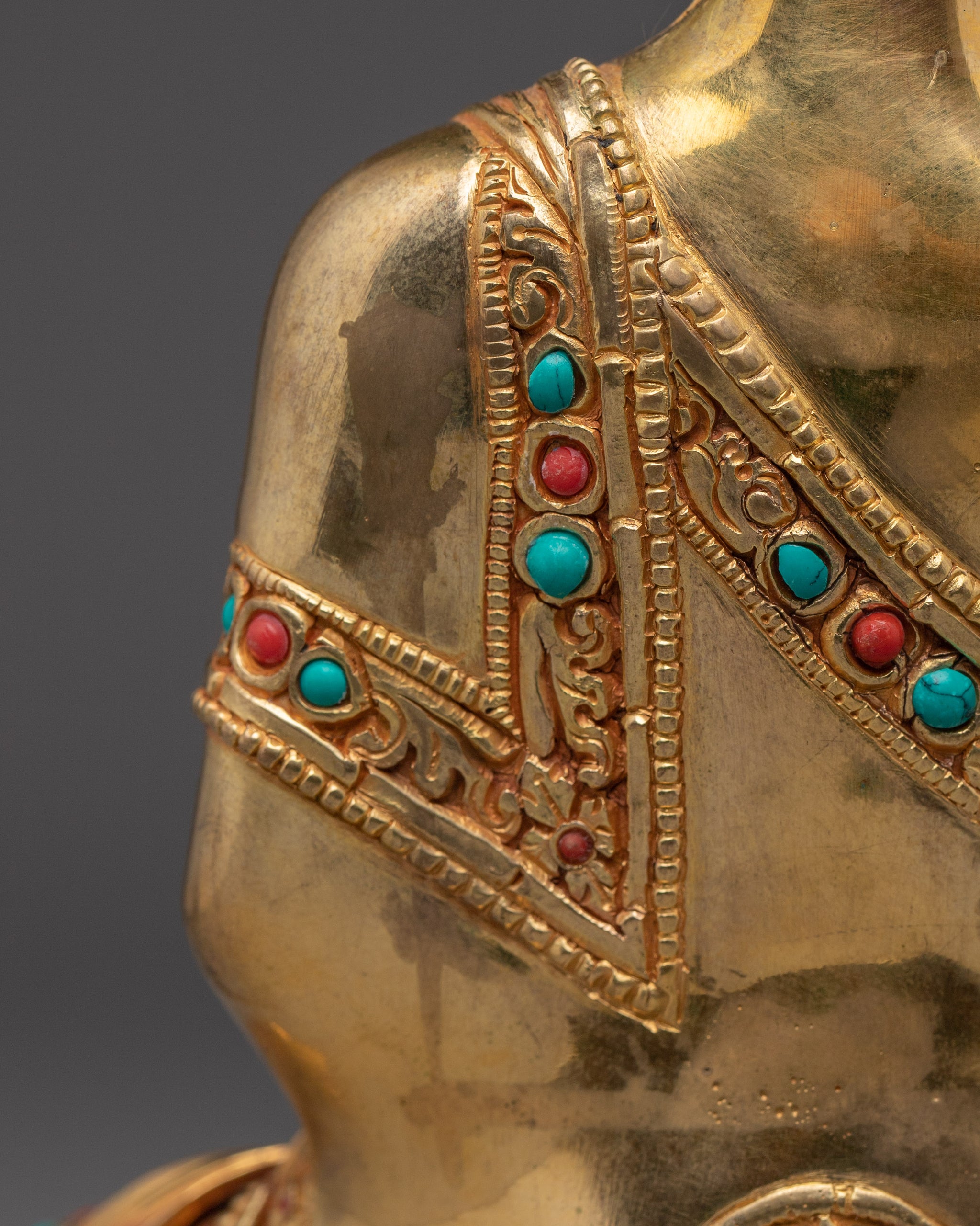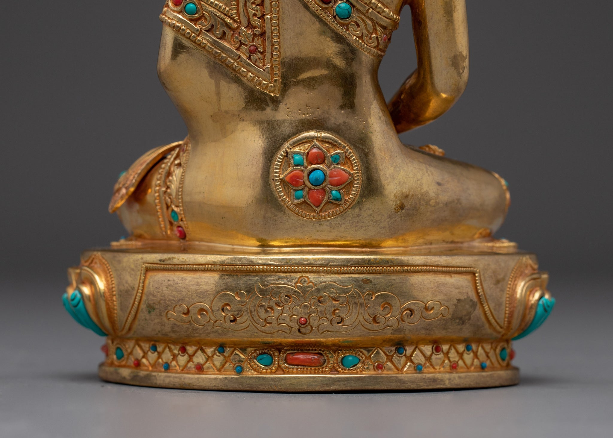 This Pure Land Buddha Amitabha Statue With Halo stands at a 7.5” (19cm) in height with a base width of 5.3” (13.5cm). Crafted from a copper body, the statue is enhanced with 24K gold gilding, giving it a radiant finish. Intricate gold and acrylic paintings bring the statue's features to life, adding color and detail to the serene depiction of Amitabha Buddha. Crafted by expert artisans, this item symbolizes the rich traditions of Himalayan Buddhism, making it an important addition to altars, meditation places, or holy collections.