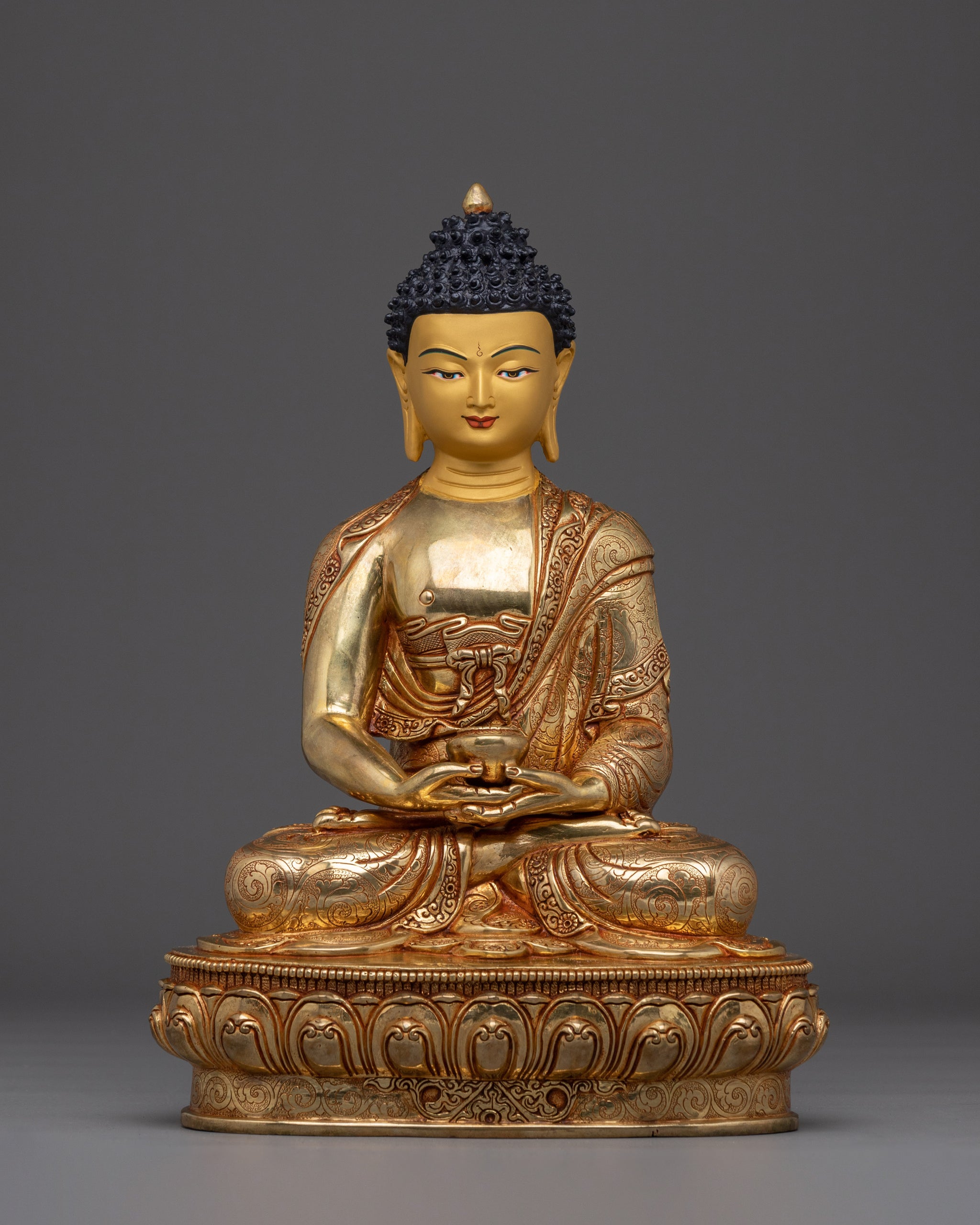 Combine your sacred space with the light of this Amitabha Buddha statue of Infinite Light and Compassion, which is thirteen inches in length and is a timeless symbol of boundless compassion and personal freedom. Copper is used in the construction of this statue, which is then completed with gilding made of 24K gold. The work of art was handmade by skilled craftsmen in Nepal. In addition to being exquisitely adorned with gold and acrylic painting, it sits atop a complete lotus pedestal and exudes exquisite tranquility from every view point. It is both exquisite and substantial, weighing 4.81 kilograms, making it an excellent choice for personal shrines or religious sanctuaries.