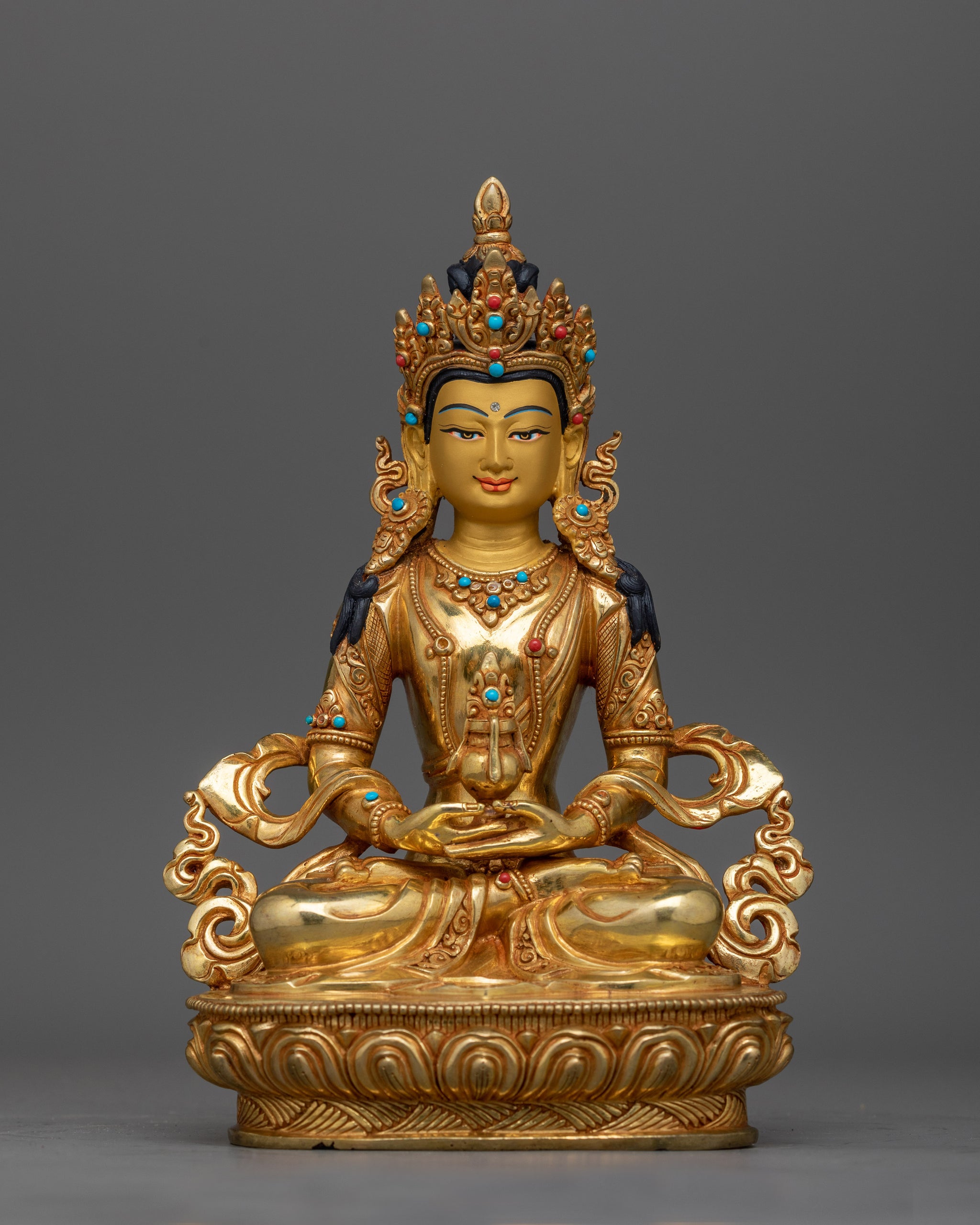 The Amitayus 22cm Handcrafted Statue brings the peaceful blessings of longevity into your area. This highly detailed sculpture and is expertly created from a copper body, adorned with 24K gold gilding, brilliant gold and acrylic paintings, and gemstone inlays. The rich materials and precise craftsmanship showcase Amitayus' calm demeanor and the symbolic lifespan vase he hold, which is delicately painted to underscore its religious significance.