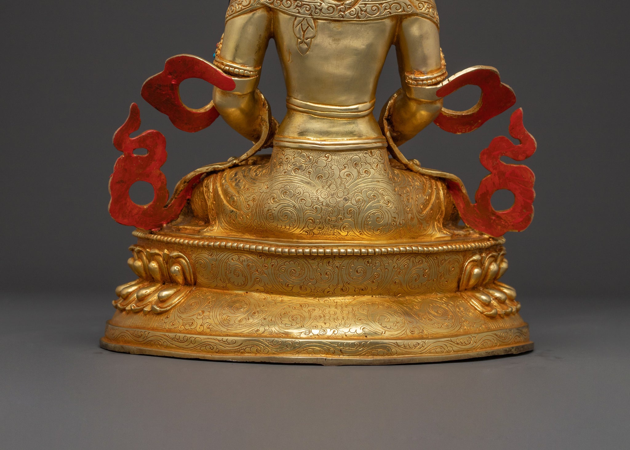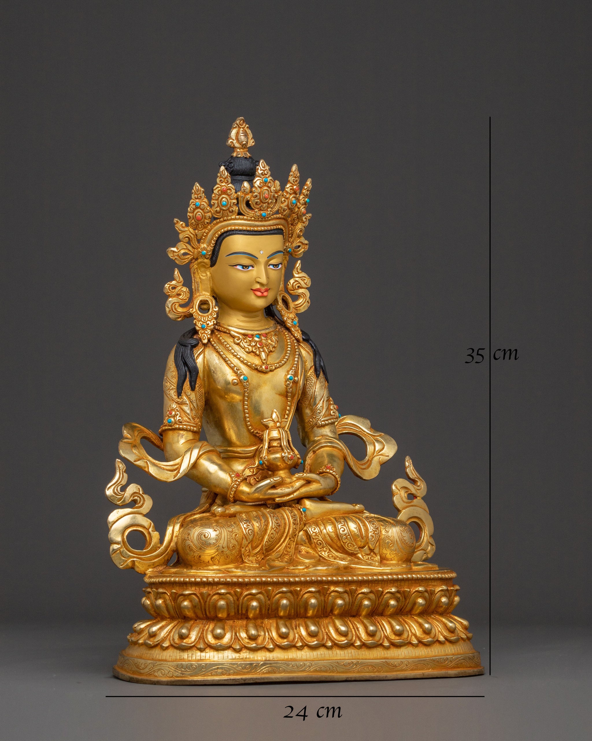 Behold the artistry of Nepal's finest craftspeople in this luminous Amitayus statue, a beacon of longevity and divine grace. Standing 35 cm tall with a commanding 24 cm base, this handcrafted treasure weighs a substantial 3.91 kg—a testament to its quality and presence. The copper foundation gleams beneath three sumptuous coats of 24K gold, while meticulously carved details emerge in striking relief, creating an almost lifelike three-dimensional quality. Each engraved line tells a story of spiritual blessing and protection, transforming your sacred space into a sanctuary of peace. This is not merely decoration; it's an invitation to embrace the timeless wisdom of Buddhist tradition and the promise of enduring spiritual merit.