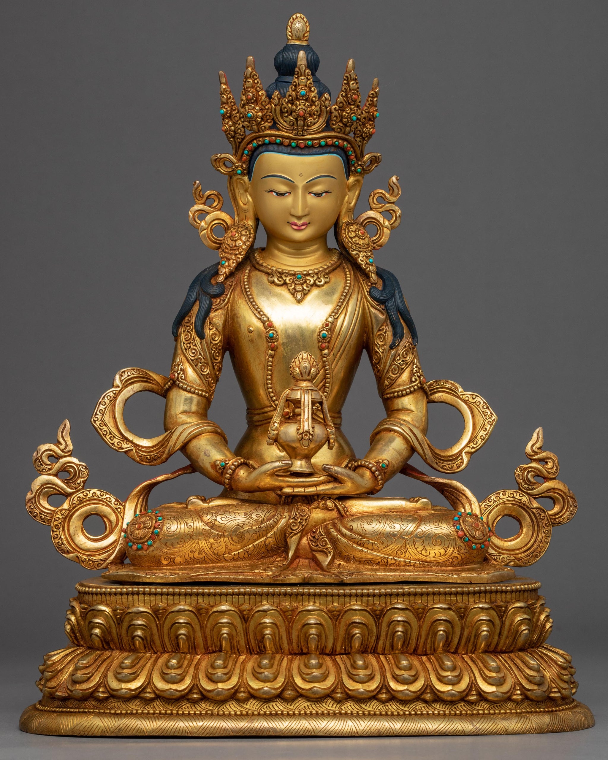 Amitayus Bodhisattva Statue, The buddha of long life, is one of the manifestations of Amitabha who is depicted seated upon a moon disc lotus holding a moon disc lotus while holding a vase that contains the nectar of immortality. Crafted with a pure copper body and gilded with 24k genuine gold. The statue is decorated with numerous body ornaments and a crown which have been embedded with numerous jewel stones.