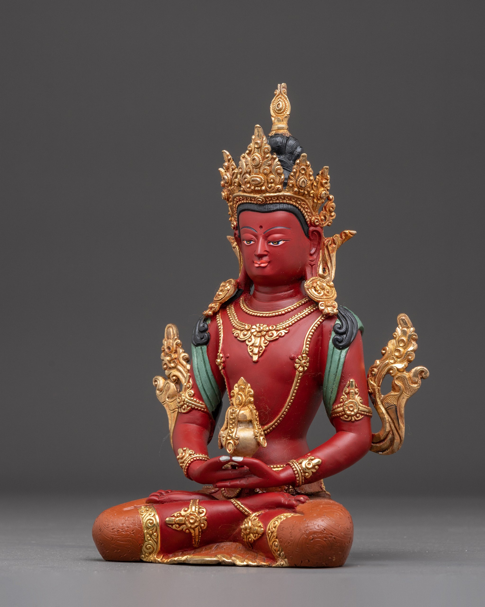 Amitayus is represented sitting in a meditative posture, indicating his vast wisdom and unwavering concentration. His hands are in dhyana mudra, holding a kalasha, a holy vase filled with the nectar of immortality, representing his function as the giver of long life and energy. His calm demeanor radiates compassion and inner peace, Inspiring practitioners to practice mindfulness and tranquility.