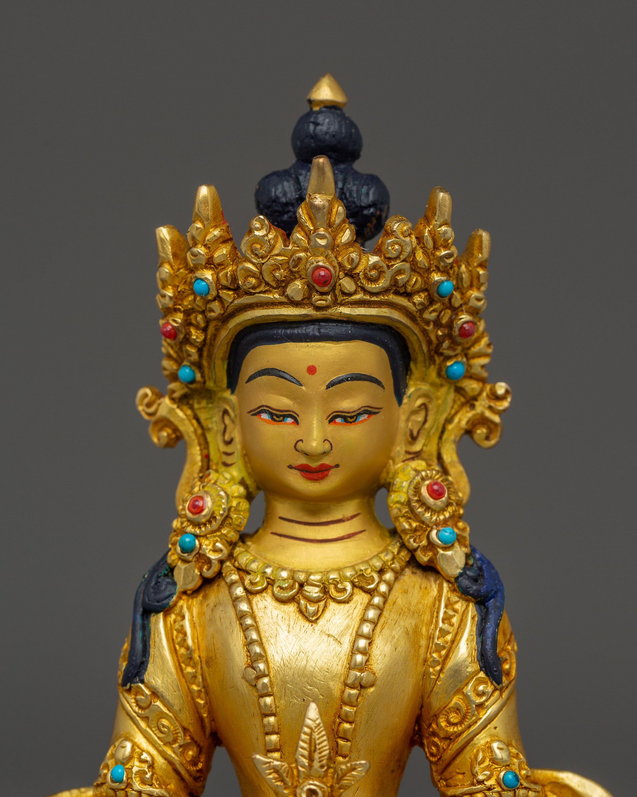This Handmade Amitayus Buddha of Enlightenment and Liberation Statue stands at 6.7” (17cm) in height and 5.1” (13cm) at the base, weighing 0.84 kg. Made from a Copper Body, it is adorned with gemstones, acrylic paintings, and finished with 24K gold gilding. Expertly crafted by skilled Nepali artisans, this piece reflects traditional craftsmanship and makes a refined addition to compact altars, meditation corners, or personal spiritual collections.