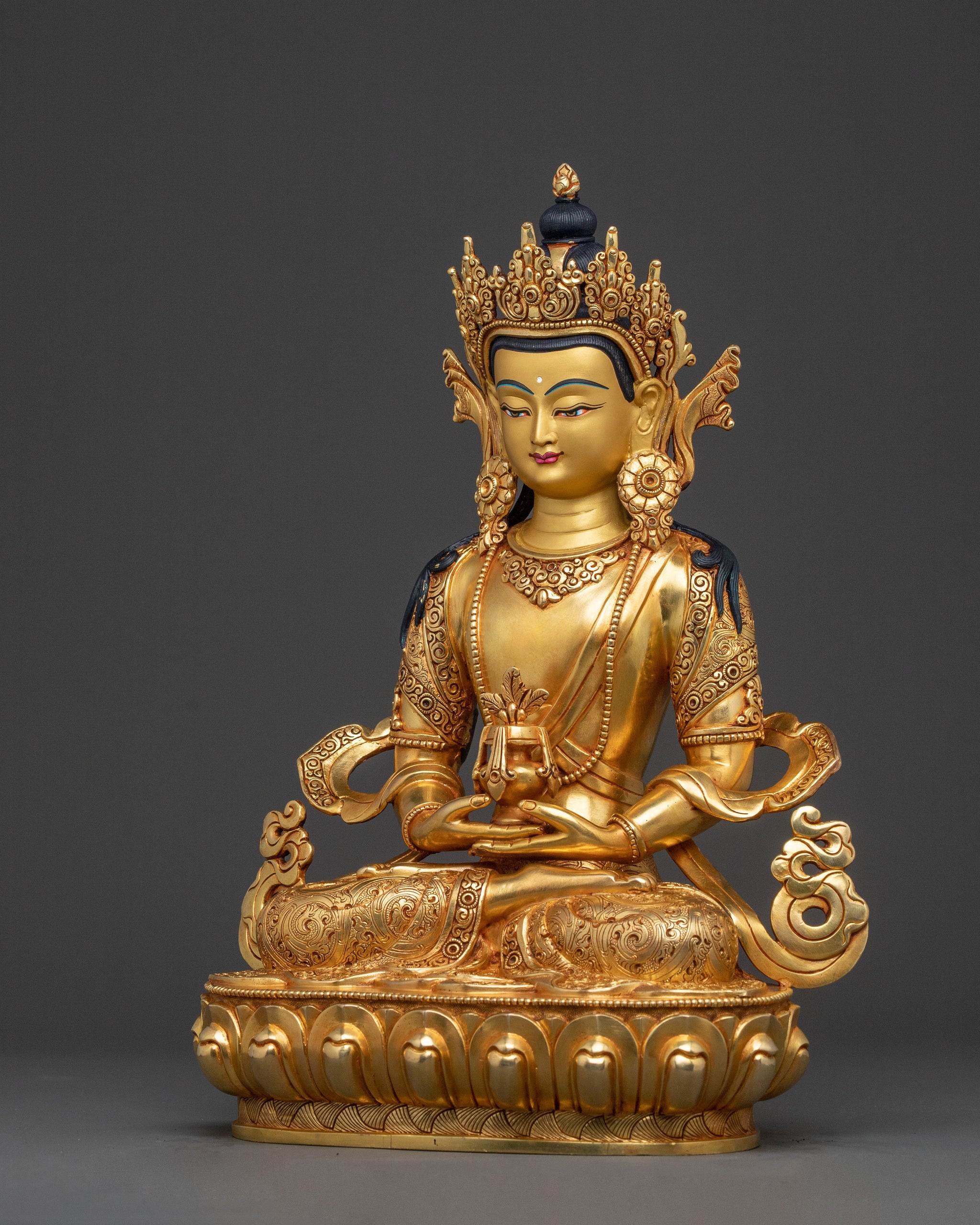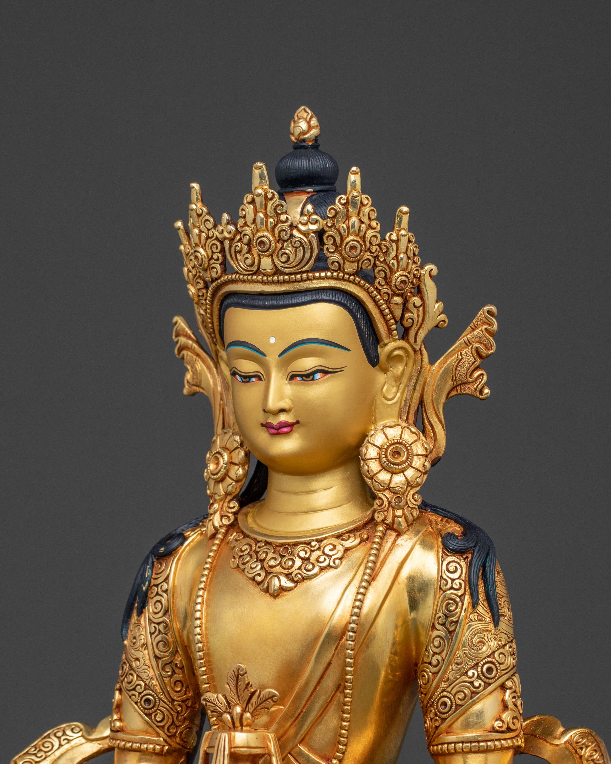 Amitayus, the Buddha of Boundless Life, arises here as a magnificent 24K gold-gilded Amitayus Buddha of Longevity Statue. Handcrafted from copper with acrylic paintings, this 34.5 cm (13.58”) figure rests on a 25 cm (9.84”) base. It weighs 3.64 kg, radiating serene longevity and spiritual grace, making it a revered centerpiece for any sacred space. Covered with a triple layer of 24K gold gilding, it is meticulously carved with deeply engraved carvings that produce a magnificent 3D-like effect, further enhancing its divine and timeless presence.