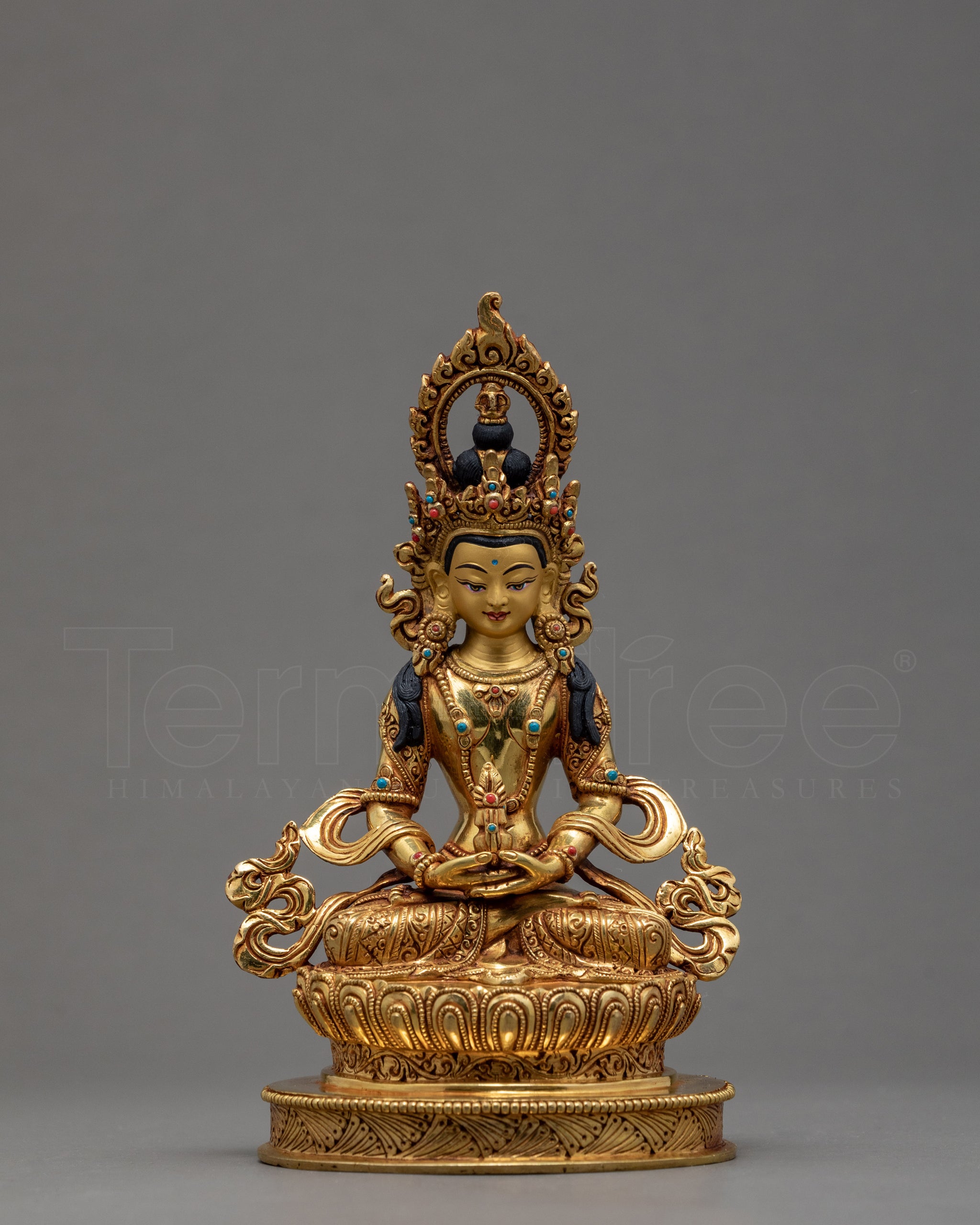 This statue art shows Amitayus Buddha in a seated posture magnificently. This statue is handcrafted in Kathmandu by a Nepali artist in copper and gilded in 24K Gold. Buddhist Deity of Infinite Life is hand-carved in a serene face. He is carrying a long-life vase filled with amrita while sitting in a vajra stance on a lotus seat. He is one of three great long-life deities, and he is one of the most important. He is adorned with exquisitely crafted valuable ornaments. Om Amarani Jiwantiye Soha is his mantra.