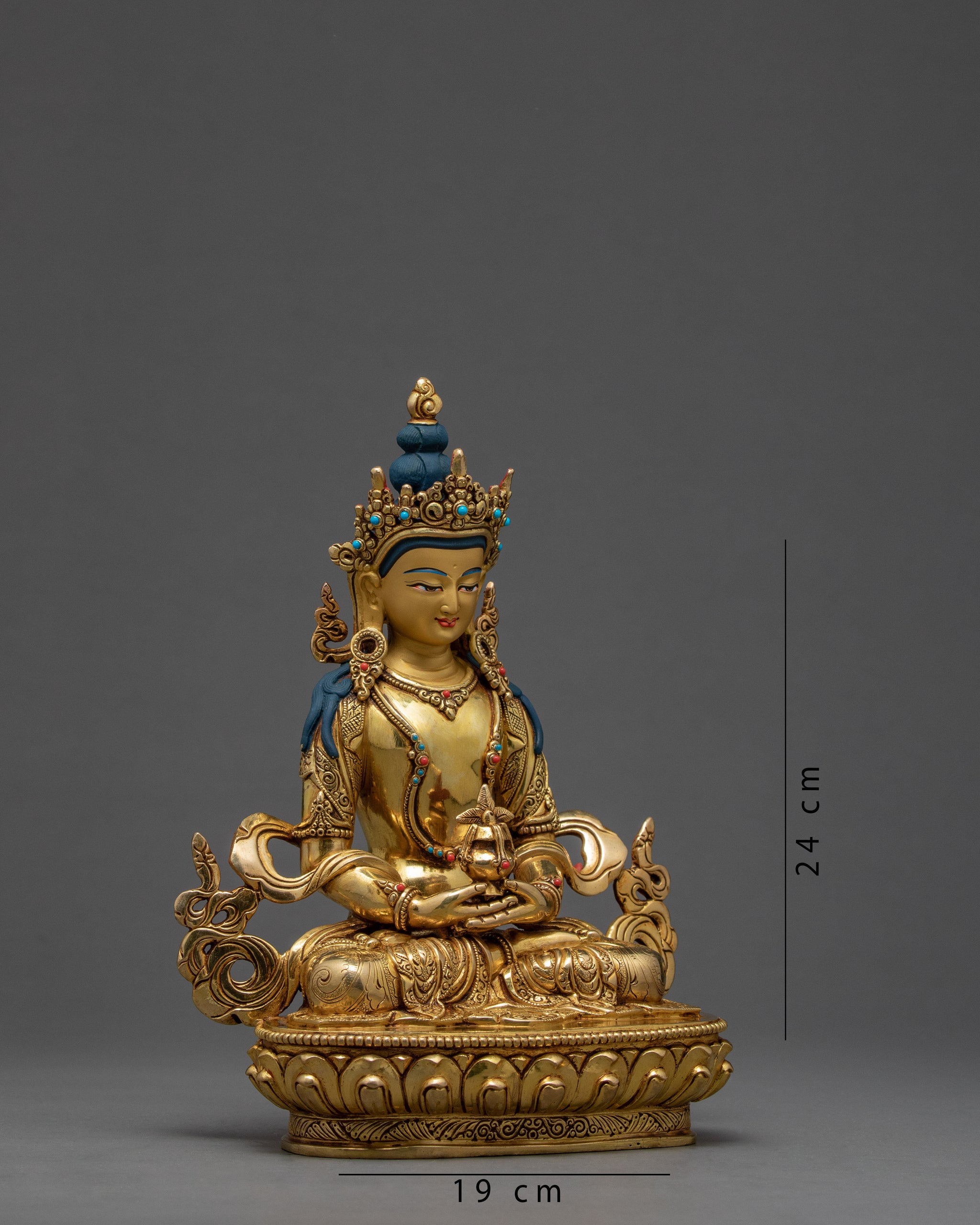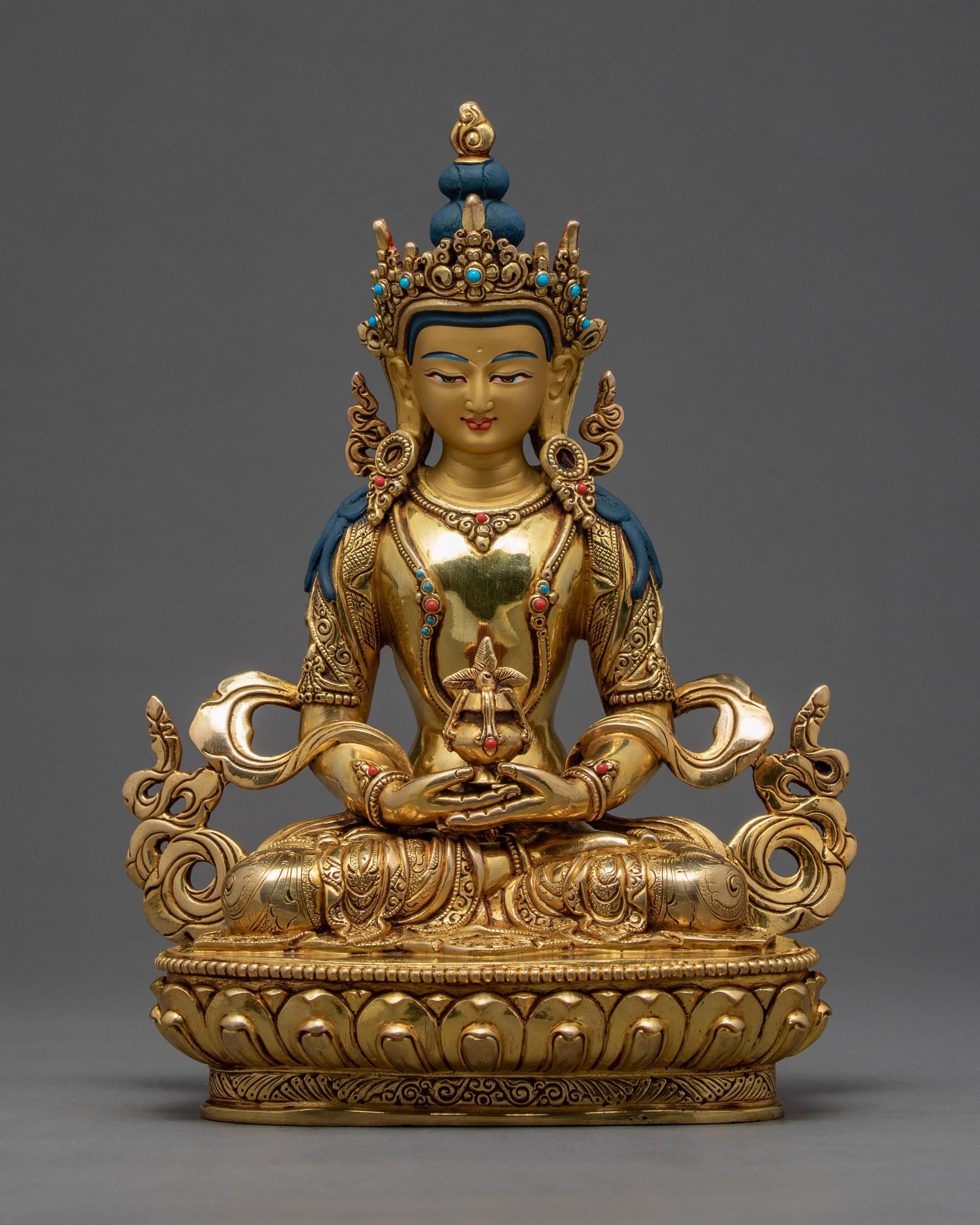 The Bodhisattva Amitayus Statue symbolizes the Buddha of Long Life. The vase he holds in his lap, which contains amrita, the nectar of immortality, symbolizes longevity. Amitayus is an incarnation of Amitabha, a buddha who claimed to be able to transfer his followers to the Pure Land when they die. They are liberated from the samsara cycle and reach enlightenment.