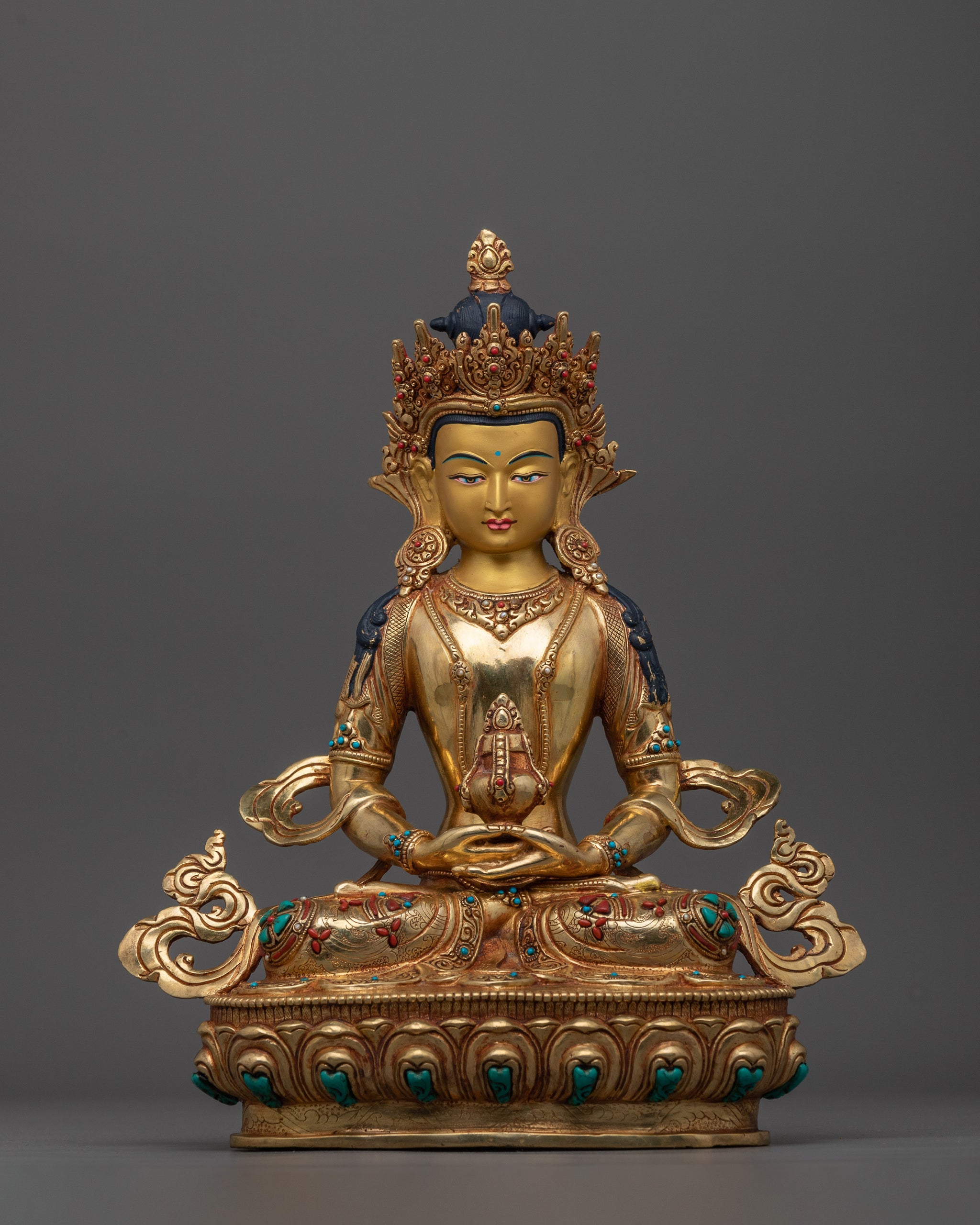 This magnificent Amitayus Buddhist Sculpture will bring you the blessings of good health and spiritual riches. This statue, measuring 13.0" (Height) x 10.6" (Base) and weighs 3.55 kg, is crafted of copper, gilded in 24K gold, and decorated with gold and acrylic paints. Handcrafted by renowned Nepalese artisans, this sculpture embodies the Himalayan region's rich traditions and creative expertise, making it an inspirational centerpiece for altars, meditation rooms, or holy decor.