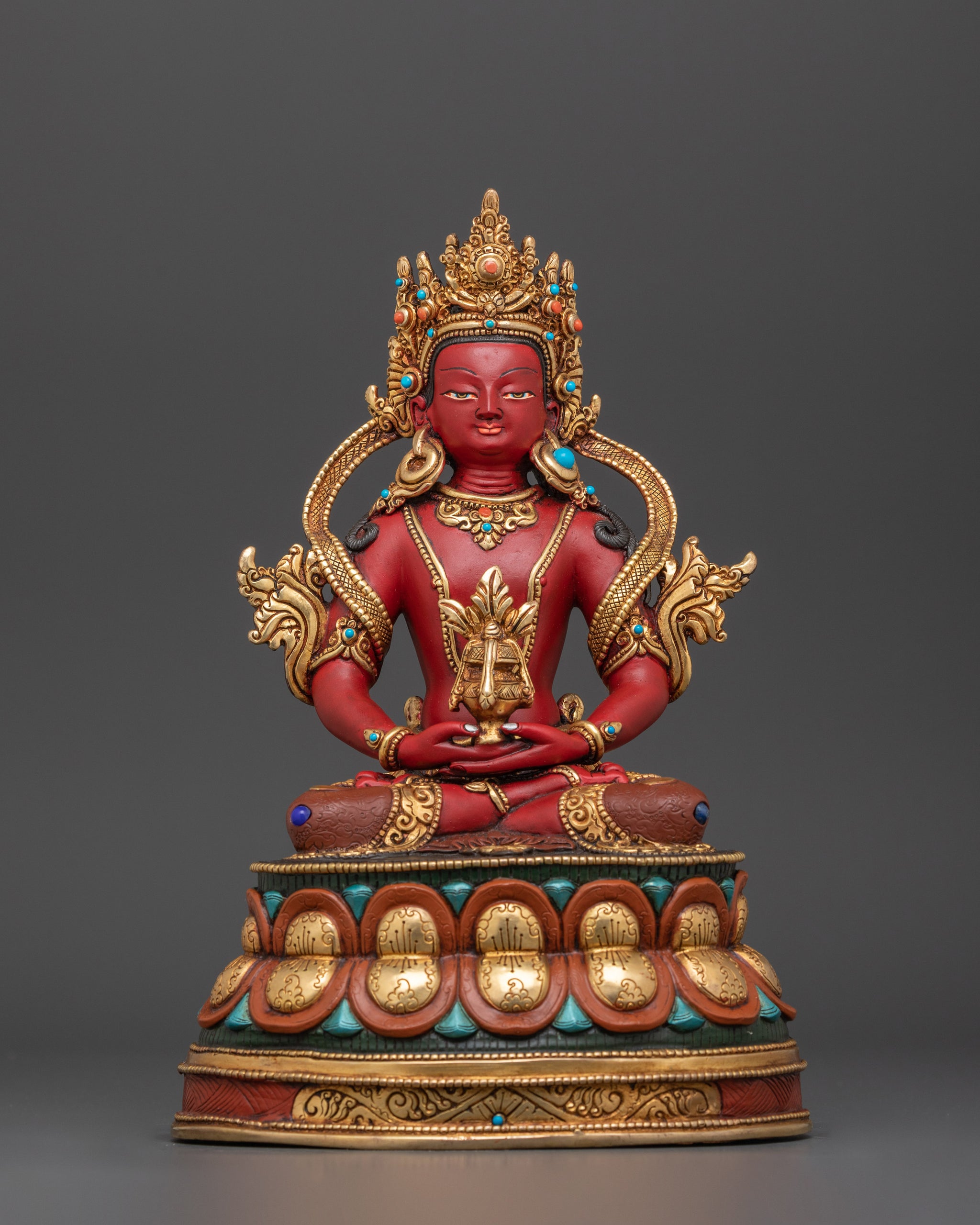 Amitayus, of the Aparimitagunasamchaya or Amitavyhavat pure world, is usually shown in his apparitional buddha form (sambhogakaya), red in color, wearing a crown and jewels, and holding a long-life vase over two hands in a meditation gesture. A Buddha is said to have three bodies in the Mahayana Buddhist tradition: a form body (nirmanakaya), an apparitional body (sambhogakaya), and an ultimate truth body (sambhogakaya) (dharmakaya).
