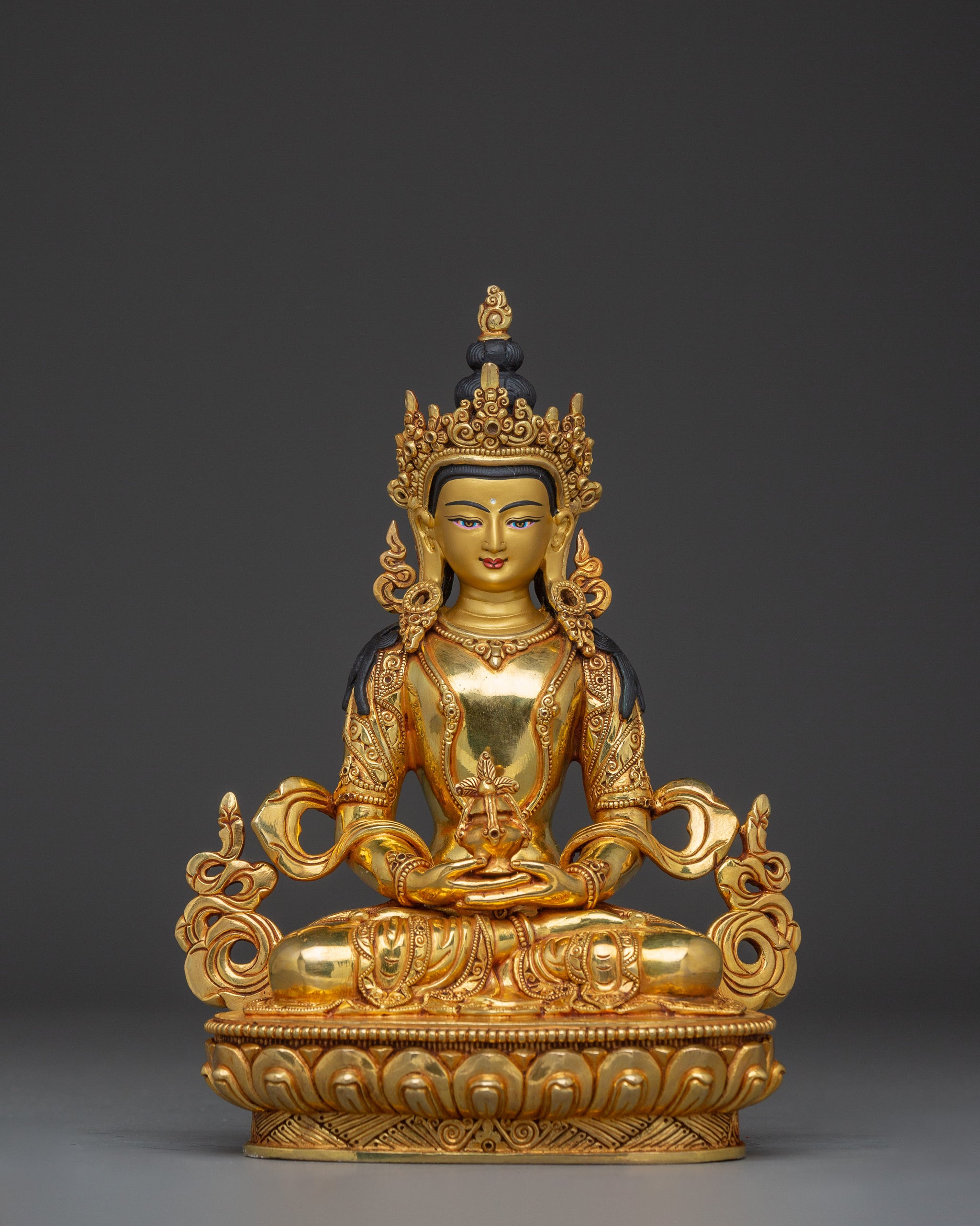 This handcrafted Amitayus golden statue, also known as the Buddha of Infinite Life, weighs 1.84 kg and measures 9.2”/23.5cm in height and 7.3”/18.5cm at the base. It is made of copper, covered with a triple layer of 24K gold gilding, and carved with deeply engraved carvings that produce a magnificent 3D-like effect. This sculpture is handcrafted by expert Nepalese artisans, elegantly symbolizing Himalayan Buddhism's sacred traditions, making it an appropriate addition to altars, meditation places, or sacred collections.