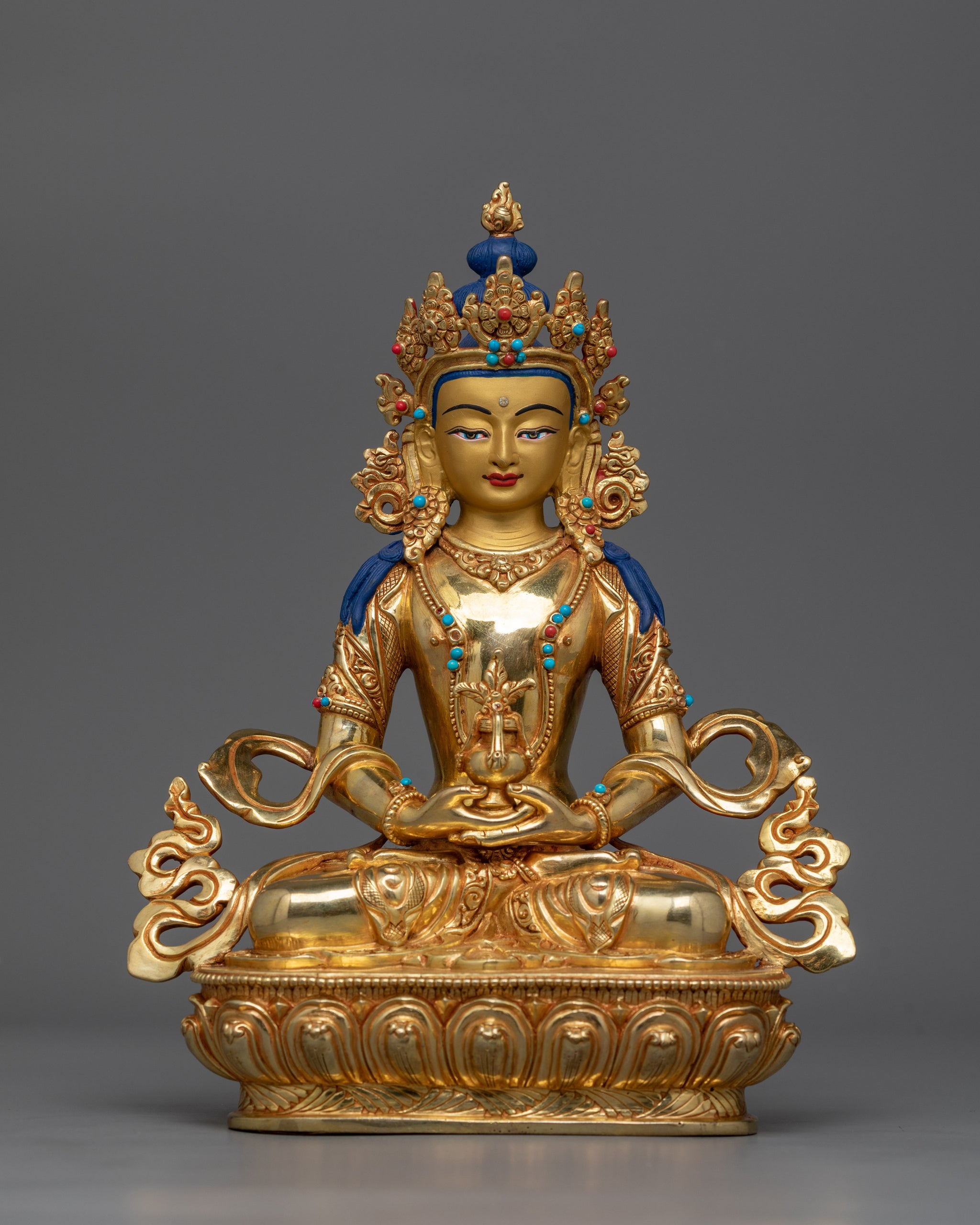 The Amitayus Handcrafted Small Statue is 22.5 cm tall and precisely crafted from high-quality copper. This statue's beautiful 24K gold plating adds to its glowing presence and spiritual importance. Amitayus' peaceful look, portrayed with artistic accuracy, brings a sense of tranquility and longevity into any environment. The complex patterns on his clothing, as well as the beautiful lotus seat he sits on, are highlighted by the meticulous carving.