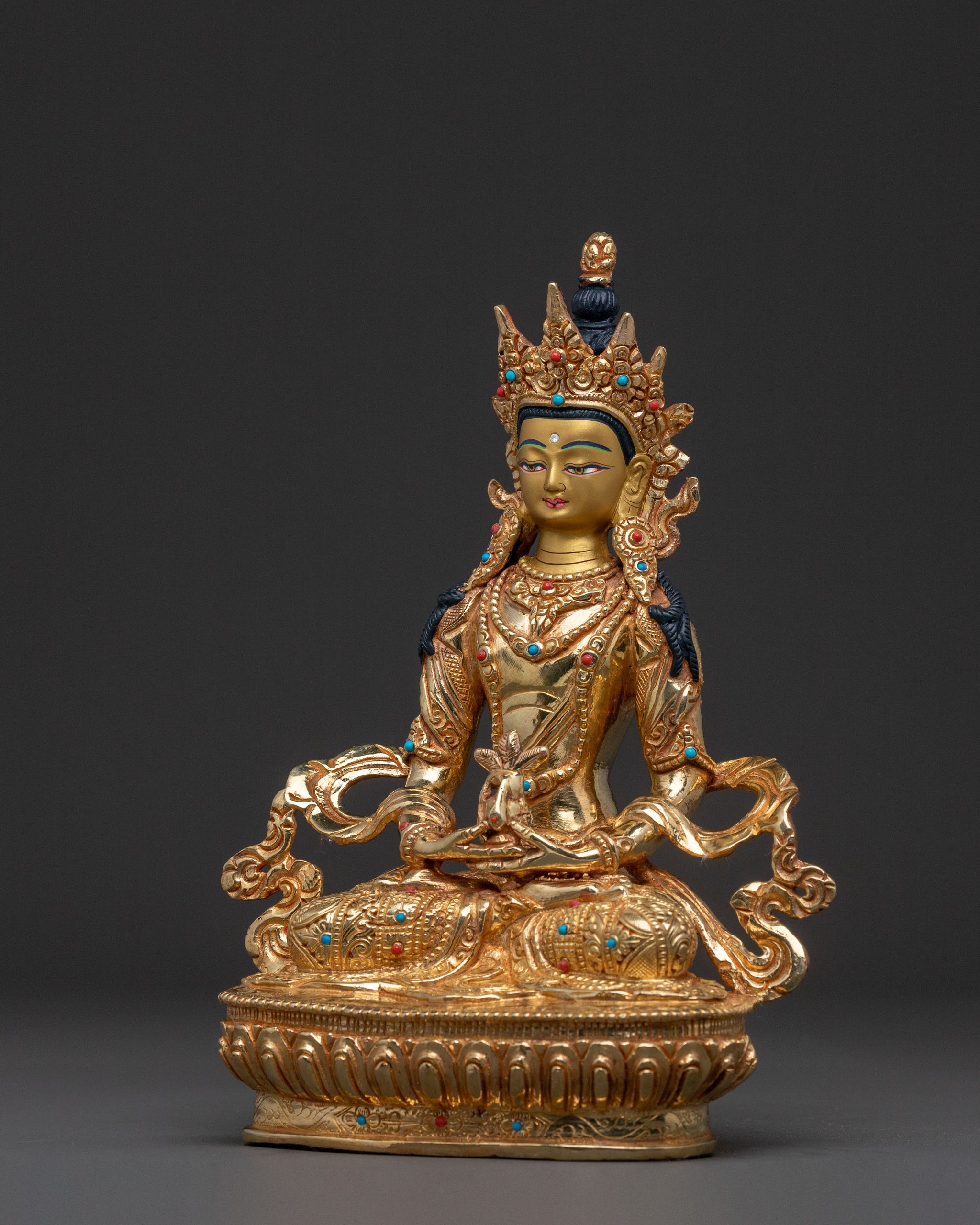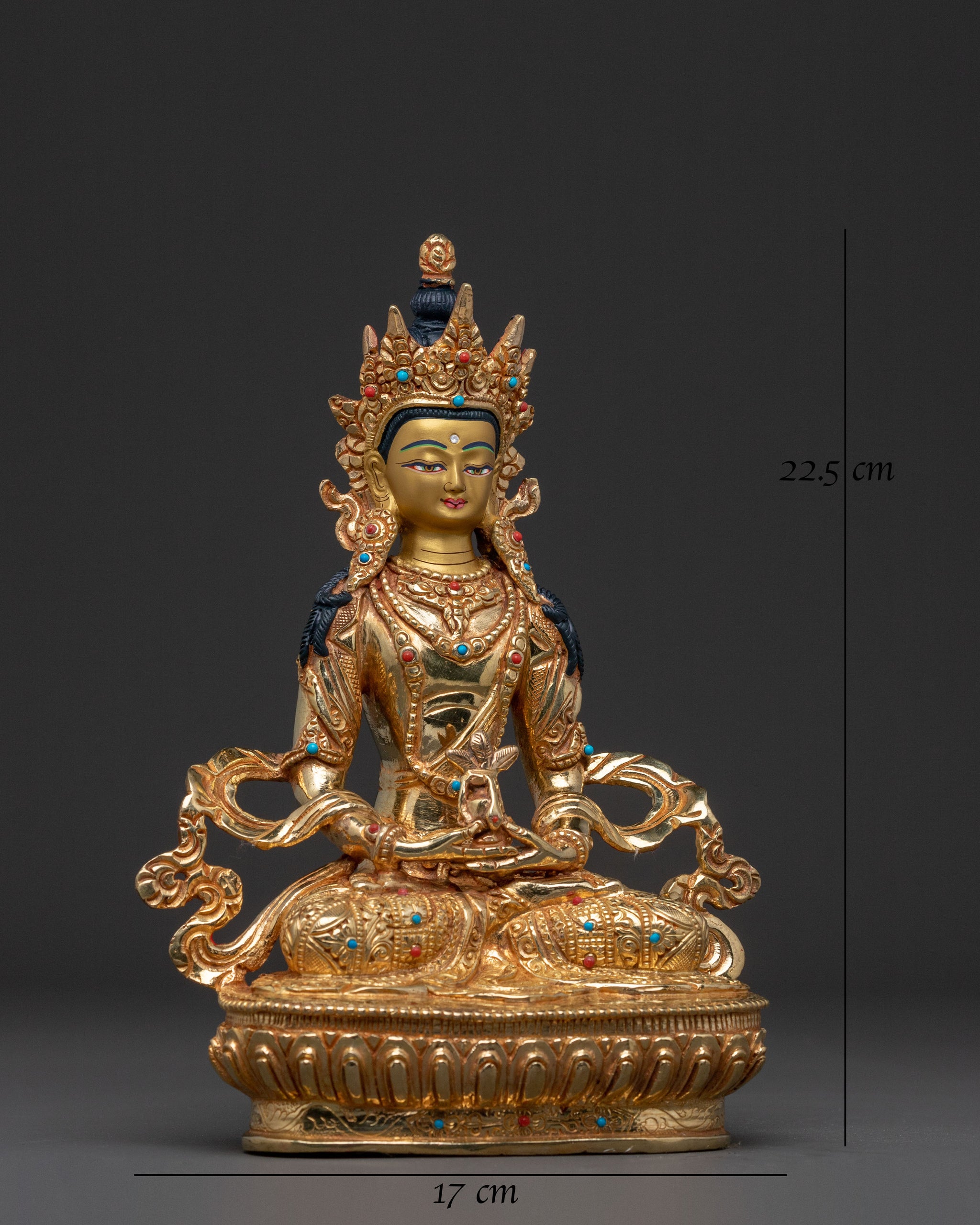 Behold the radiant Amitayus Himalayan handcrafted statue, a profound symbol of longevity and merit. Standing at 8.86 inches (22.5 cm) tall with a base measuring 6.69 inches (17 cm), this exquisite sculpture is crafted from a robust copper body and radiates a serene presence. Masterfully gilded in lustrous 24K gold, accented with delicate acrylic paintings and sparkling gemstones, it creates a truly sacred piece of Buddhist art. Covered with a triple layer of 24K gold gilding and carved with deeply engraved details, this statue produces a magnificent 3D-like effect, weighing 1.36 kg and embodying both beauty and spiritual depth.
