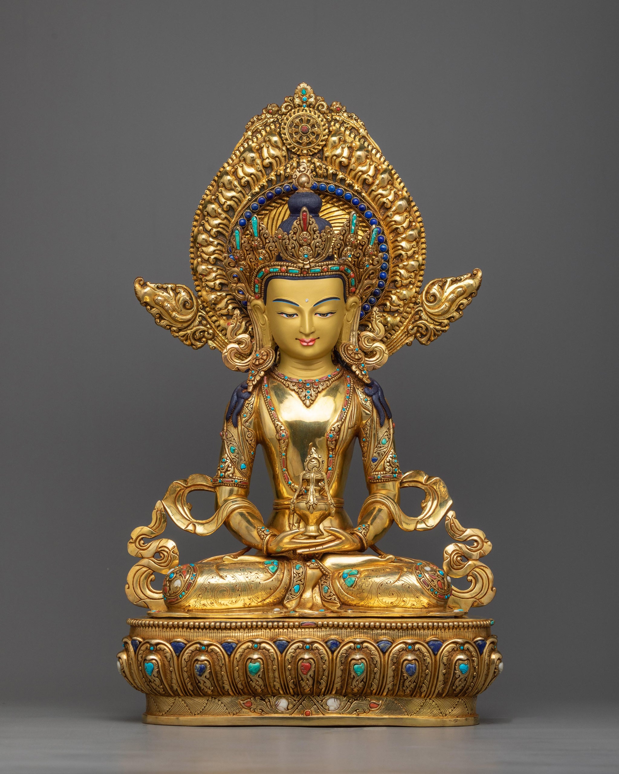 The magnificent Amitayus Long Life Bodhisattva - Premium statue will elevate your spiritual journey. This remarkable work stands 21.2 inches tall, with a 12.5-inch base. This statue, made of copper and embellished with exquisite 24K gold gilding, gold, and acrylic paintings, represents the essence of longevity, abundance, and spiritual vigor.