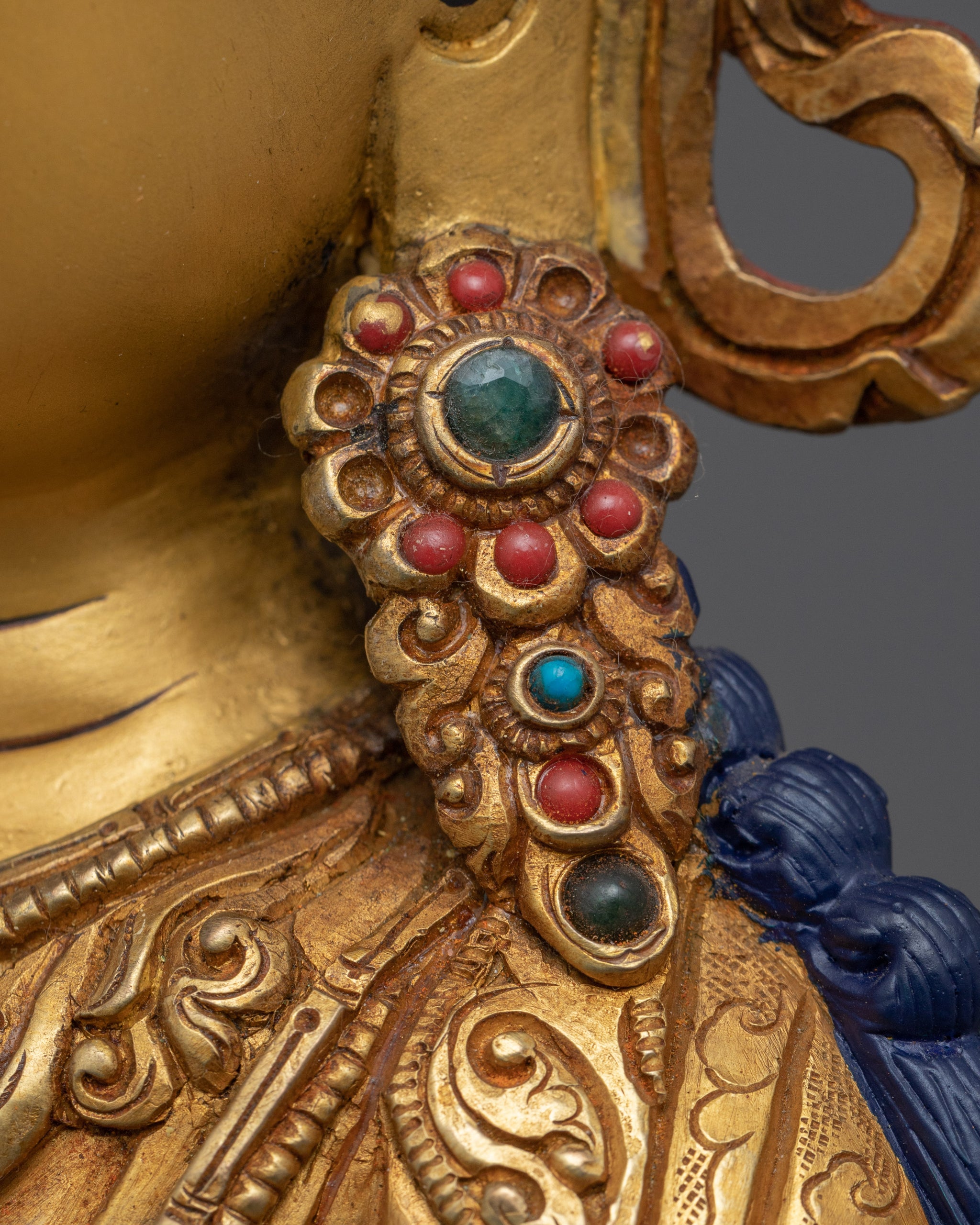 We have meticulously hand-sculpted the Seated Buddha Amitayus Sculpture in a traditional Himalayan style to help practitioners like you practice Amitayus Long Life Sutra. Amitayus means "immeasurable life.". Created with a body made entirely of pure copper and gilded in 24k real gold. The statue features a serenely seated deity holding an alms bowl in his hands while perched atop a moon disc lotus seat. This figurine can be used for various Buddhist rituals as well as daily exercises like yoga and meditation. We can assure you that the statue was made with only the best materials, which will keep it looking great for a long time.