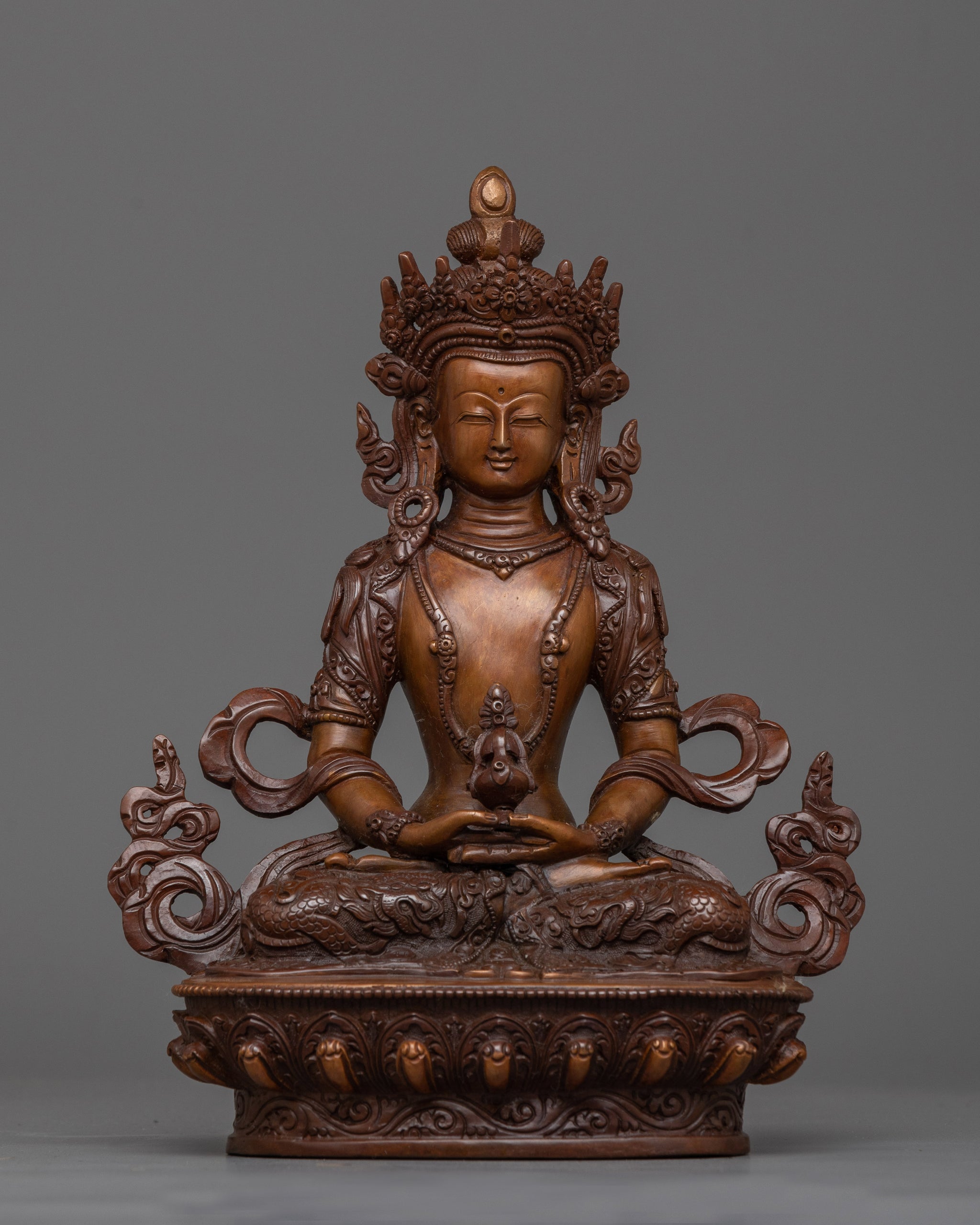This statue of Amitayus represents enduring life and spiritual wisdom and is more than just a decorative item. Its intricate dragon graphic on the robes and oxidized copper finish enhances both its spiritual meaning and artistic appeal, making it a valuable addition to any area looking for a little history and serenity.