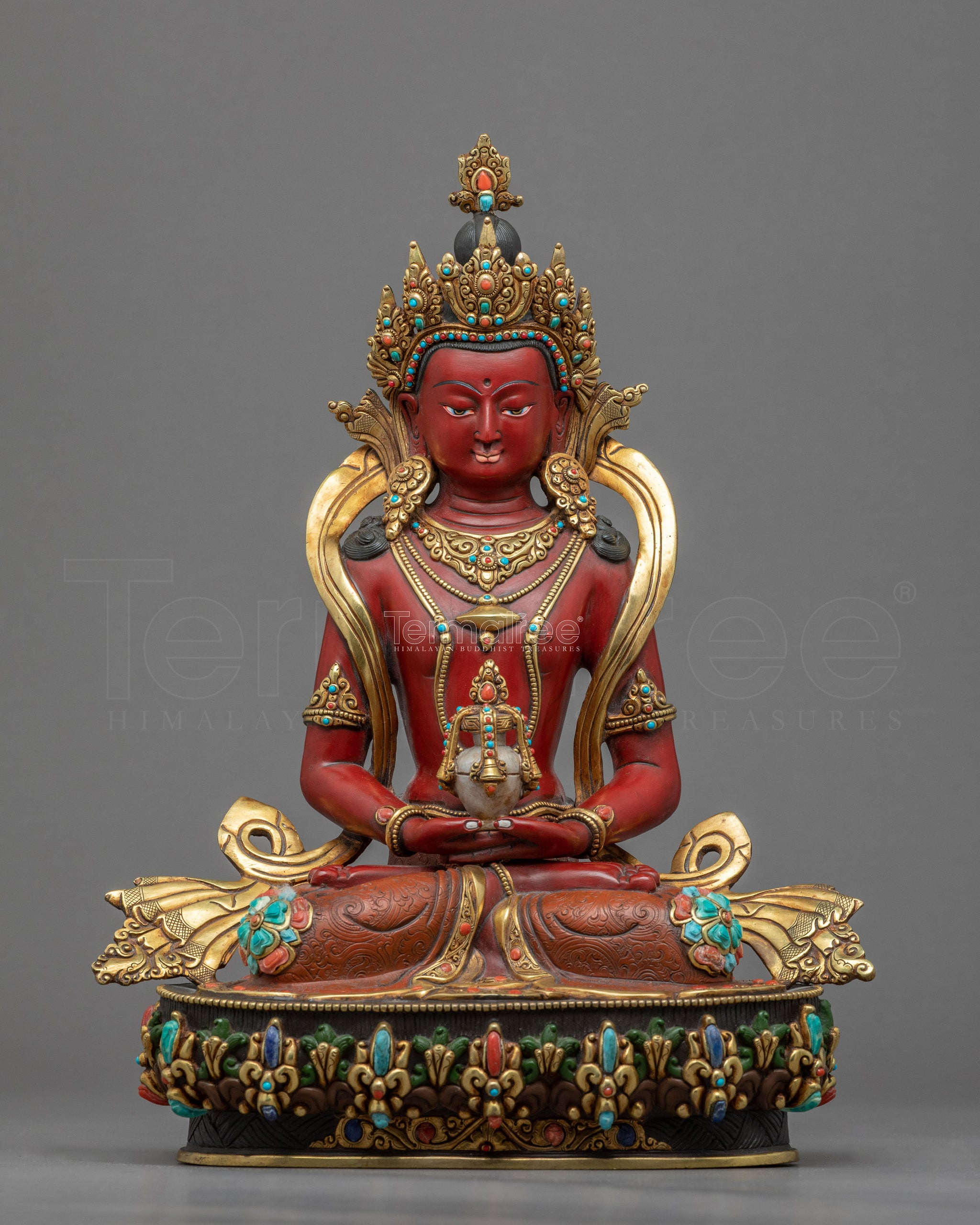 We used traditional Nepalese Himalayan art to craft the Amitayus Sadhana Sculpture. This traditional Buddhist sculpture was molded using methods passed down through the generations of our forefathers. Amitayus Statue is hand-made with a copper body delicately painted with acrylic paint and gilded with 24k real gold. We have hand-painted the deity with the red hue of acrylic paint. While the crown, silk scarf, and body ornaments had visible gold gilding. Amitayus is seated on a moon disc lotus seat in dhyana mudra, holding a vase. The crown, body ornaments, vase, robe, and lotus seat are adorned with precious gemstones. We used a hammer and small chisels to hand-carve the intricate design patterns. To do delicate carvings, artists must have decades of experience as they have to create intricate design patterns on a small surface area.