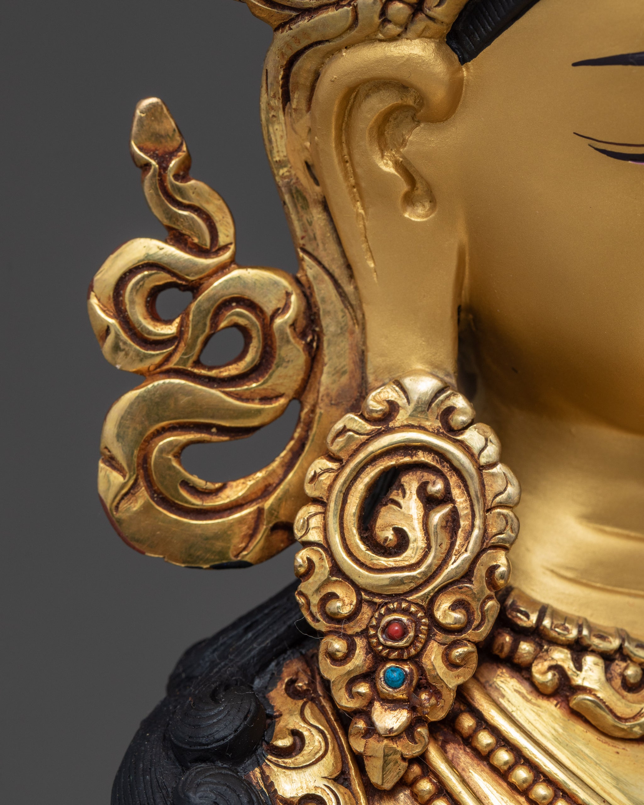 We have traditionally made this Bodhisattva Amitayus statue by carving with hand. The design of the crown is embellished and turquoise with precious gems and genuine 24k gold. The artist of Kathmandu valley has beautifully sculpted and adorned the buddha statue with valuable jewels and stones. He is seated atop a moon disc lotus seat with a calm and serene expression. He holds the vase that contains amrita, the nectar of immortality with both hands.